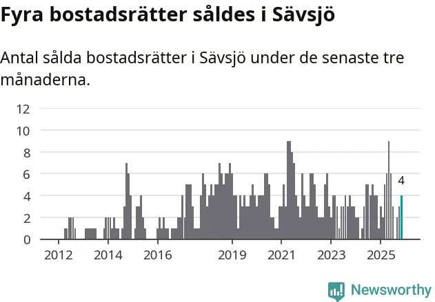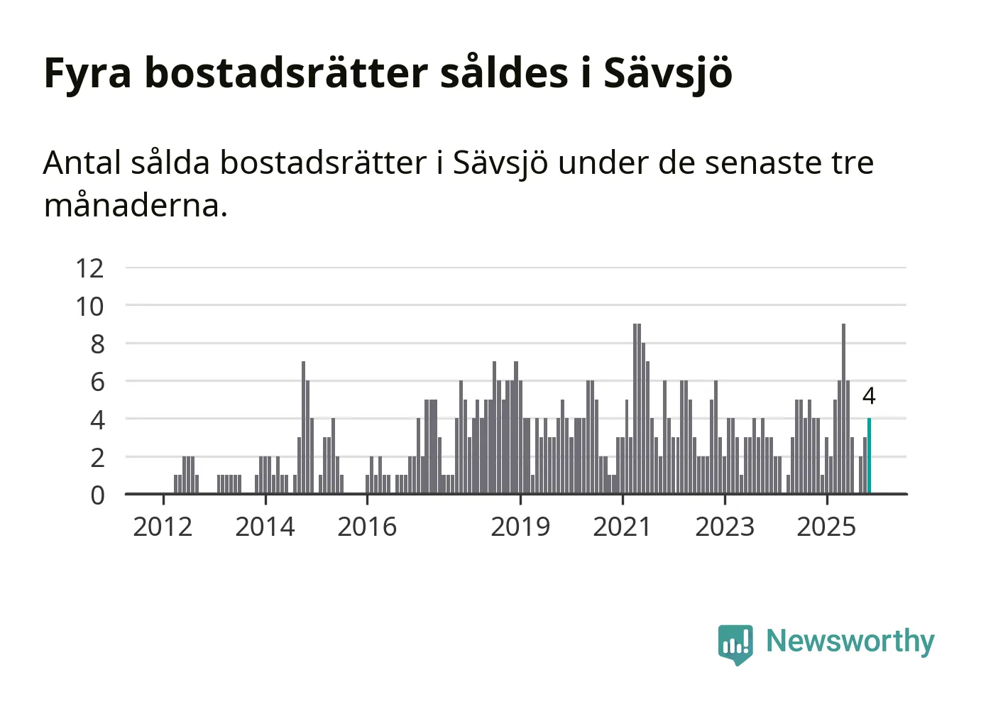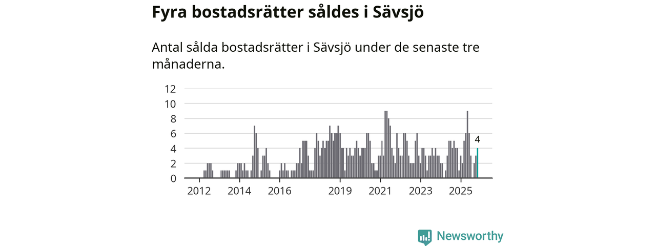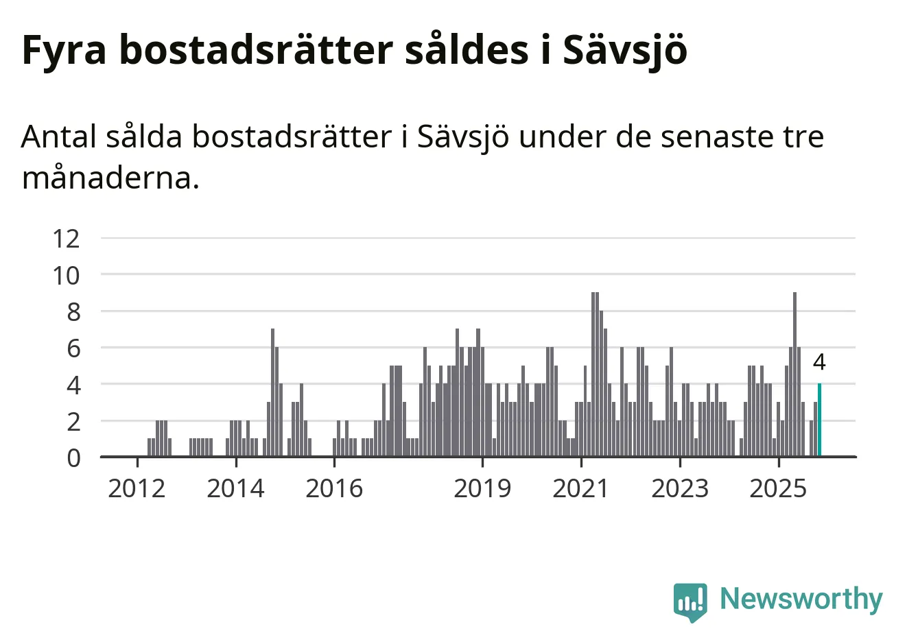 Mellan september och november gjordes sammanlagt fyra affärer med bostadsrätter i Sävsjö kommun. Det är lika många affärer som vid motsvarande tid i fjol.