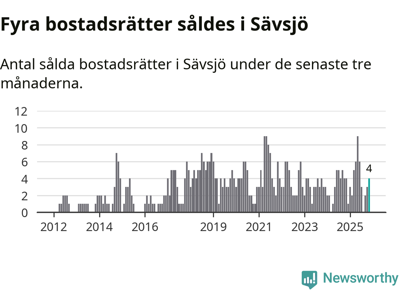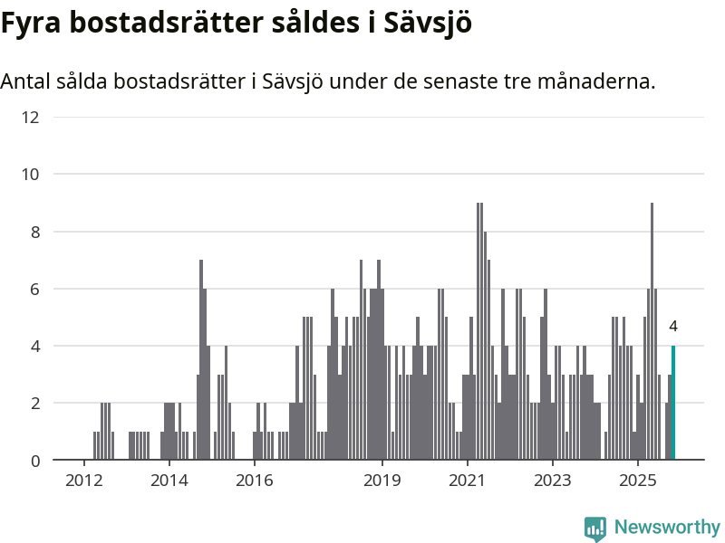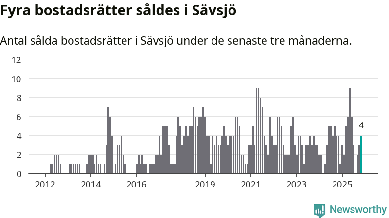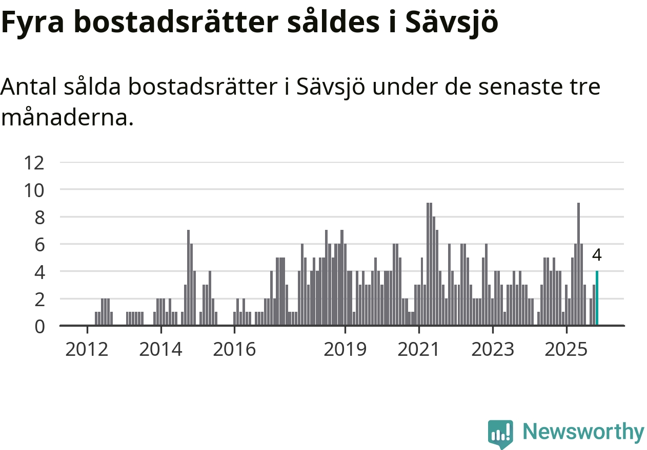 Mellan september och november gjordes sammanlagt fyra affärer med bostadsrätter i Sävsjö kommun. Det är lika många affärer som vid motsvarande tid i fjol.