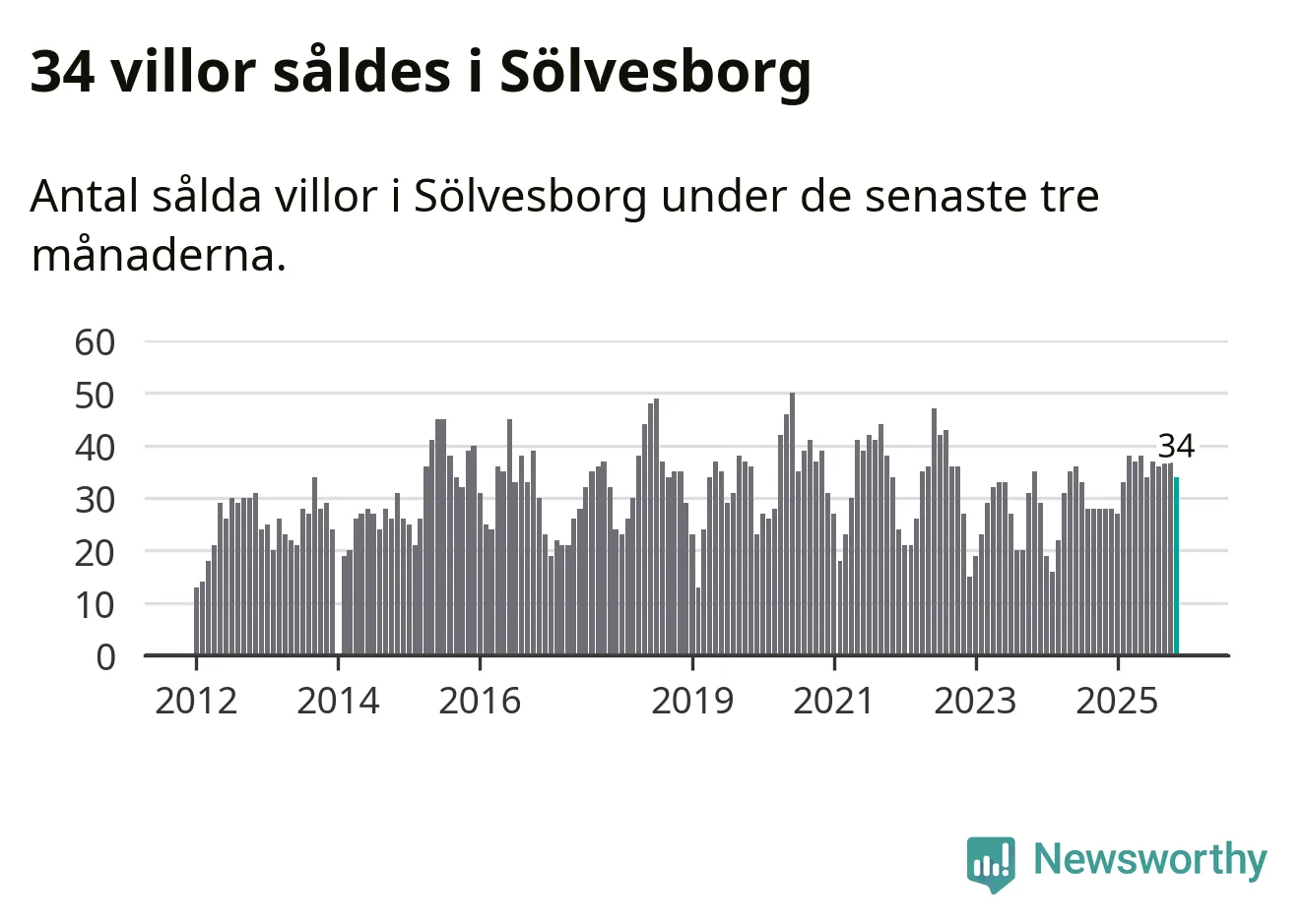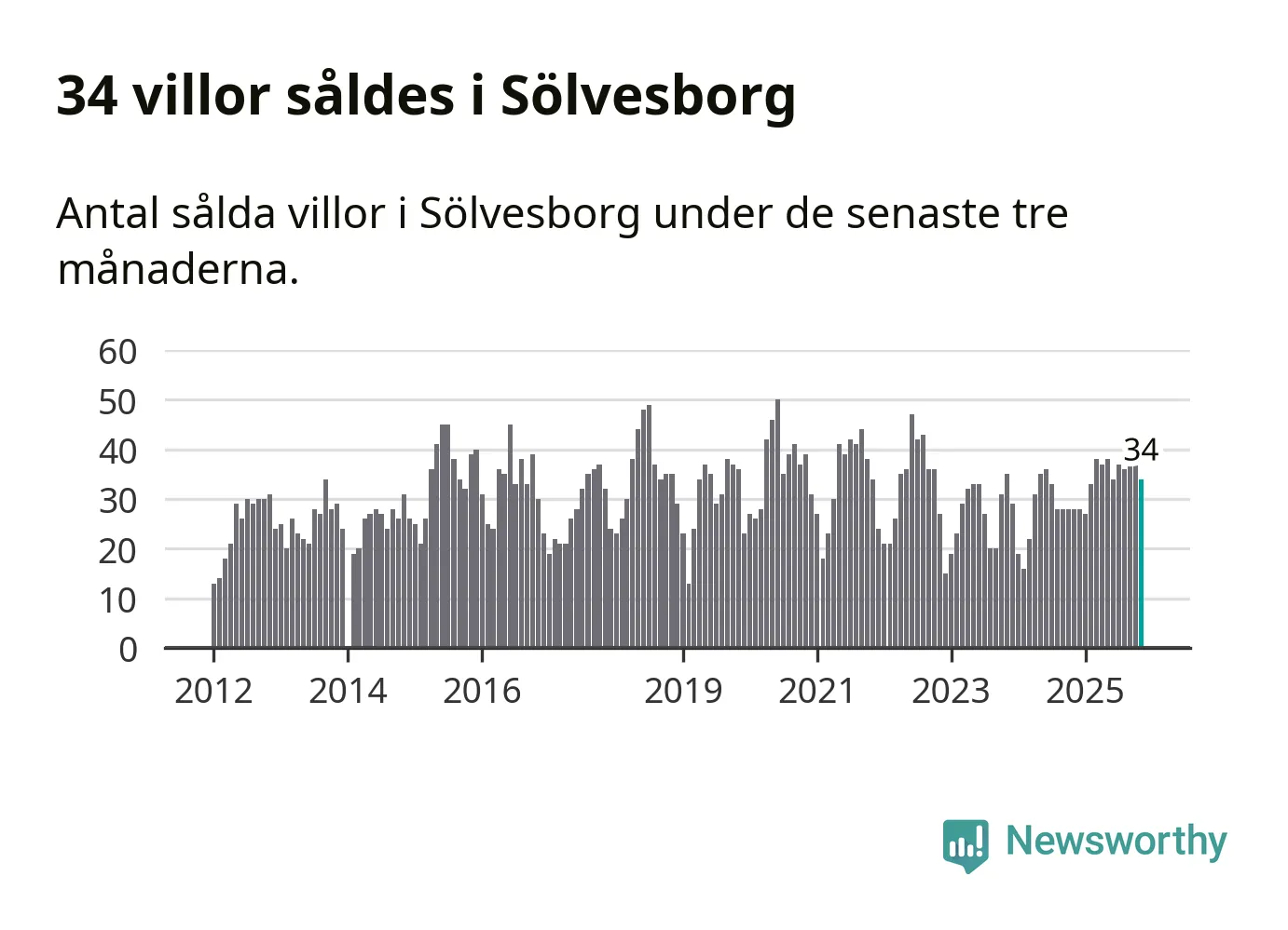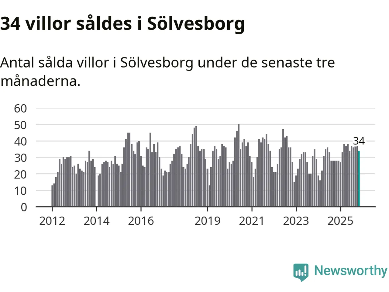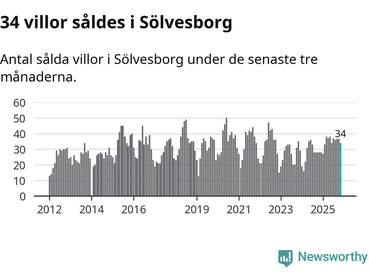 Mellan september och november gjordes sammanlagt 34 affärer med villor i Sölvesborgs kommun. Det kan jämföras med 28 vid motsvarande tid i fjol.