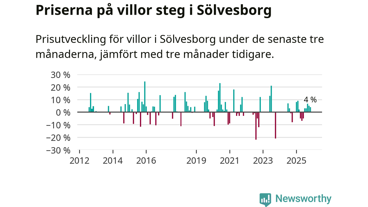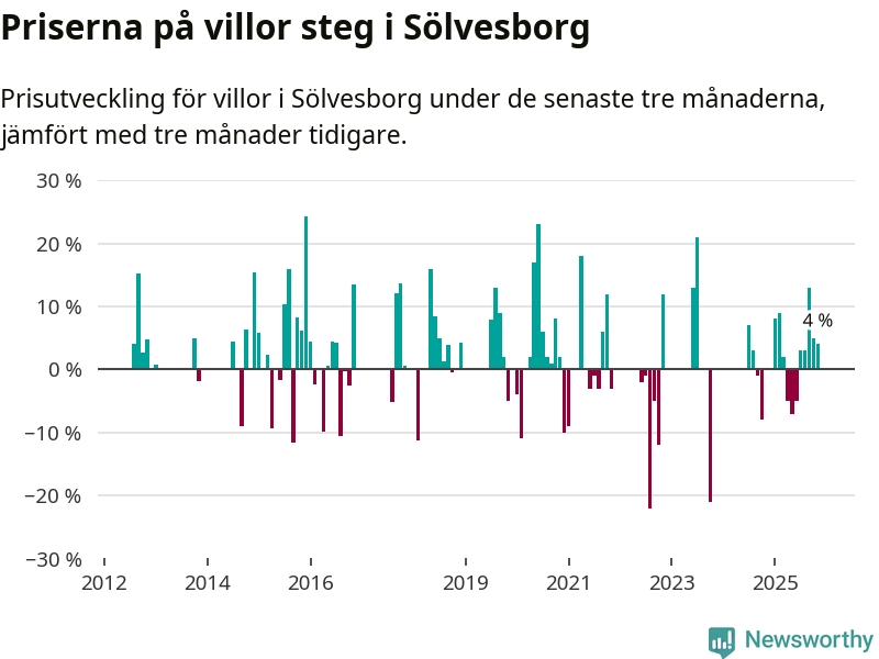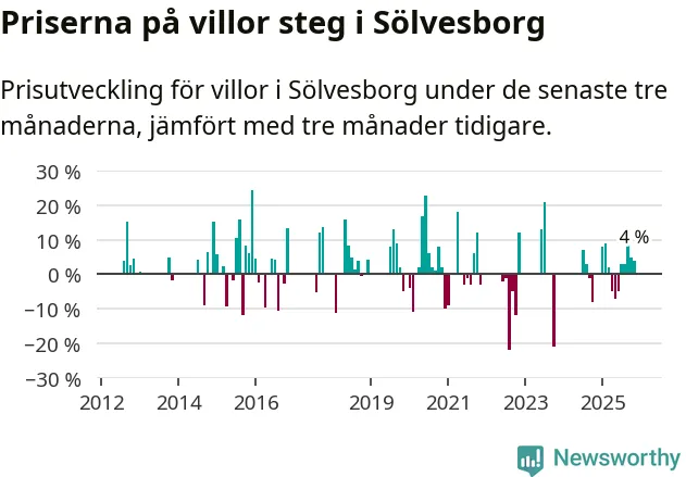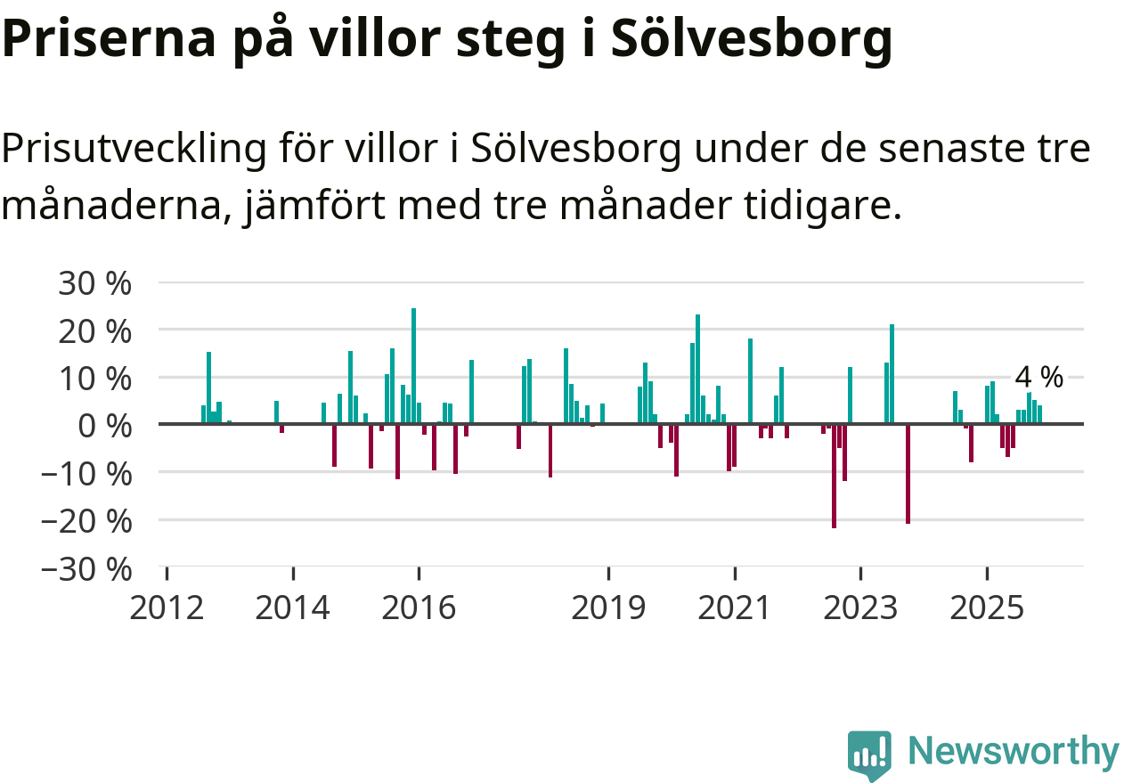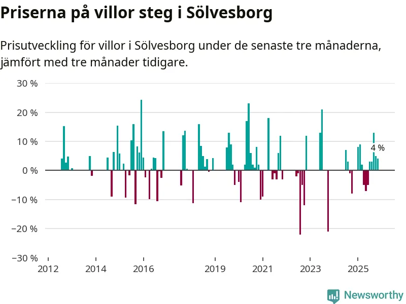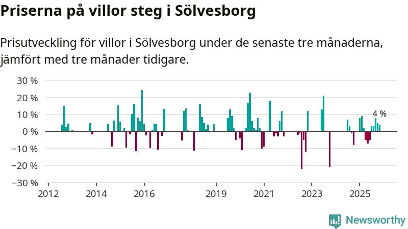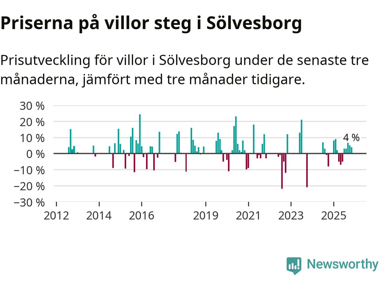 Statistiken visar även på en kännbar prisuppgång i Sölvesborgs kommun. Medelpriset på försäljningarna av villor i kommunen var 4 procent högre än för tre månader sedan. Även i hela Blekinge ökar villapriserna. I hela länet noterades en prisuppgång på 1 procent.
