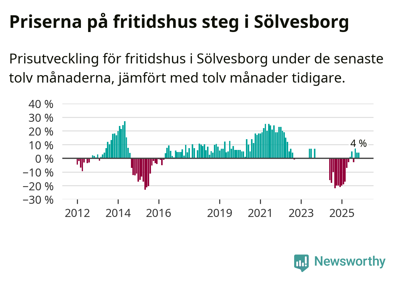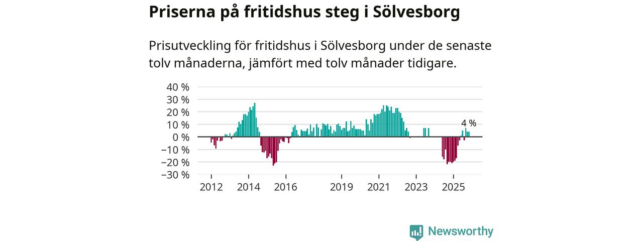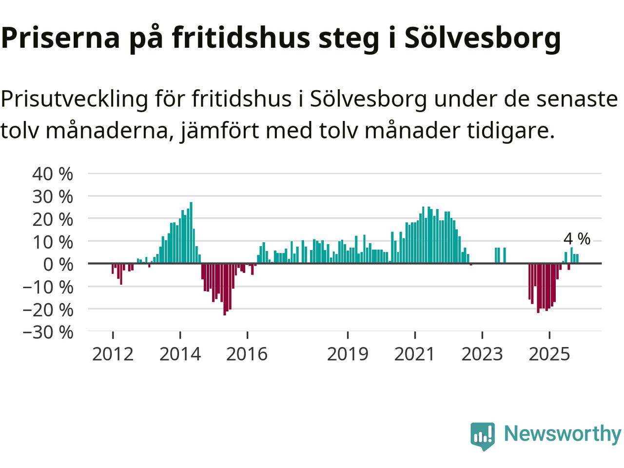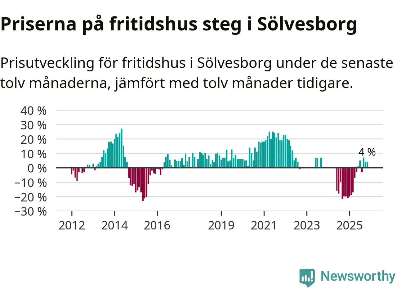 Priserna på fritidshus har gått upp i Sölvesborgs kommun. Medelpriset på försäljningarna under de senaste tolv månaderna visar på en uppgång med 4 procent.