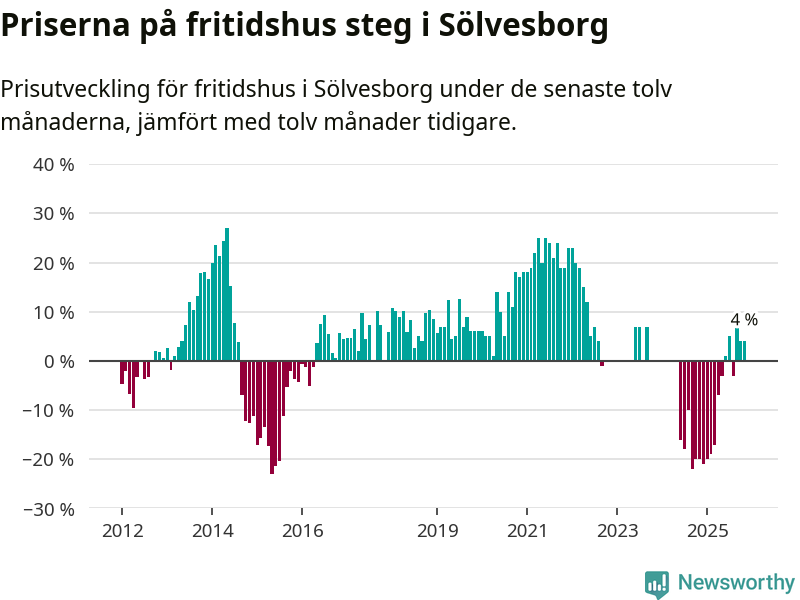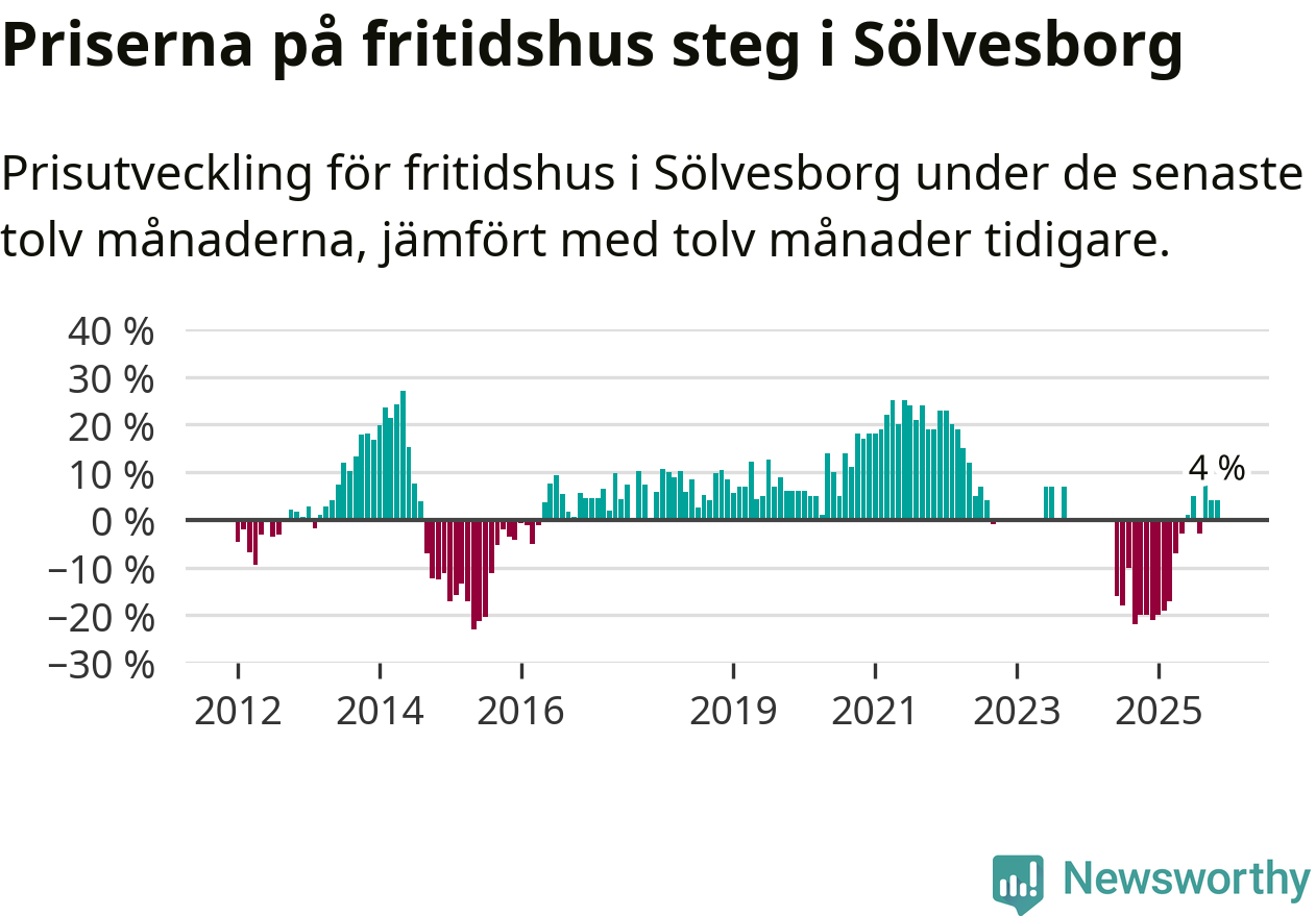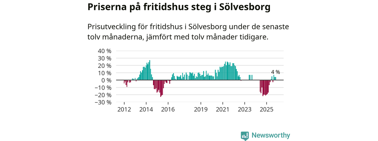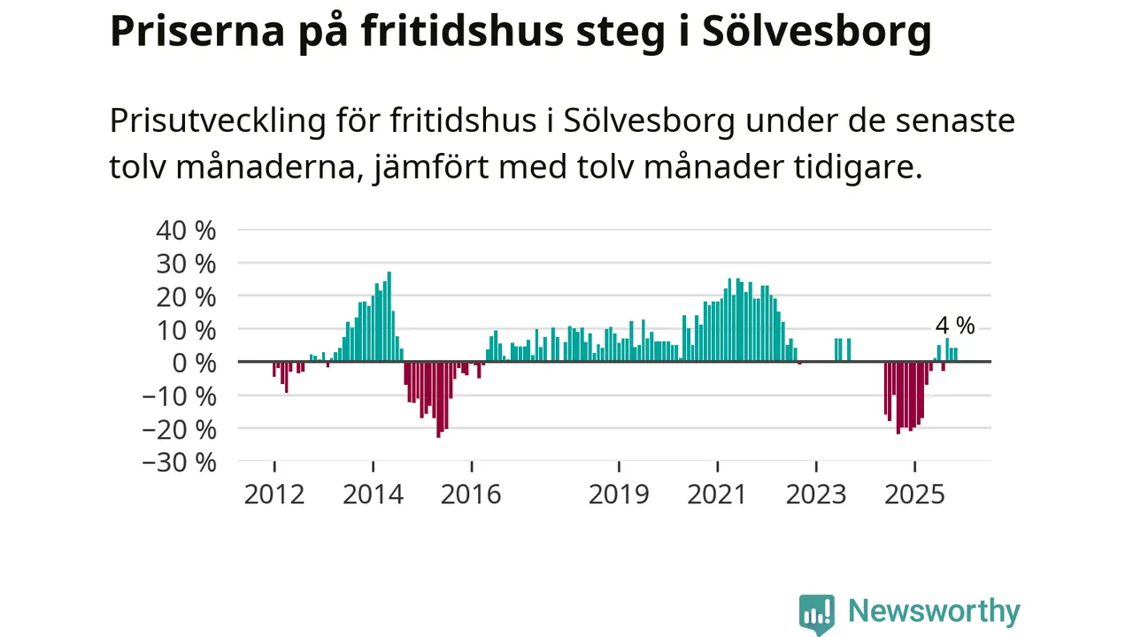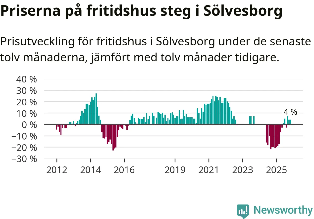 Priserna på fritidshus har gått upp i Sölvesborgs kommun. Medelpriset på försäljningarna under de senaste tolv månaderna visar på en uppgång med 4 procent.