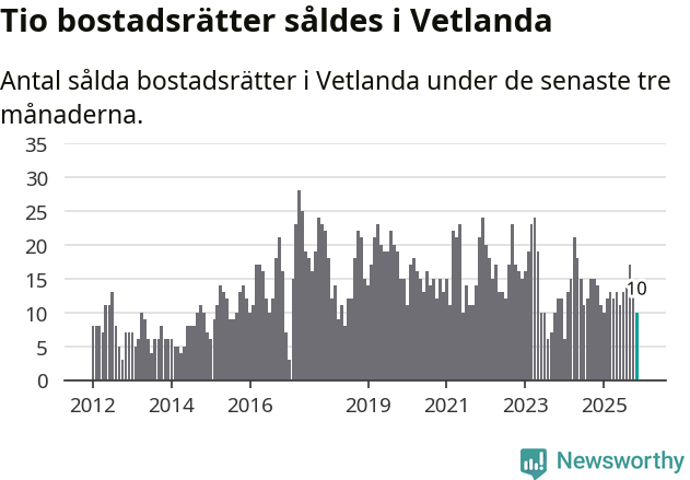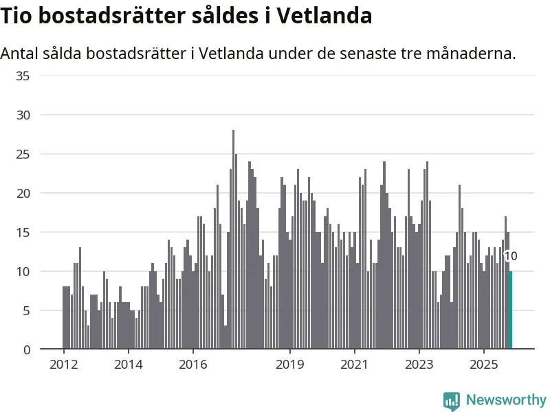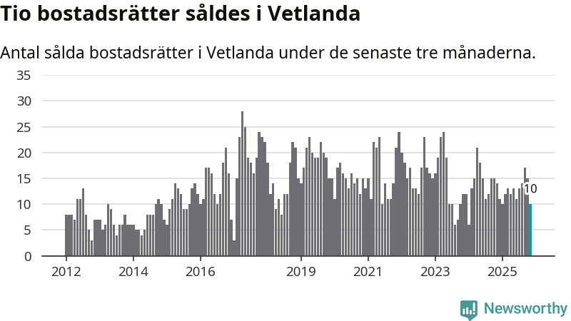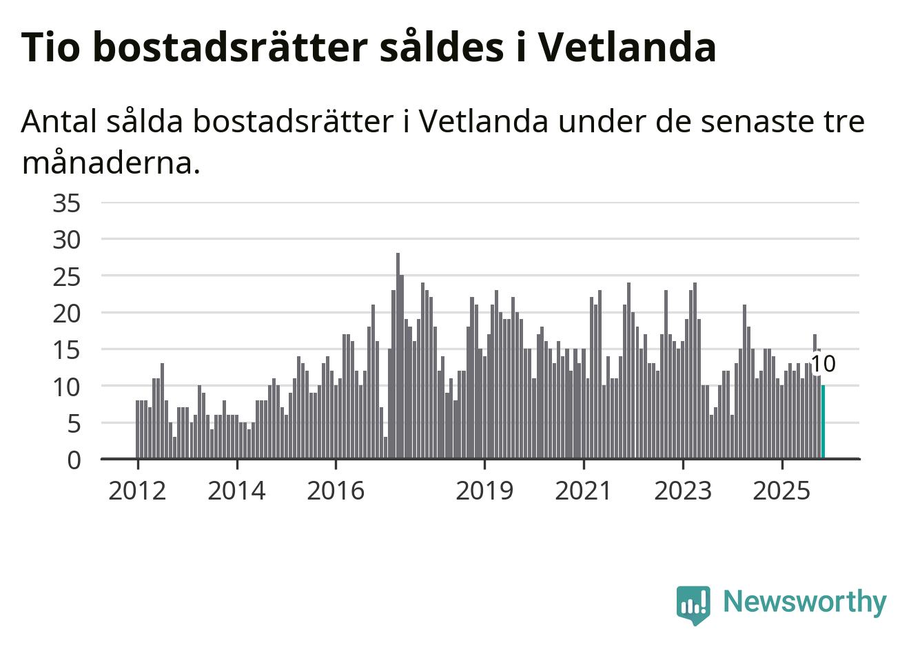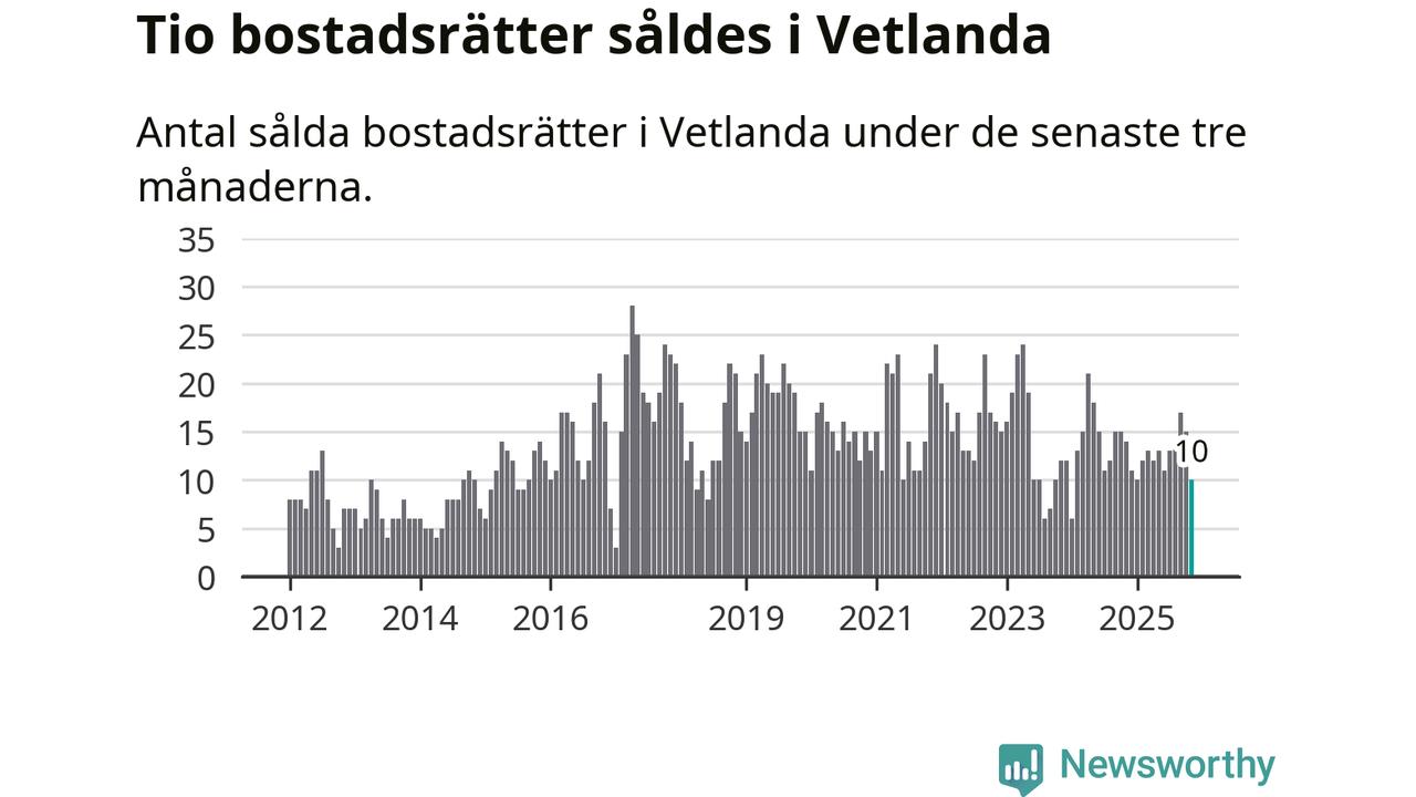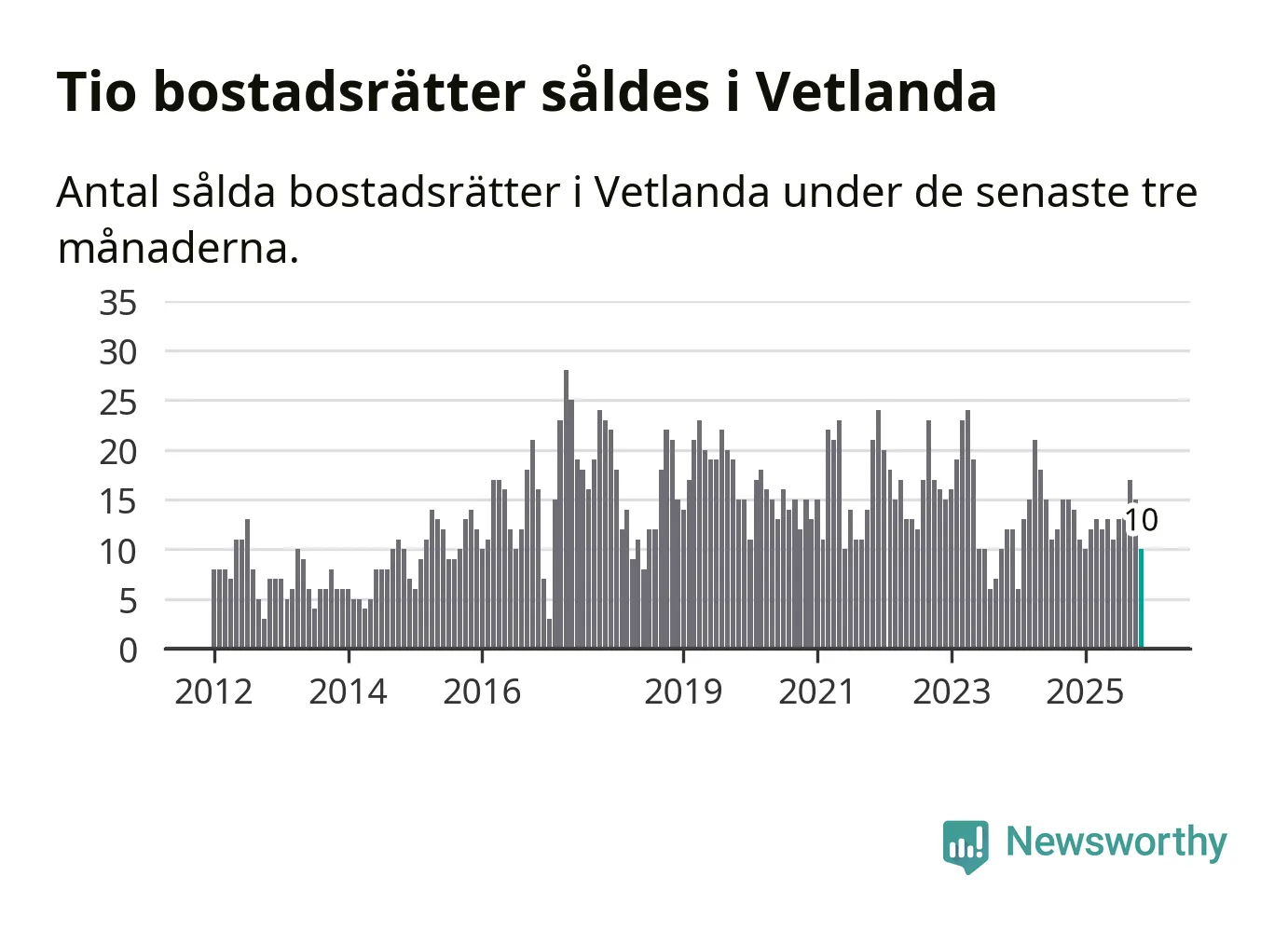 Mellan september och november gjordes sammanlagt tio affärer med bostadsrätter i Vetlanda kommun. Det kan jämföras med 14 vid motsvarande tid i fjol.