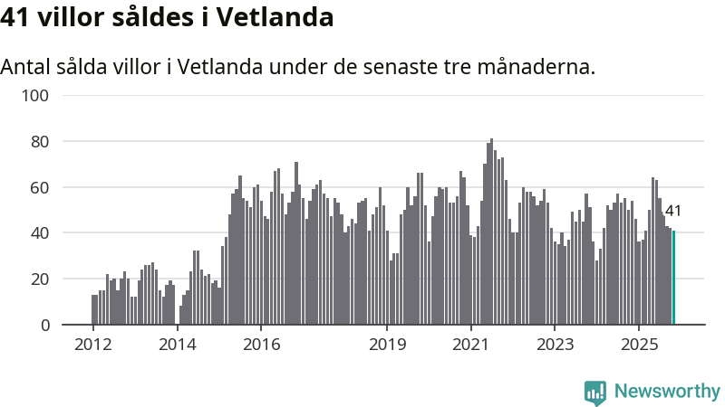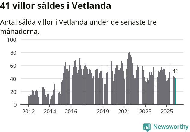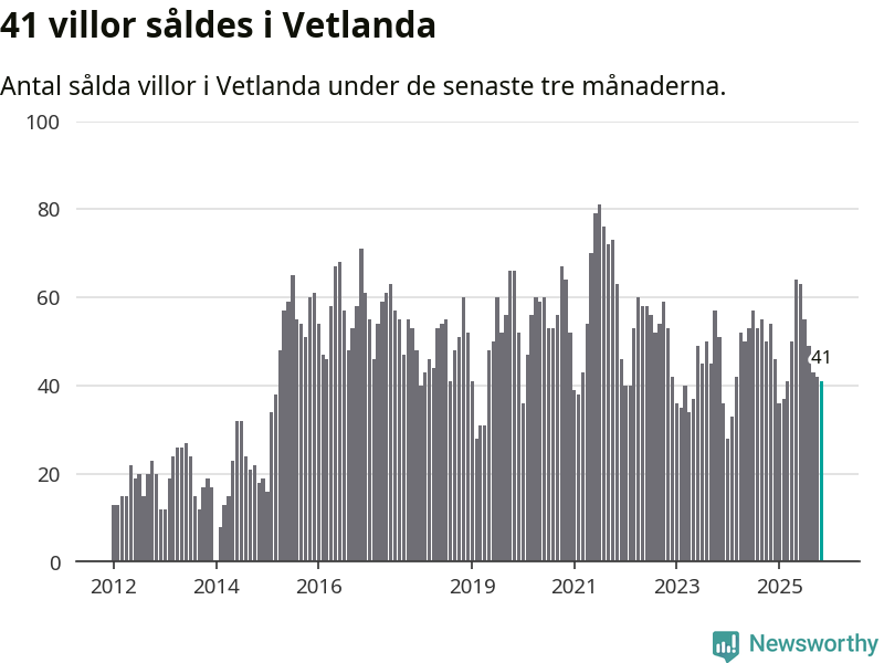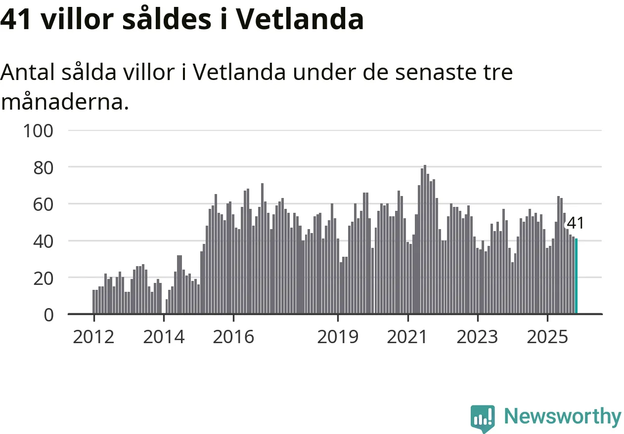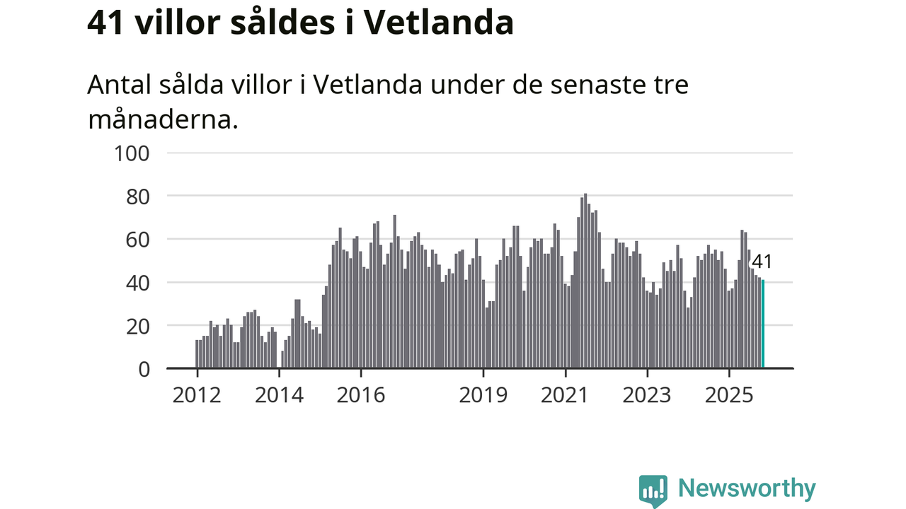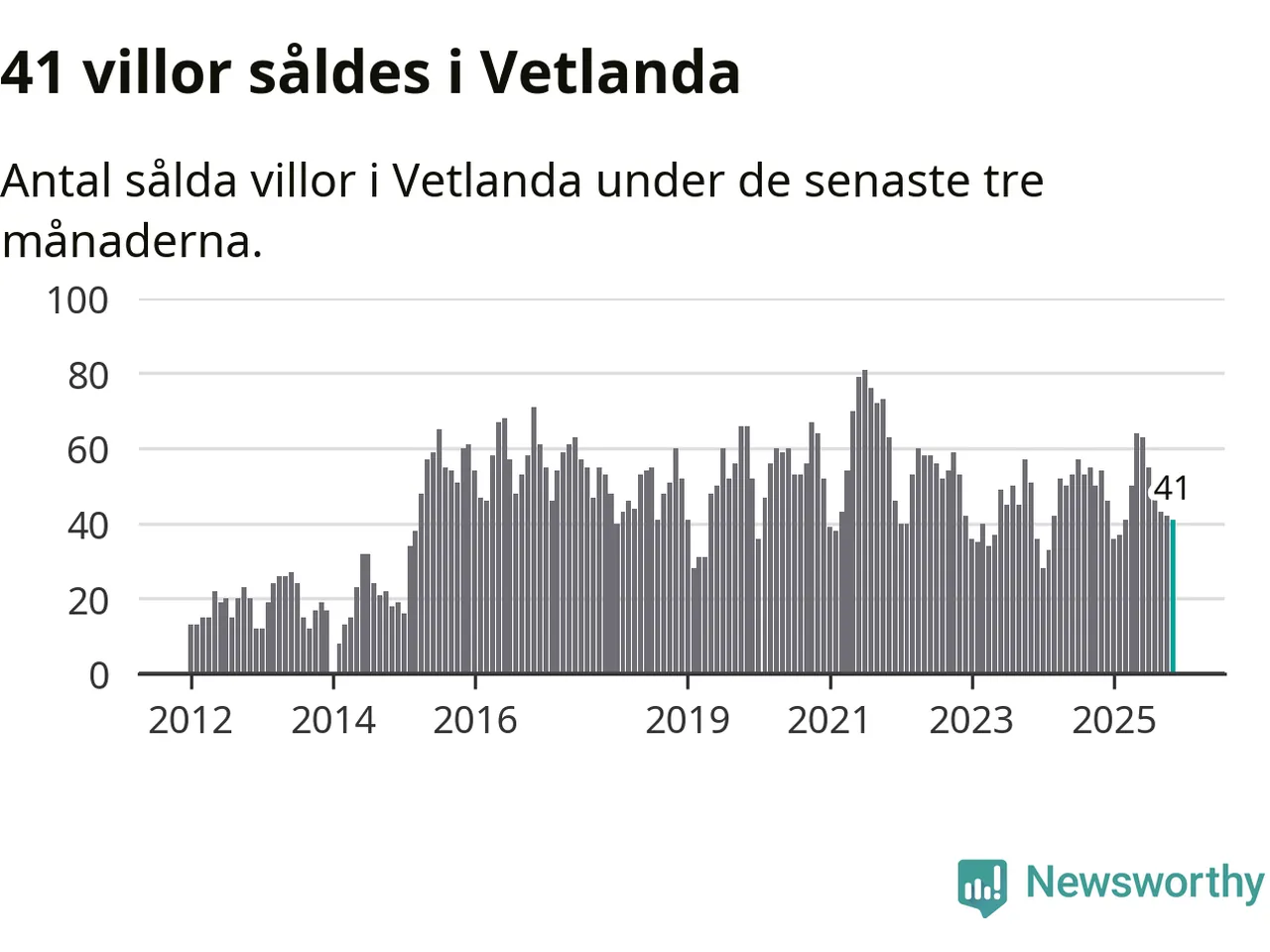 Mellan september och november såldes 41 villor i Vetlanda kommun. Det är relativt få sett till aktiviteten på bostadsmarknaden i kommunen under de senaste tolv månaderna, samt det historiska snittet för den här tiden på året.