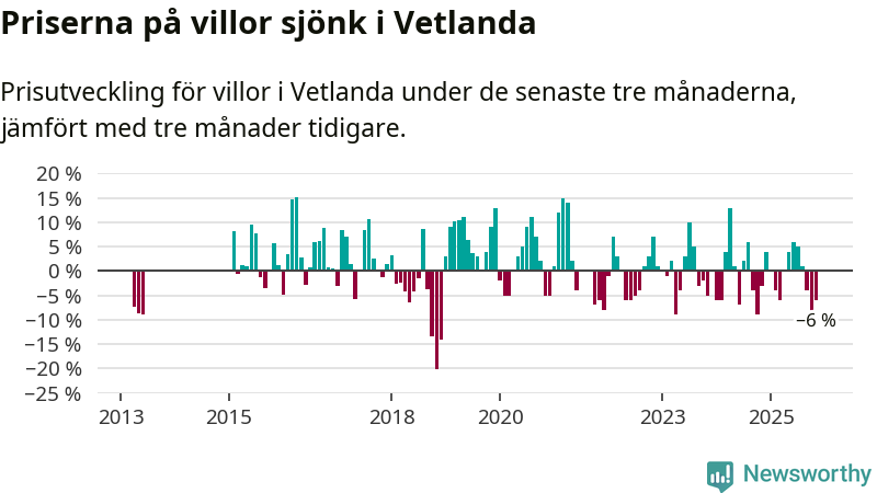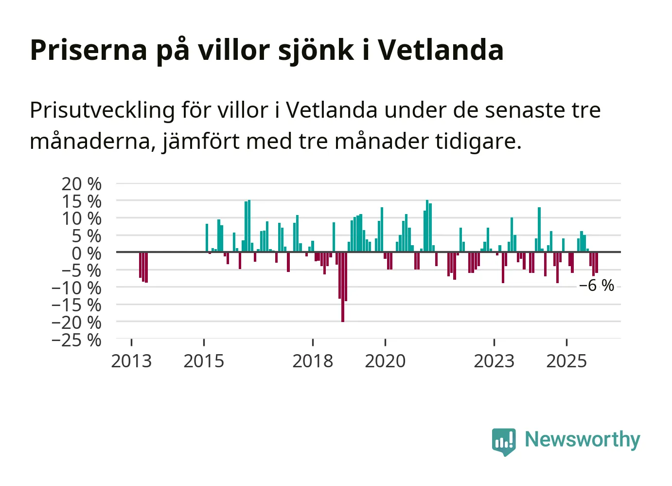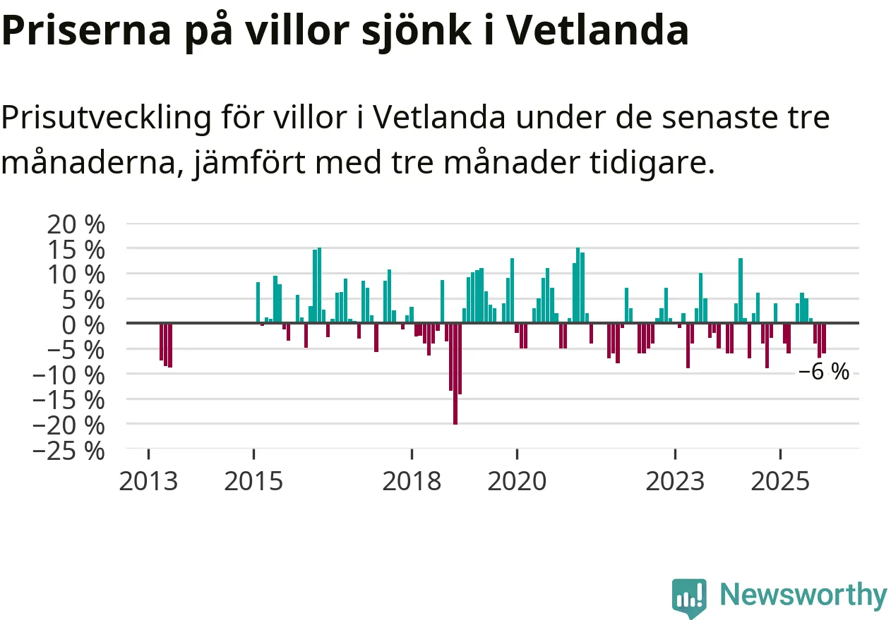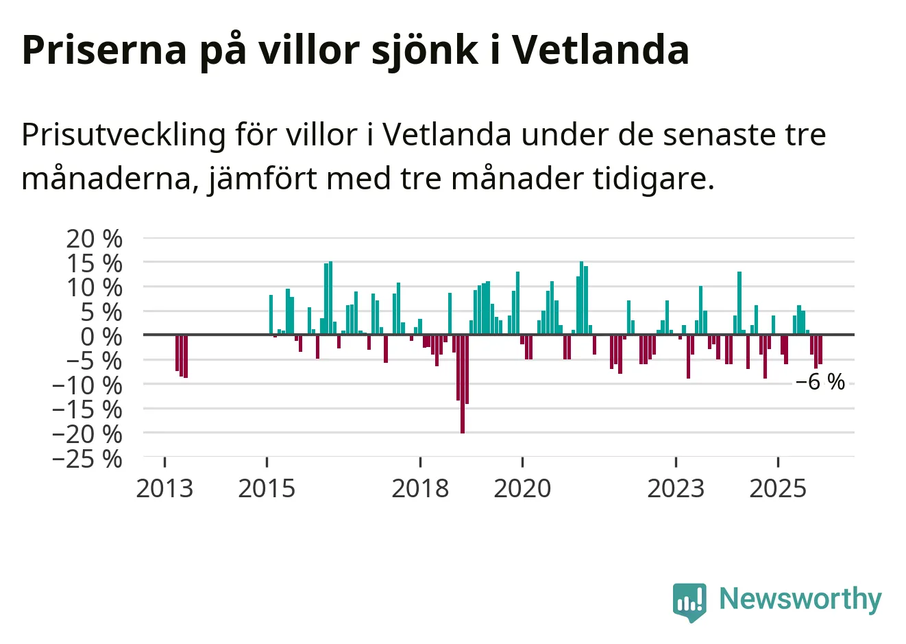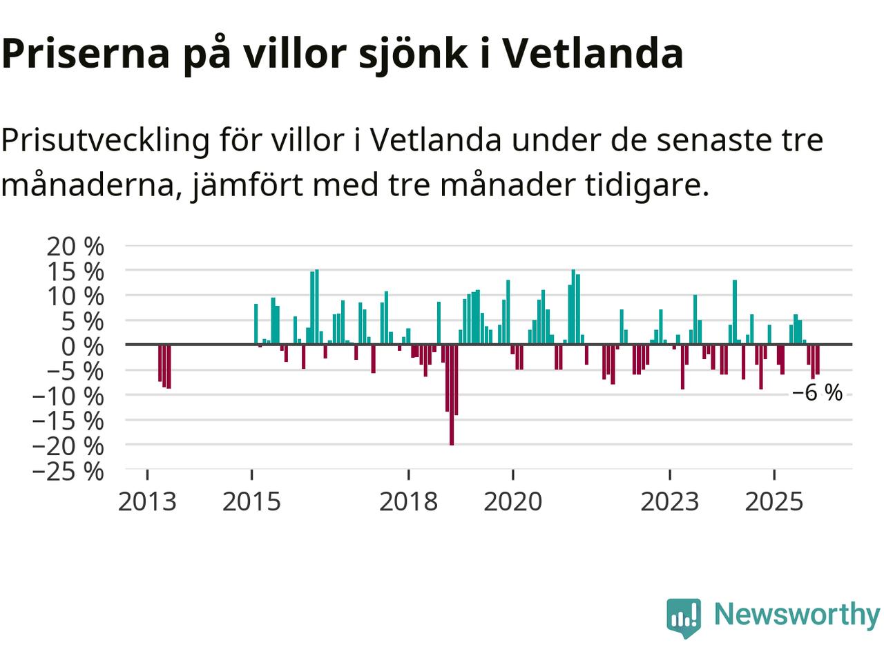 Statistiken visar även på en kännbar prisnedgång i Vetlanda kommun. Medelpriset på försäljningarna av villor i kommunen var 6 procent lägre än för tre månader sedan. Även i hela Jönköpings län sjunker villapriserna. I hela länet noterades en prisnedgång på 1 procent.