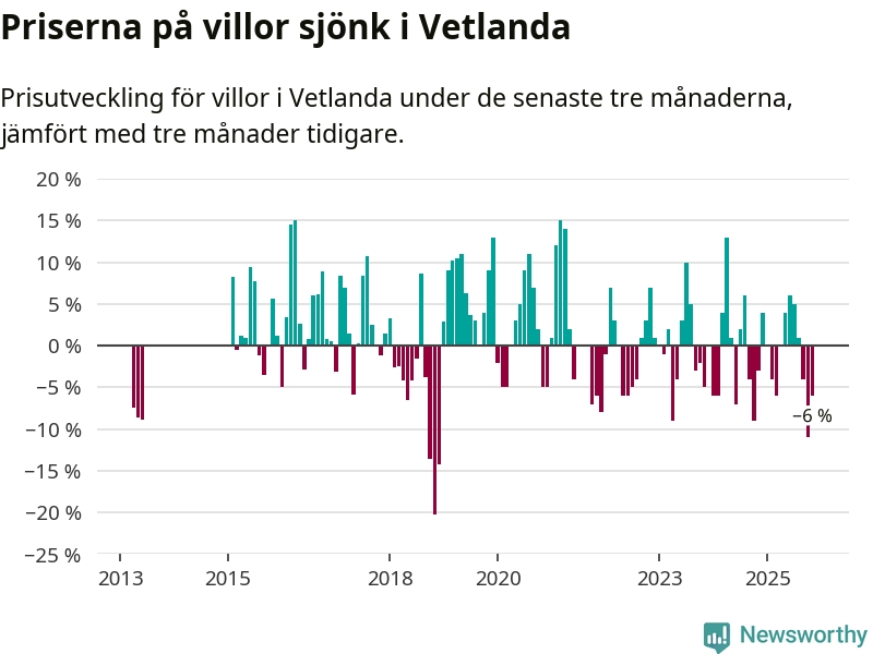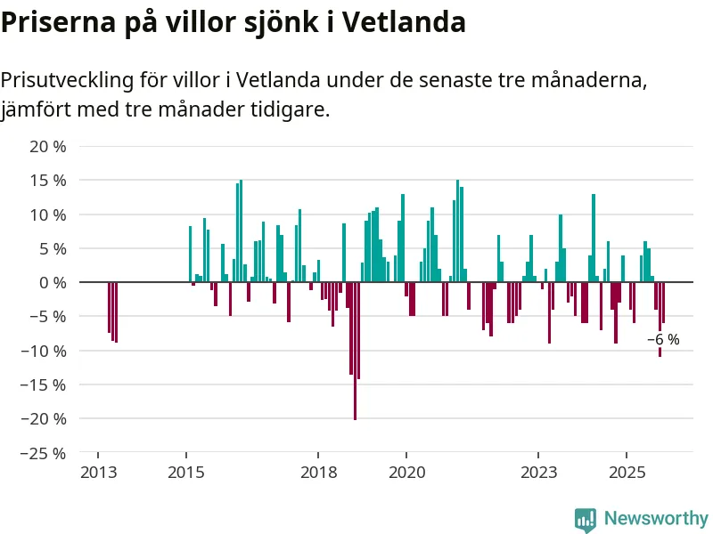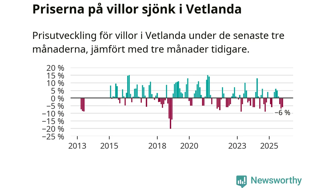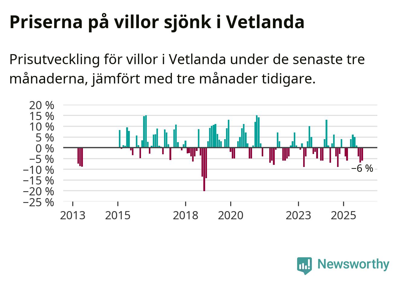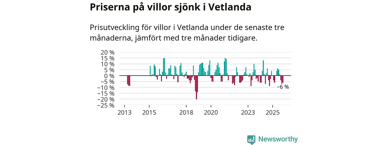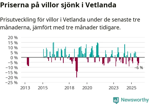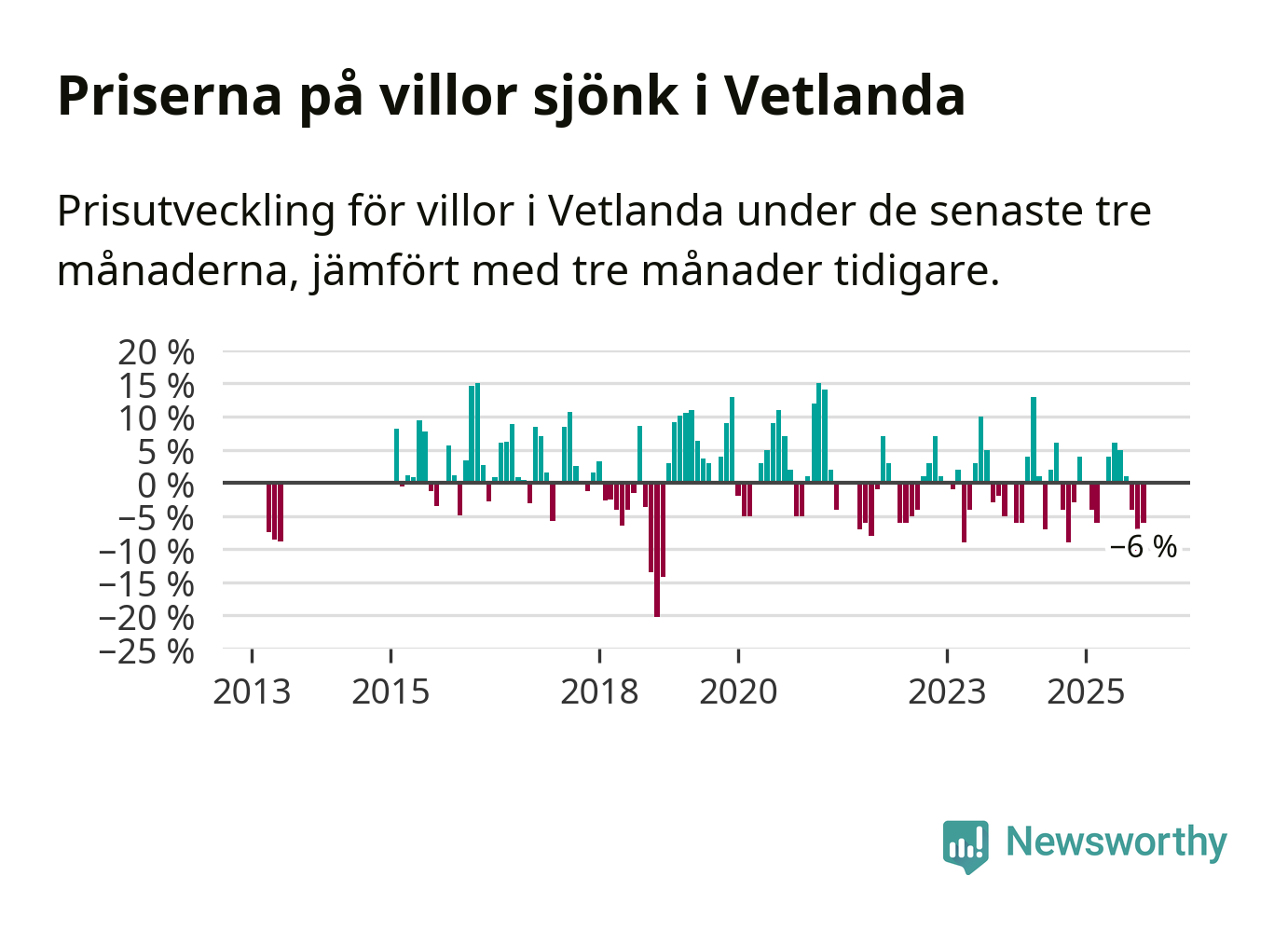 Statistiken visar även på en kännbar prisnedgång i Vetlanda kommun. Medelpriset på försäljningarna av villor i kommunen var 6 procent lägre än för tre månader sedan. Även i hela Jönköpings län sjunker villapriserna. I hela länet noterades en prisnedgång på 1 procent.