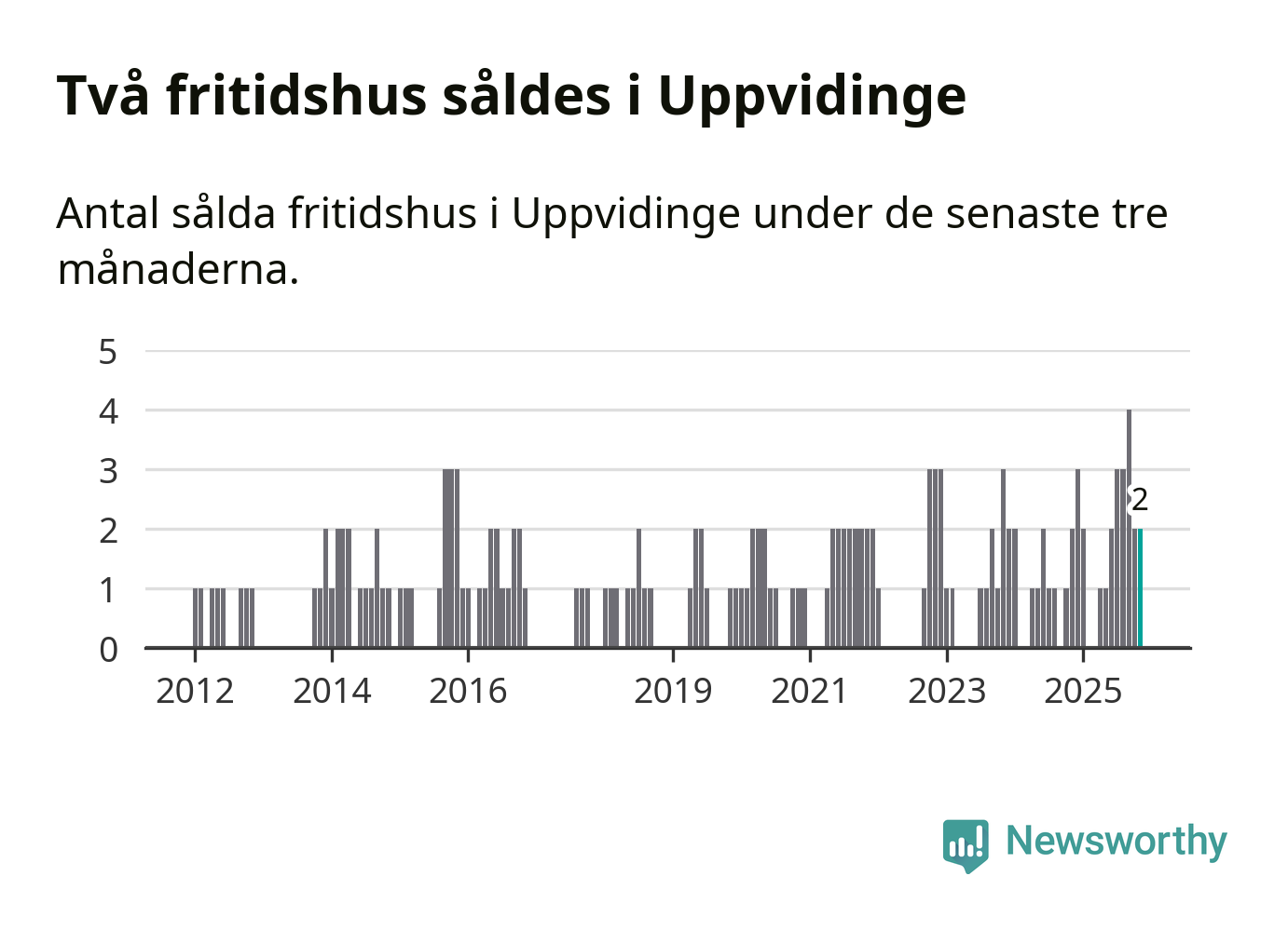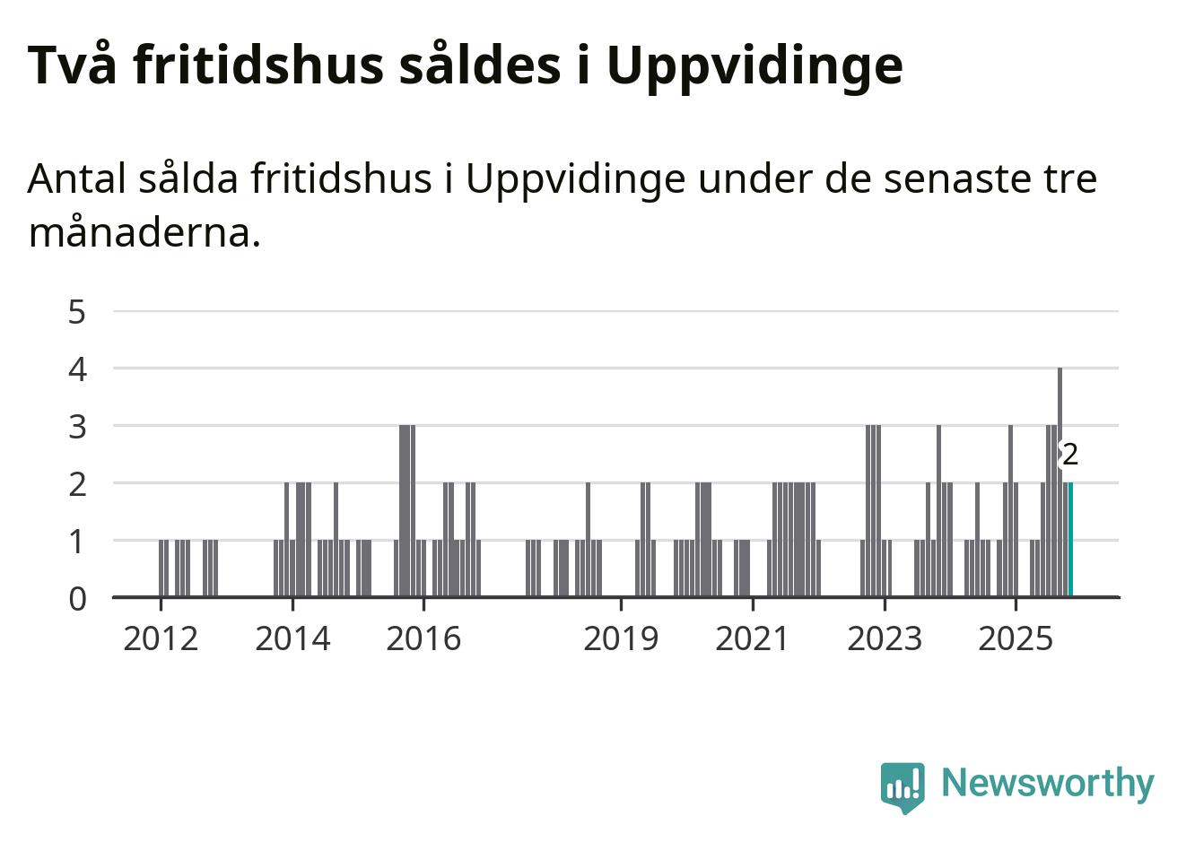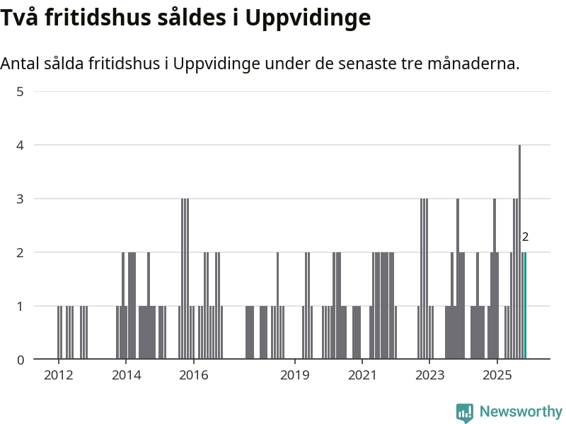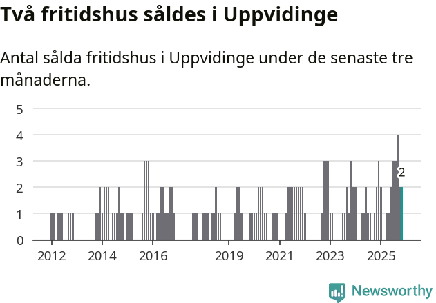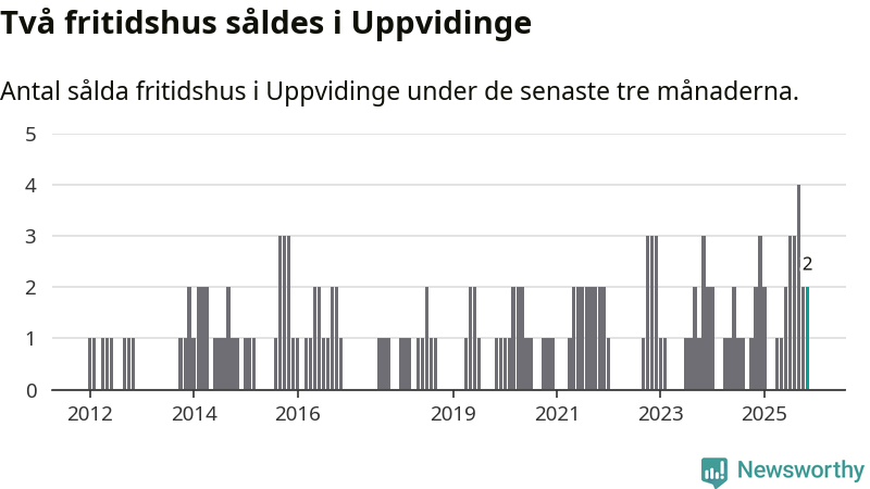 Mellan september och november gjordes sammanlagt två affärer med fritidshus i Uppvidinge kommun. Det är lika många affärer som vid motsvarande tid i fjol.