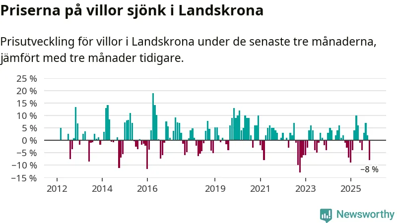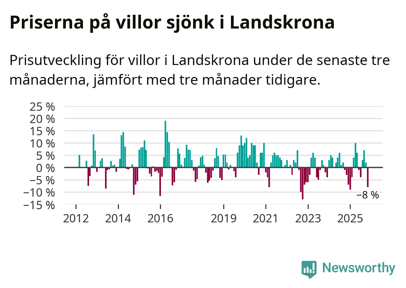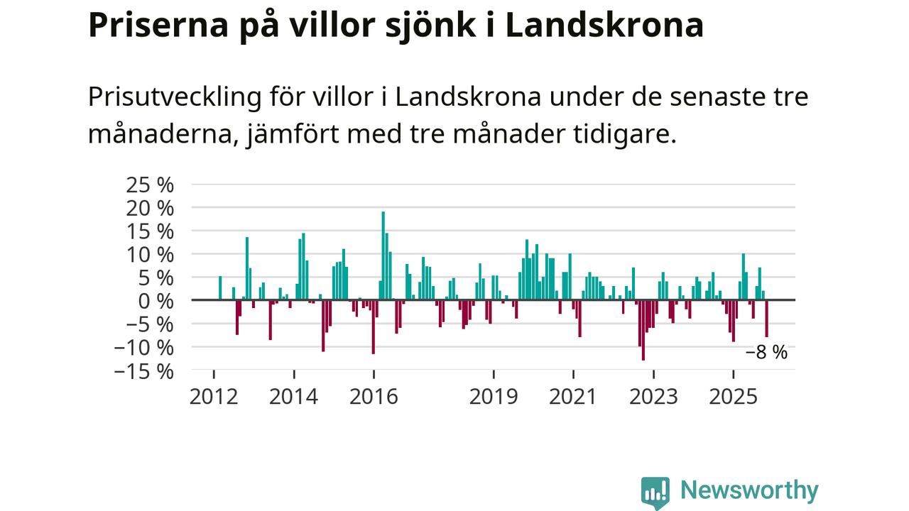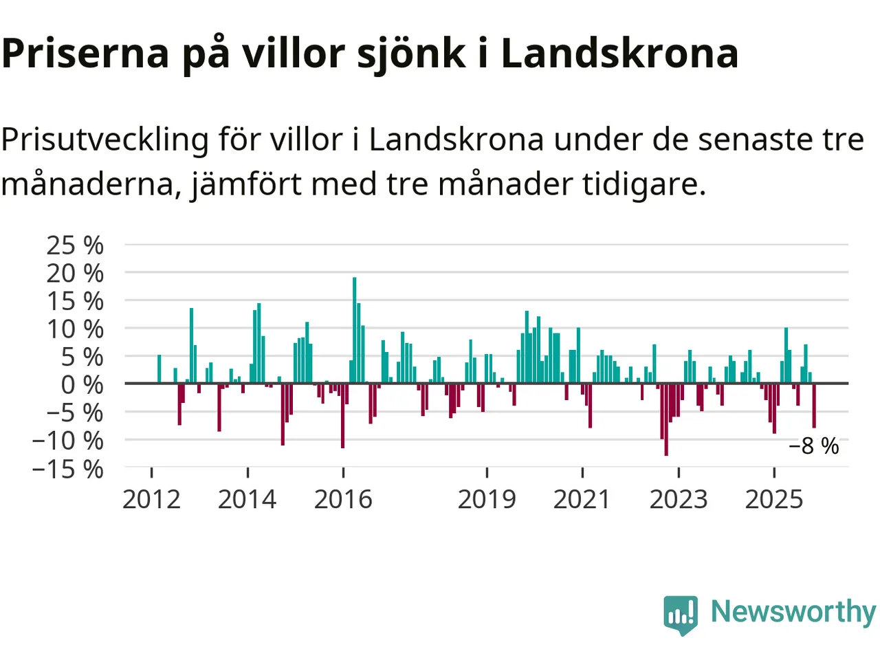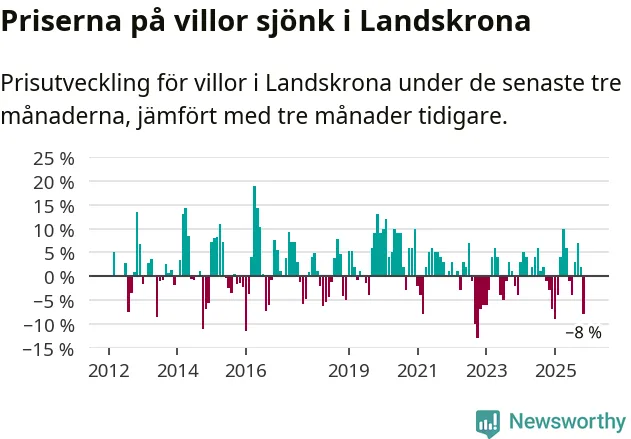Villapriserna har gått ner i Landskrona kommun. Medelpriset på försäljningarna under de senaste tre månaderna visar på en nedgång med 8 procent.