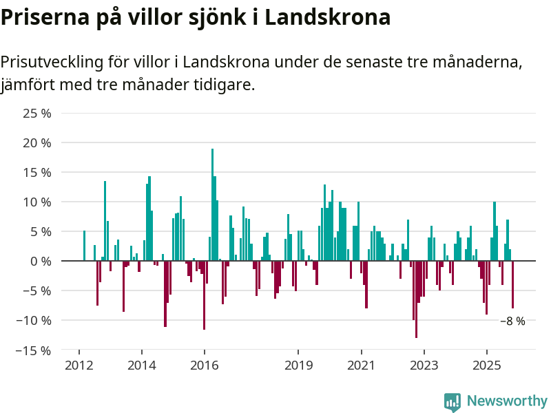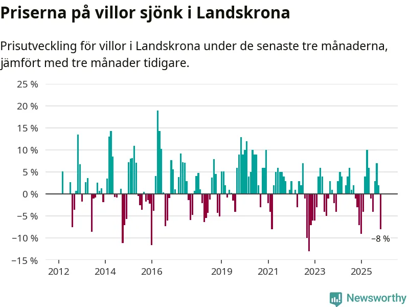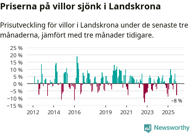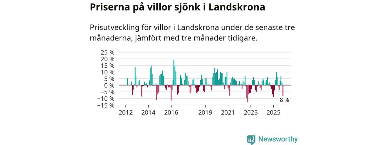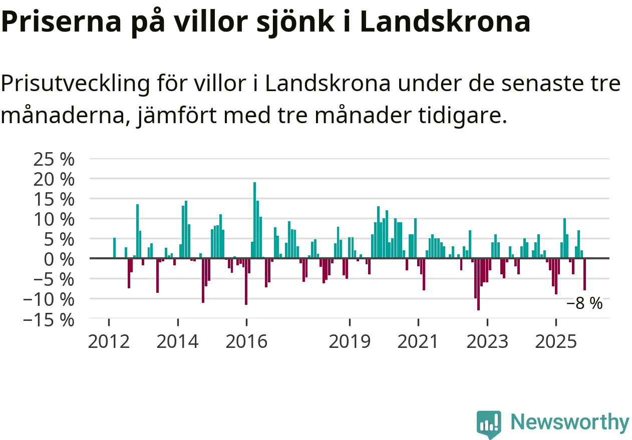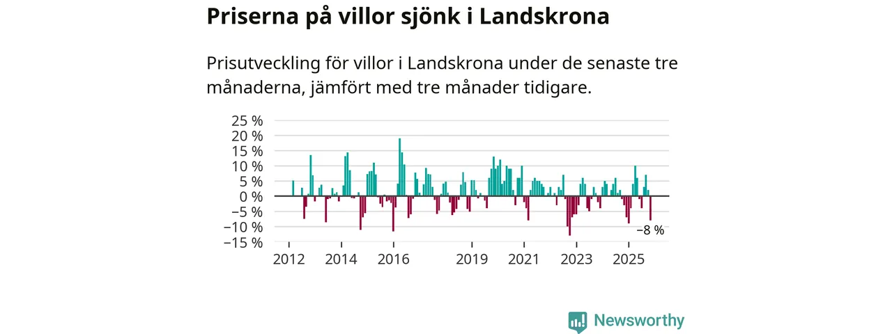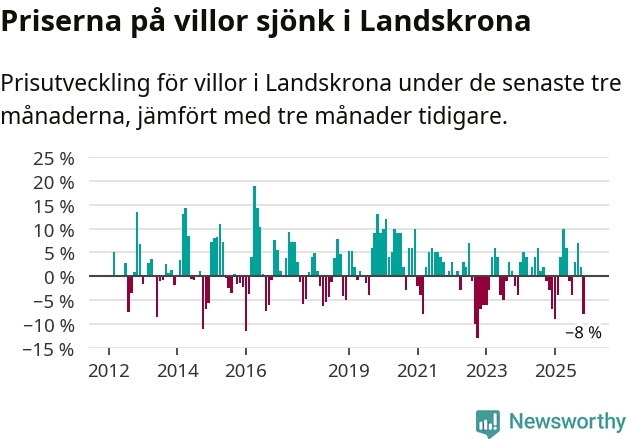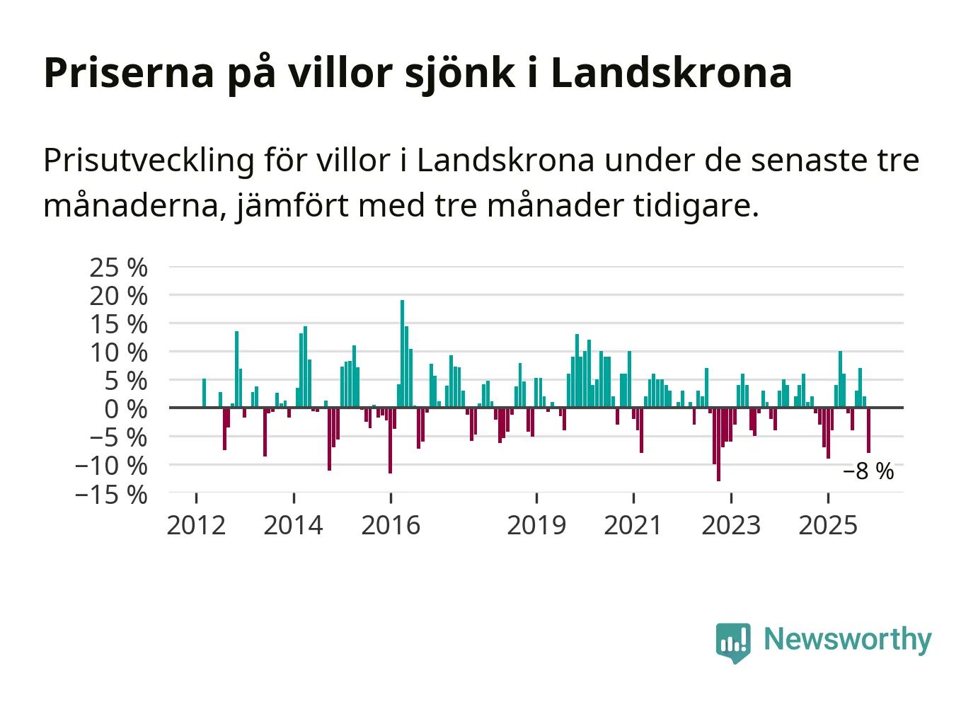 Villapriserna har gått ner i Landskrona kommun. Medelpriset på försäljningarna under de senaste tre månaderna visar på en nedgång med 8 procent.