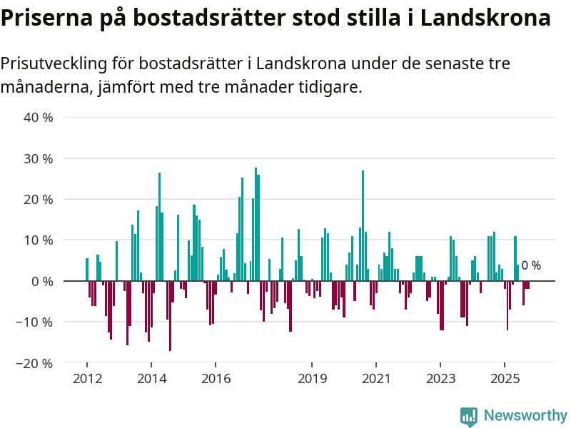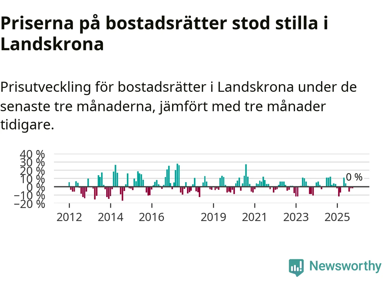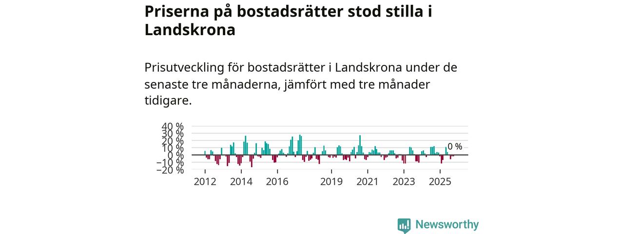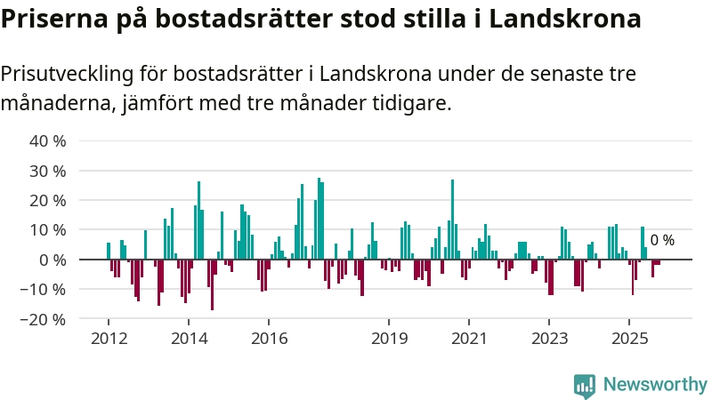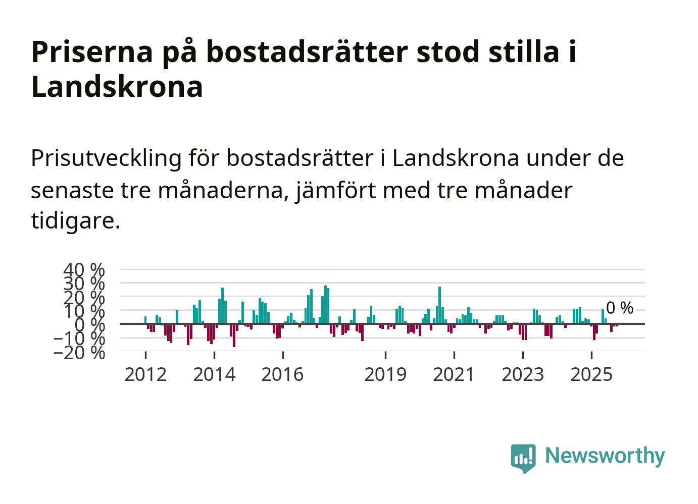 Priserna på bostadsrätter står i stort sett stilla i Landskrona kommun. Medelpriset på de på försäljningarna under de senaste tre månaderna låg på samma nivå som för tre månader sedan.
