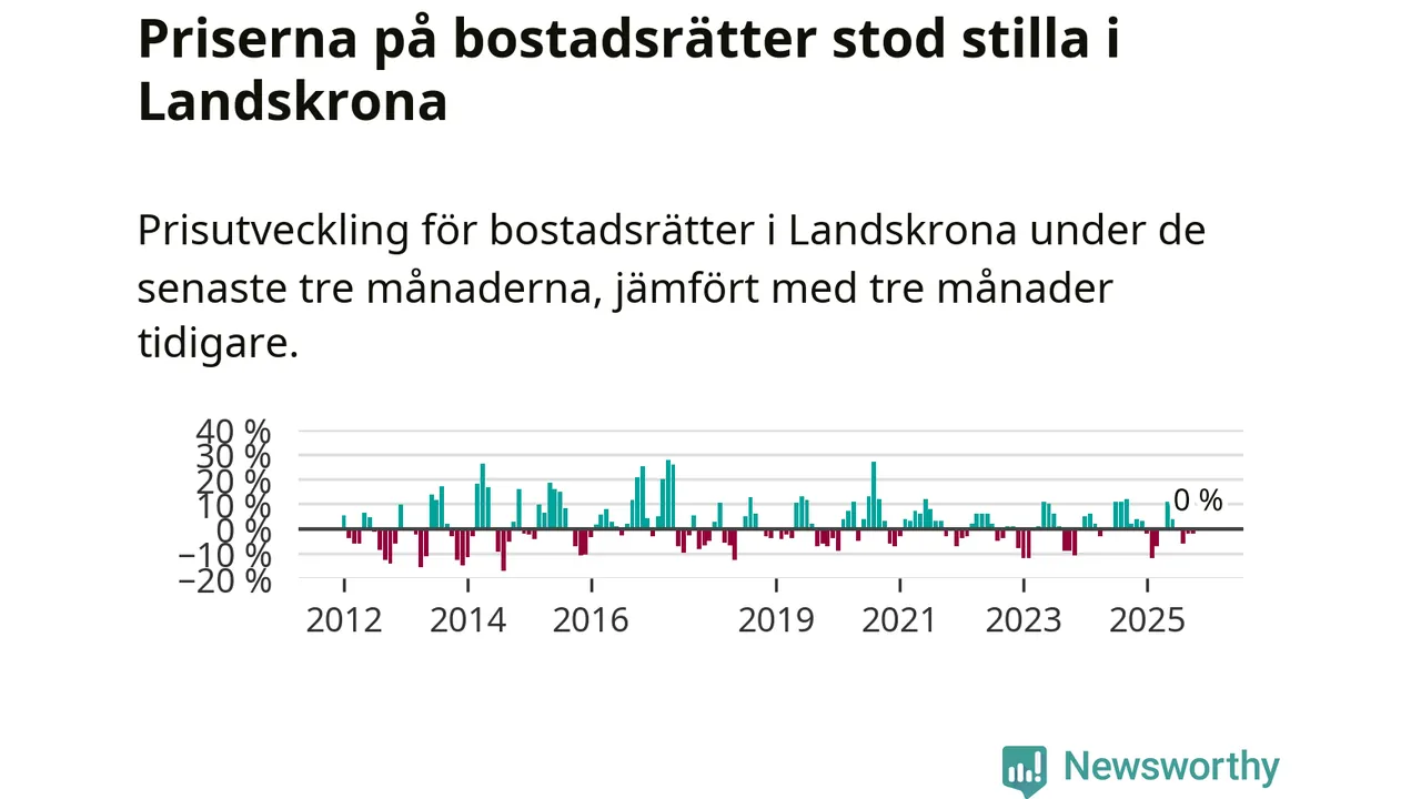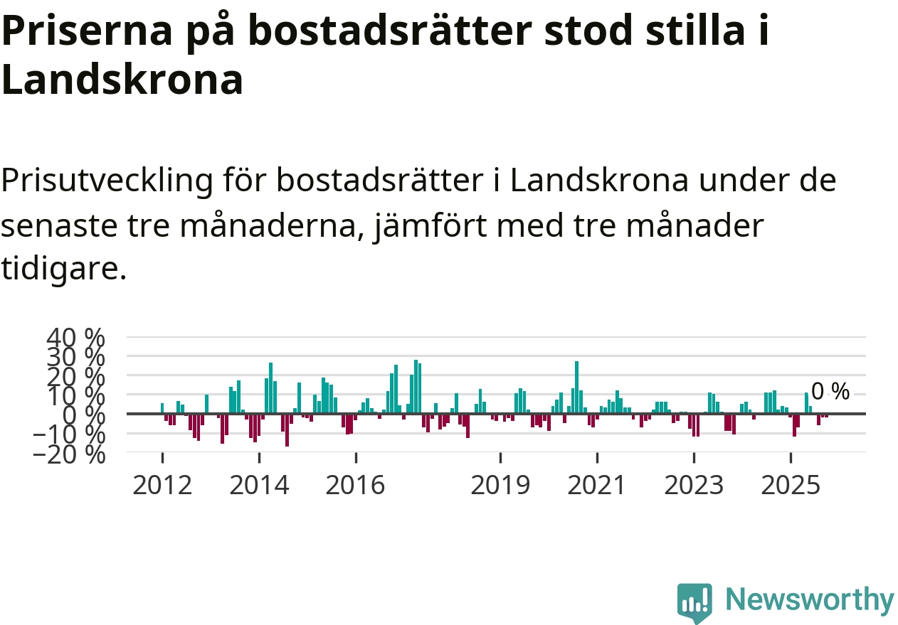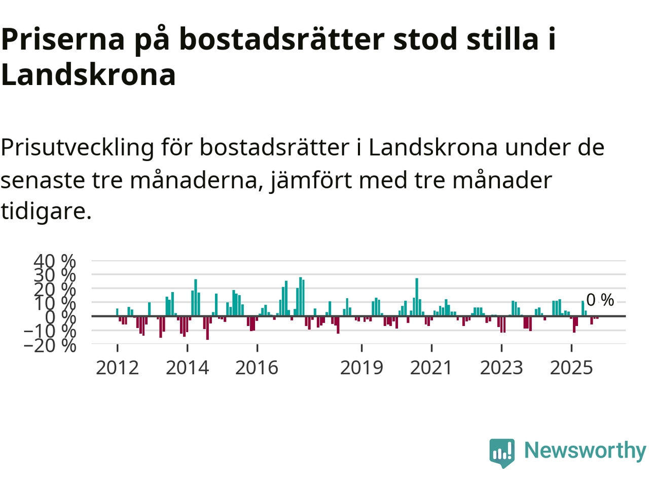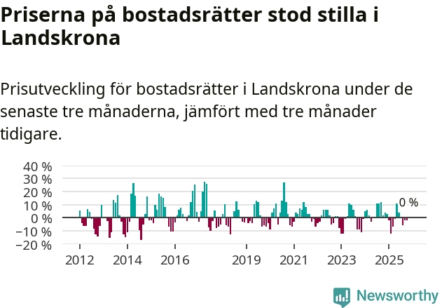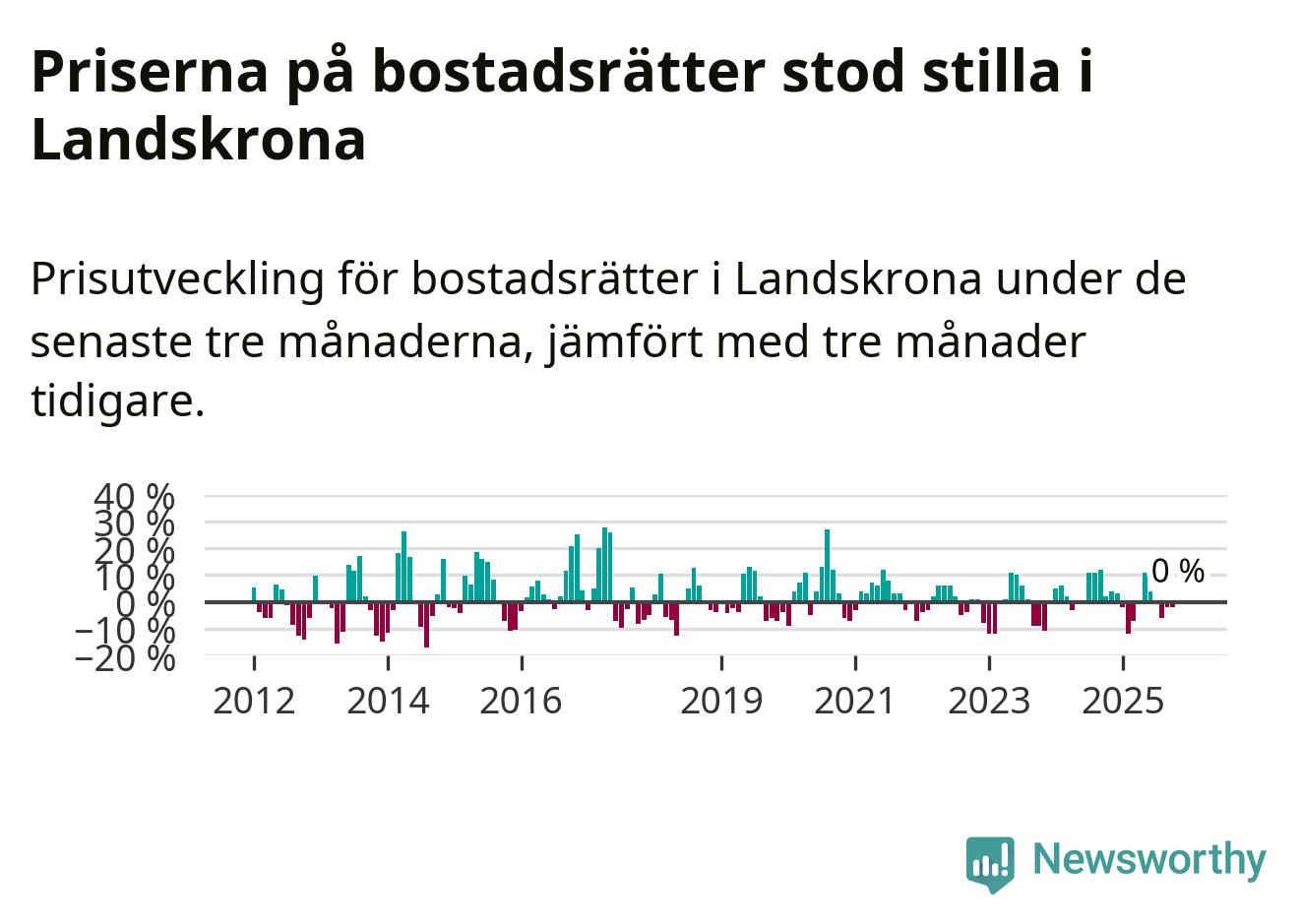 Priserna på bostadsrätter står i stort sett stilla i Landskrona kommun. Medelpriset på de på försäljningarna under de senaste tre månaderna låg på samma nivå som för tre månader sedan.