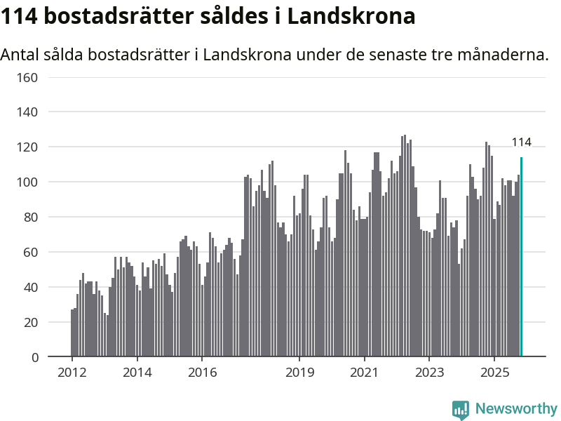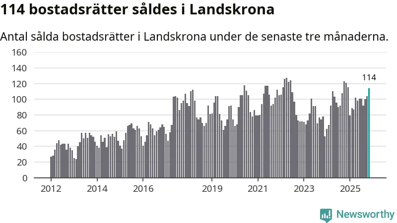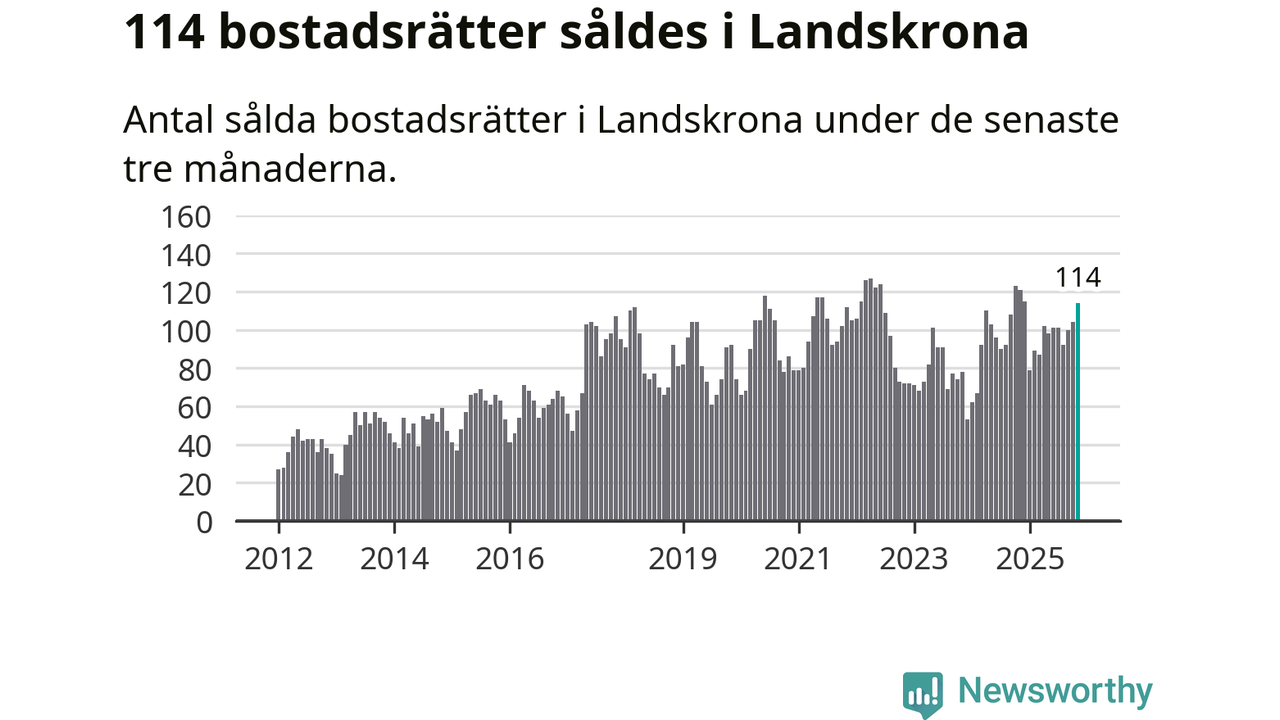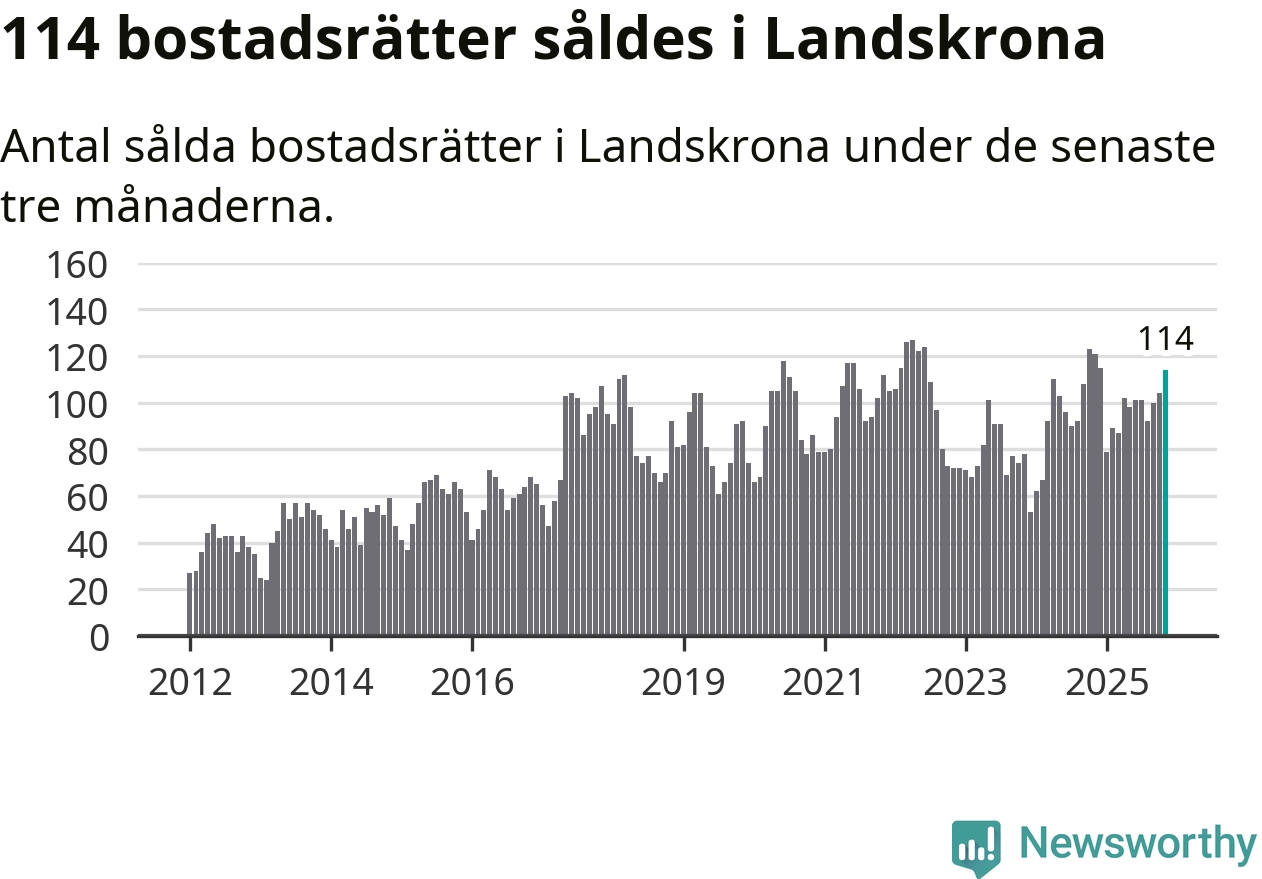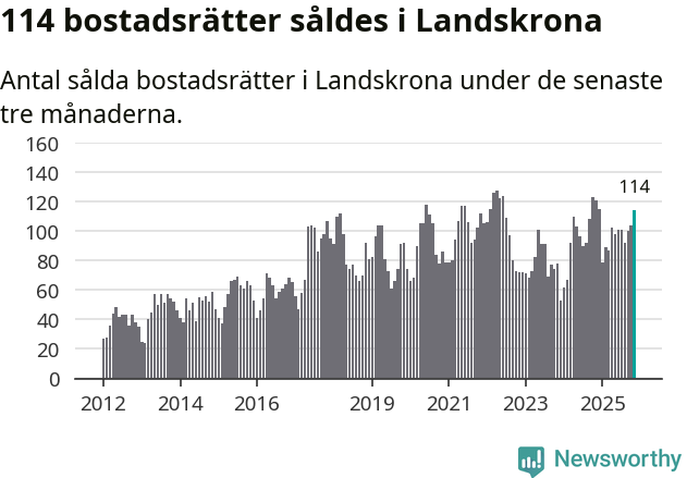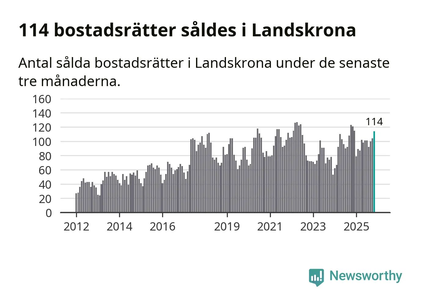 Sammanlagt såldes 114 bostadsrätter i Landskrona kommun mellan september och november till ett genomsnittligt pris på 2,0 miljoner kronor. I fjol gjordes 121 affärer vid den här tiden på året.