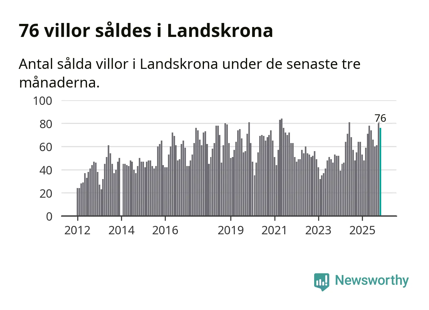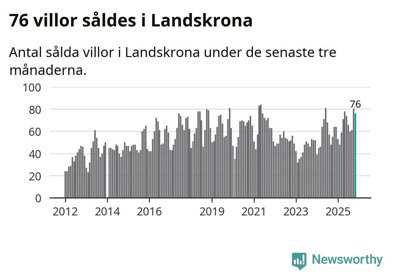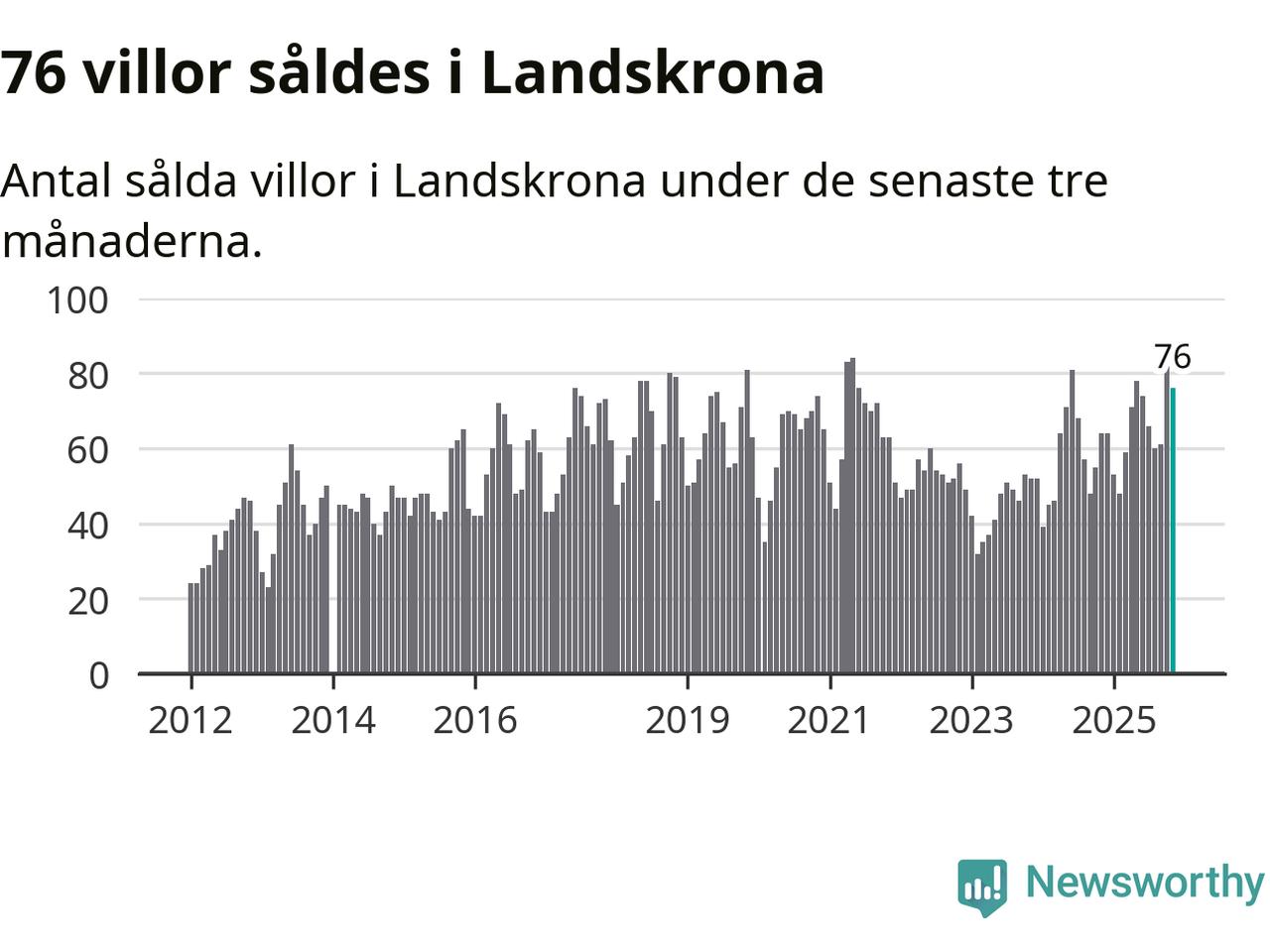 Sammanlagt såldes 76 villor i Landskrona kommun mellan september och november till ett genomsnittligt pris på 4,0 miljoner kronor. I fjol gjordes 64 affärer vid den här tiden på året.