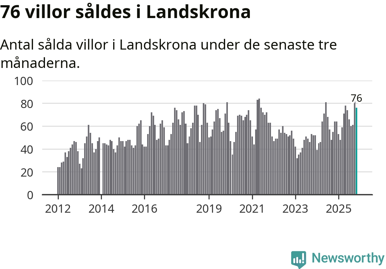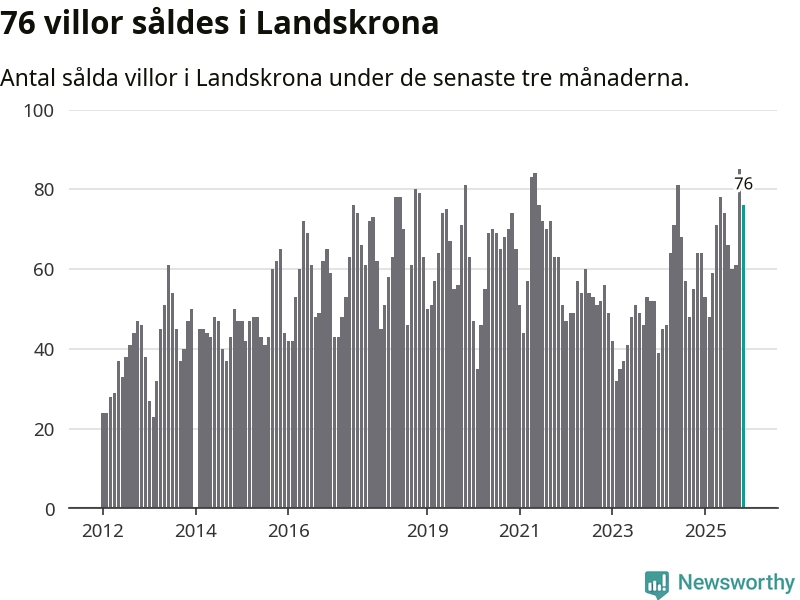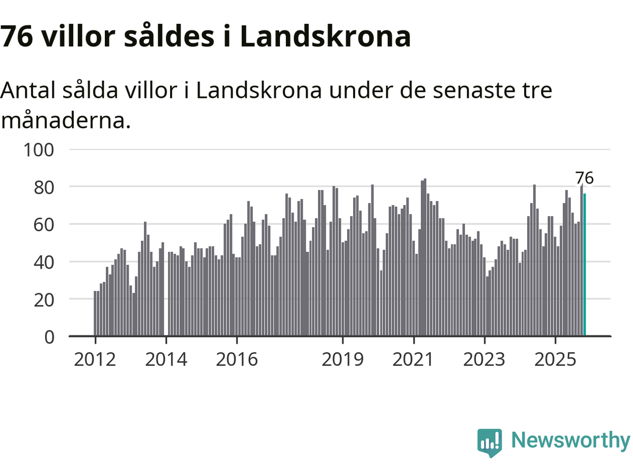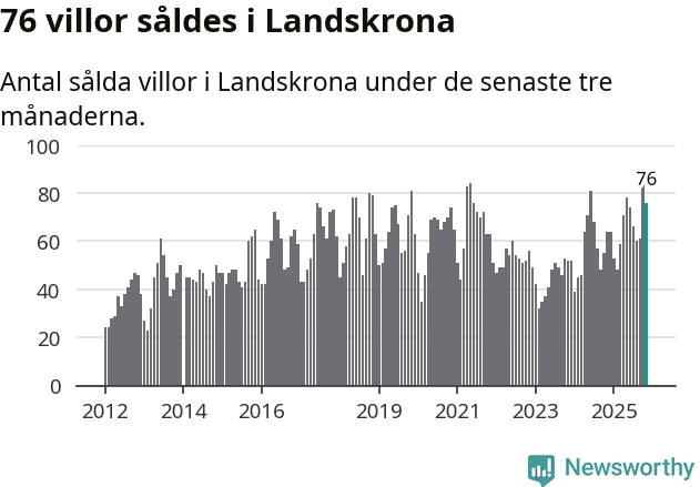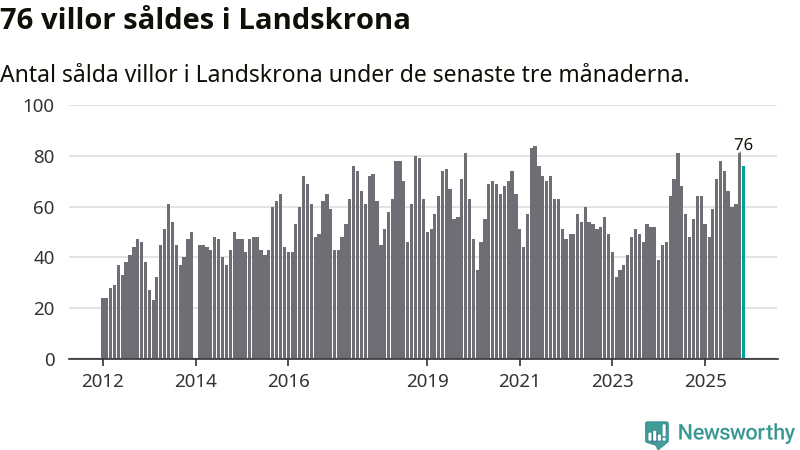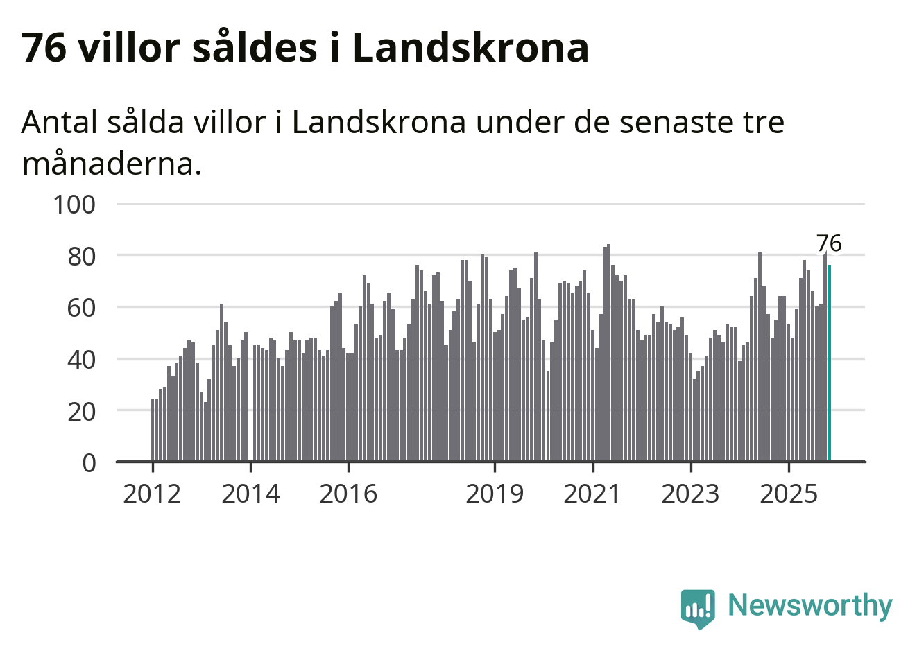Sammanlagt såldes 76 villor i Landskrona kommun mellan september och november till ett genomsnittligt pris på 4,0 miljoner kronor. I fjol gjordes 64 affärer vid den här tiden på året.