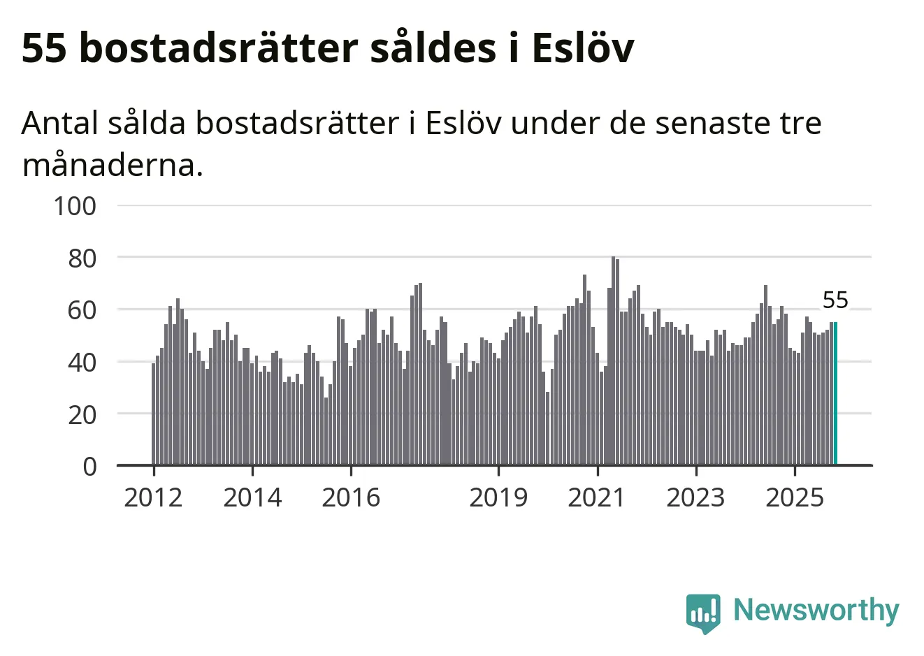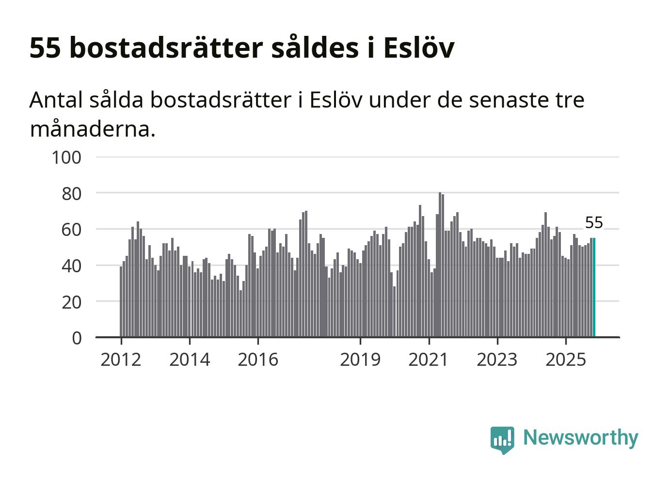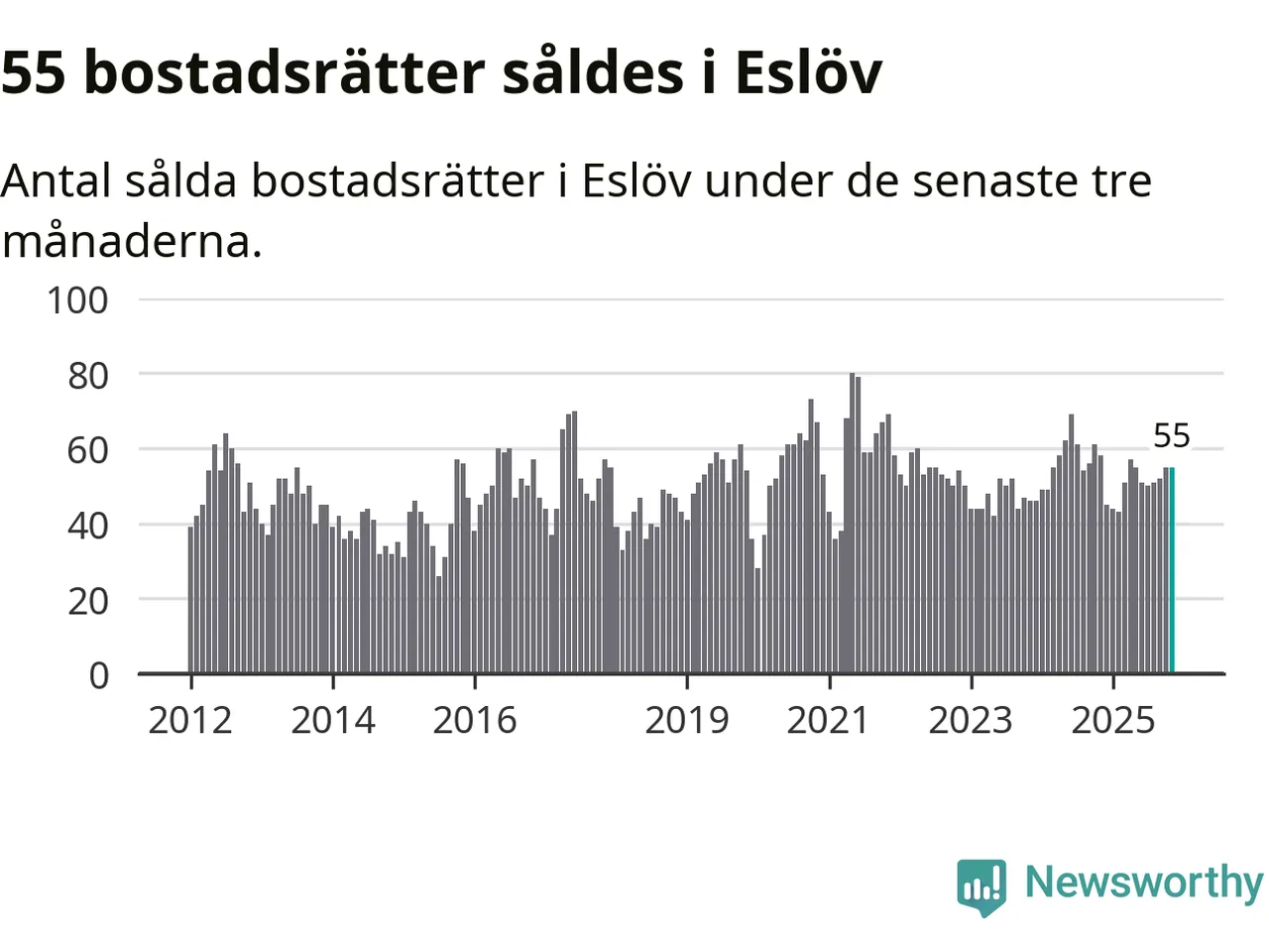 Sammanlagt såldes 55 bostadsrätter i Eslövs kommun mellan september och november till ett genomsnittligt pris på 1,3 miljoner kronor. I fjol gjordes 58 affärer vid den här tiden på året.
