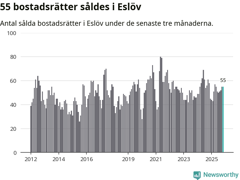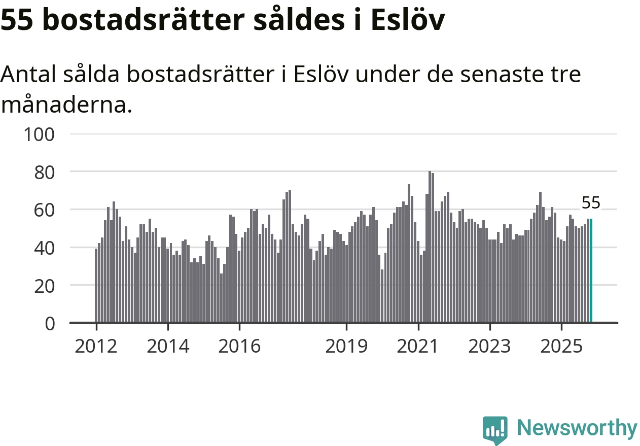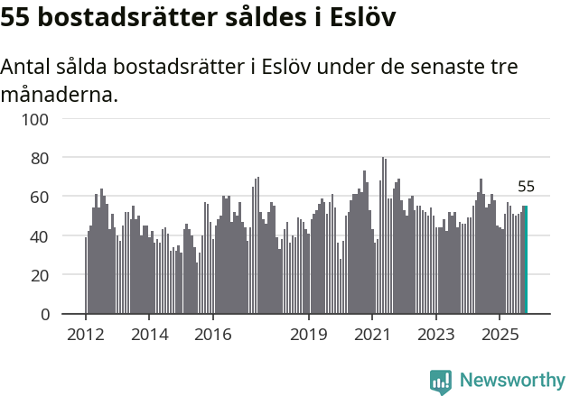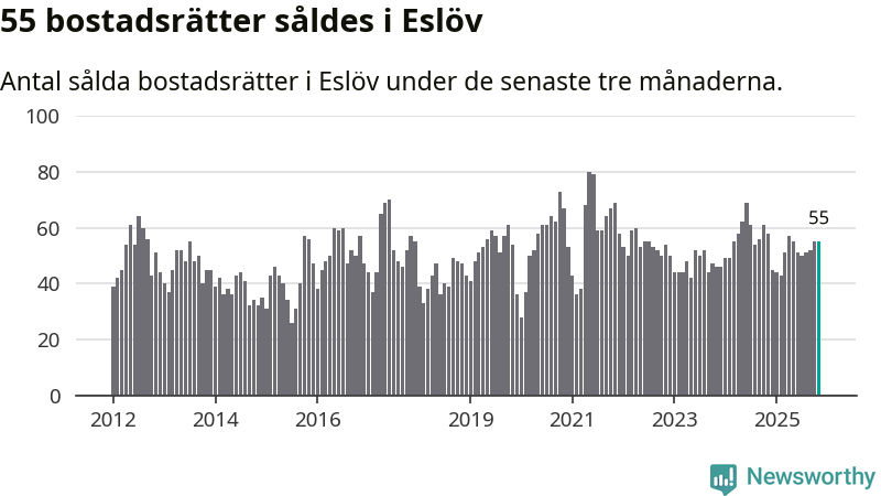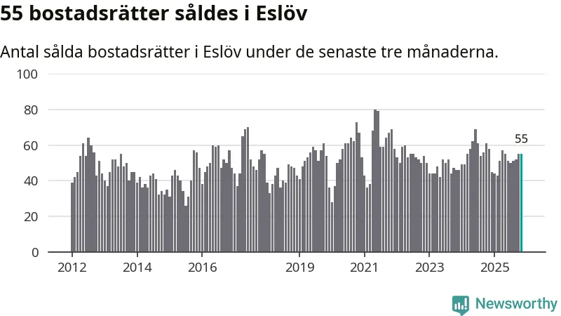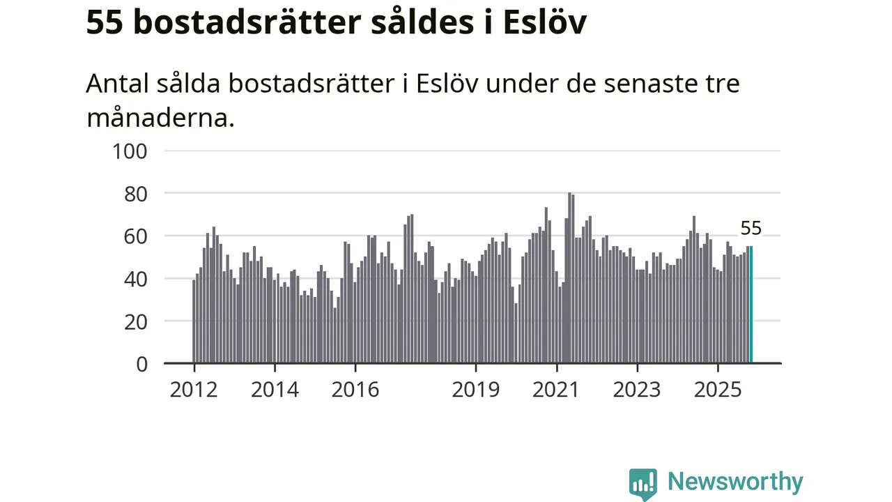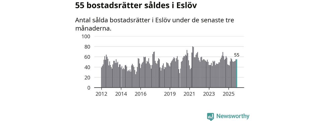 Sammanlagt såldes 55 bostadsrätter i Eslövs kommun mellan september och november till ett genomsnittligt pris på 1,3 miljoner kronor. I fjol gjordes 58 affärer vid den här tiden på året.
