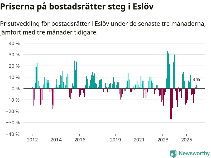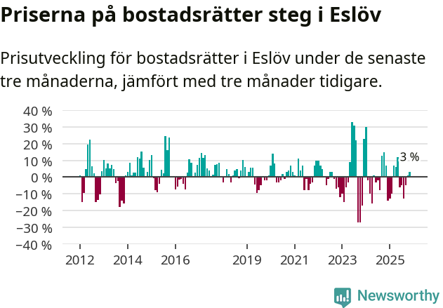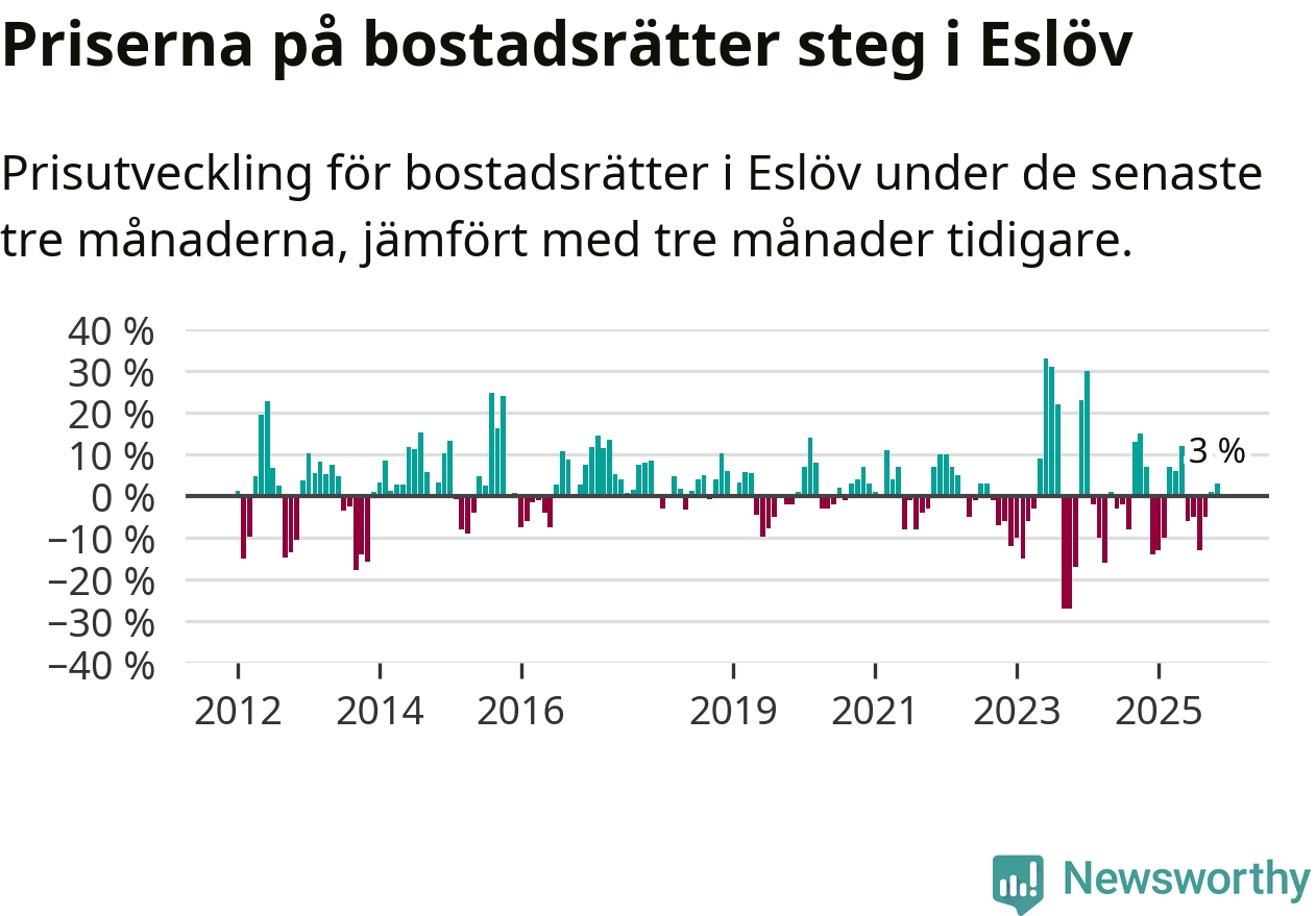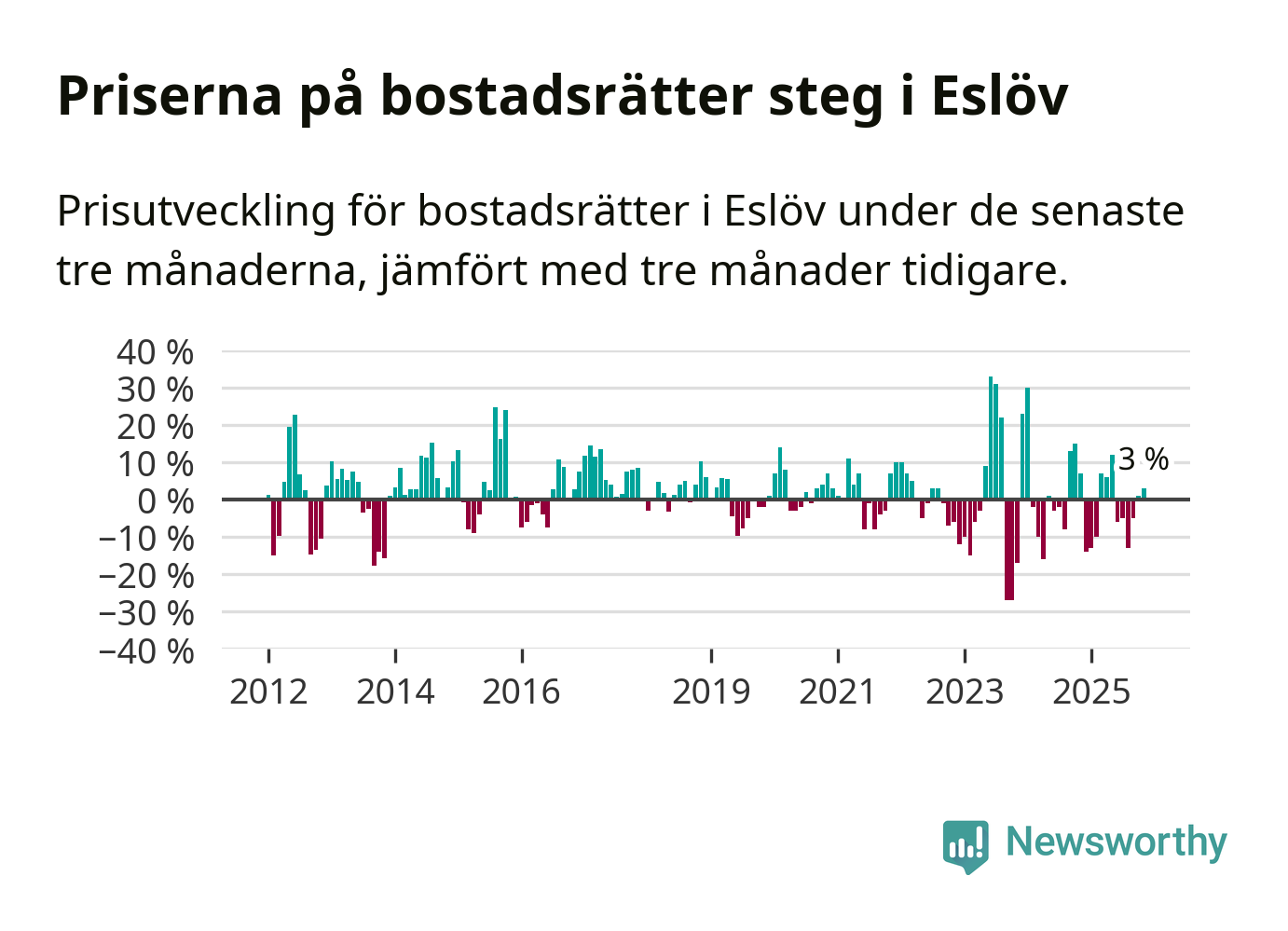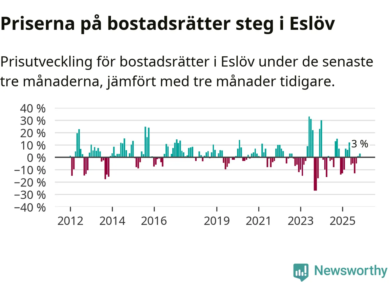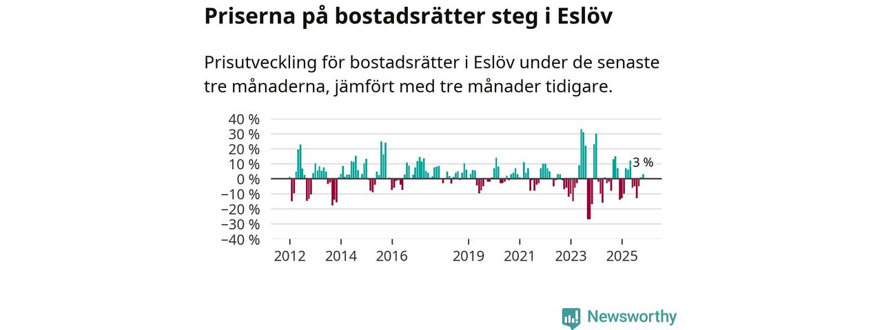 Priserna på bostadsrätter har gått upp i Eslövs kommun. Medelpriset på försäljningarna under de senaste tre månaderna visar på en uppgång med 3 procent.