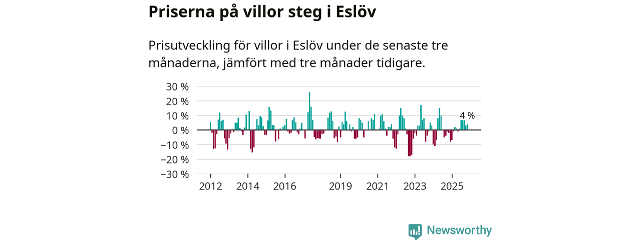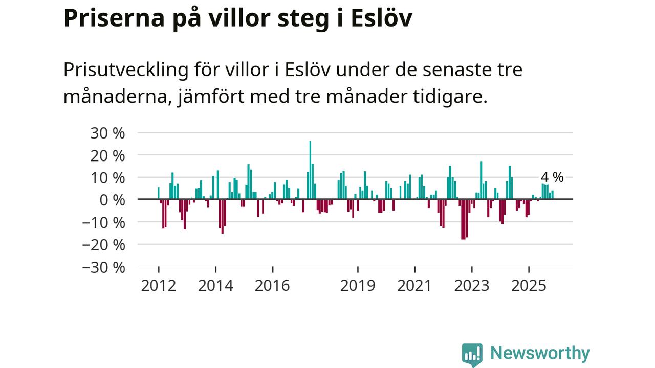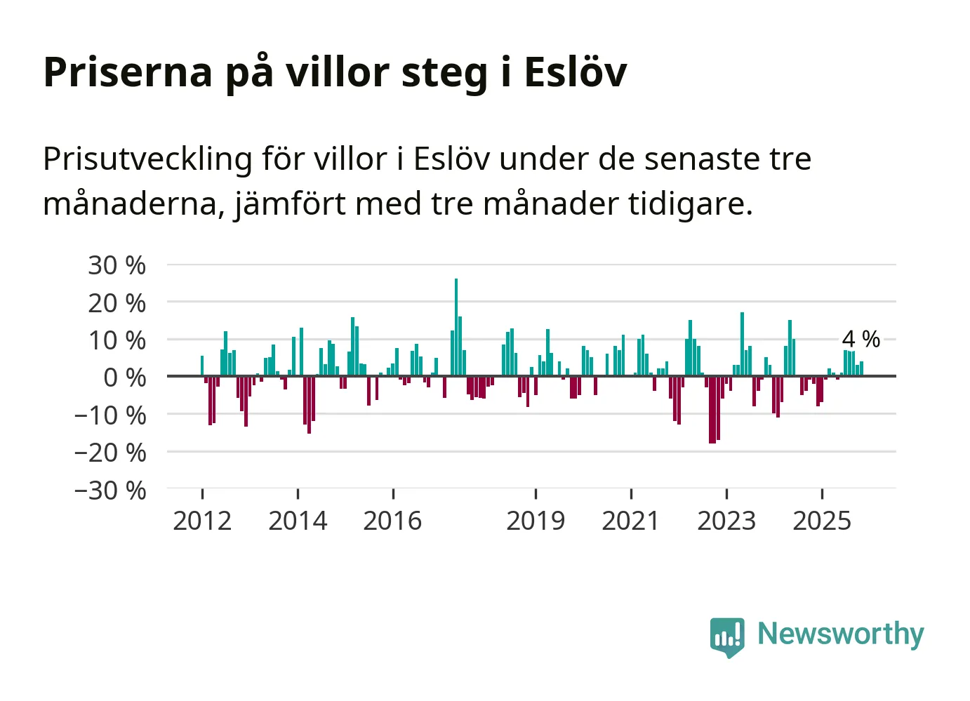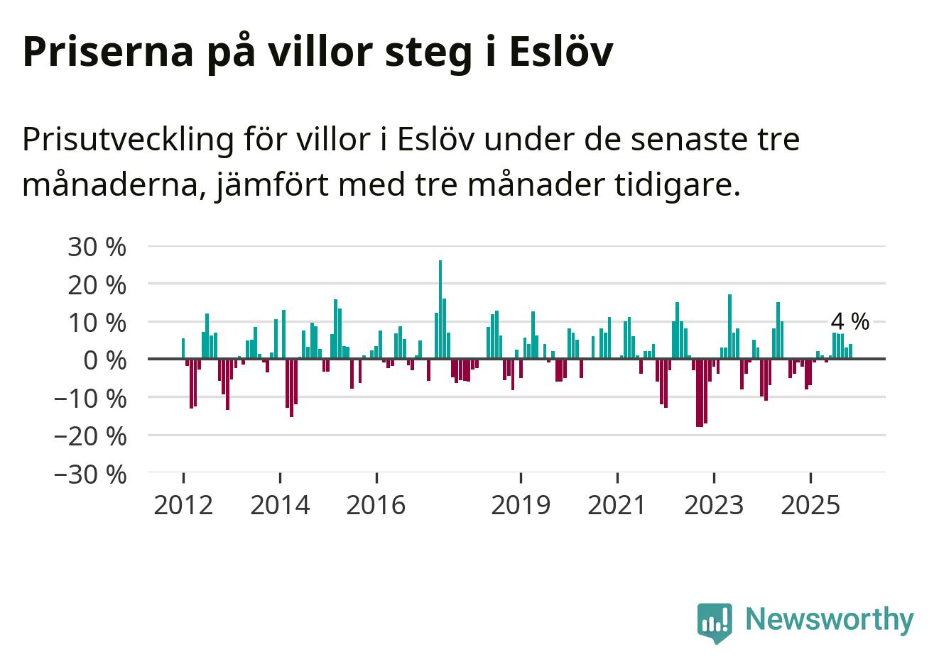 Villapriserna har gått upp i Eslövs kommun. Medelpriset på försäljningarna under de senaste tre månaderna visar på en uppgång med 4 procent.