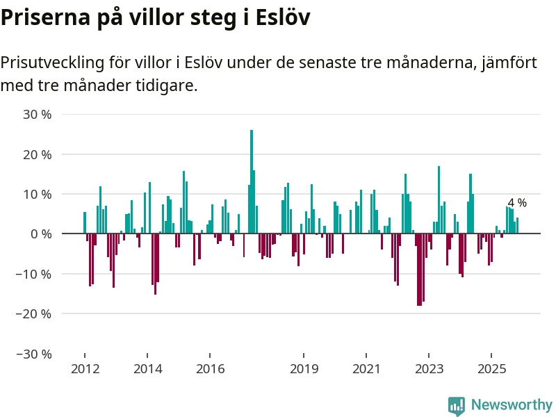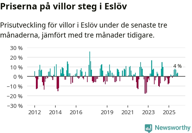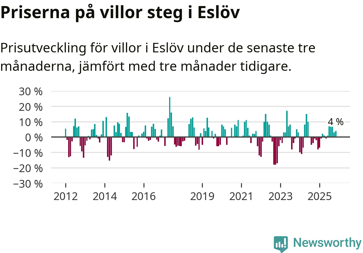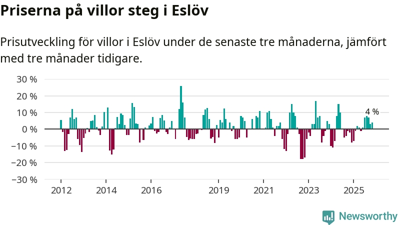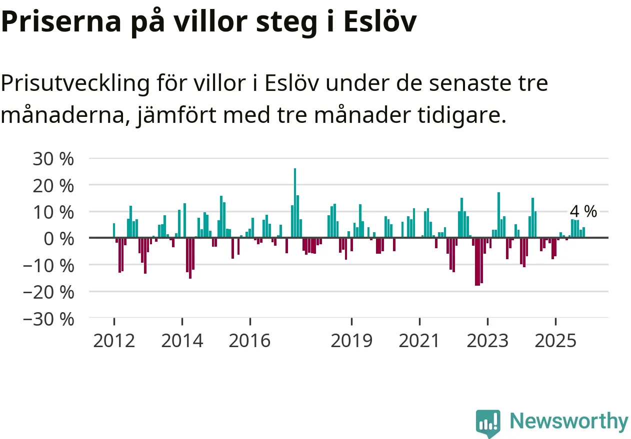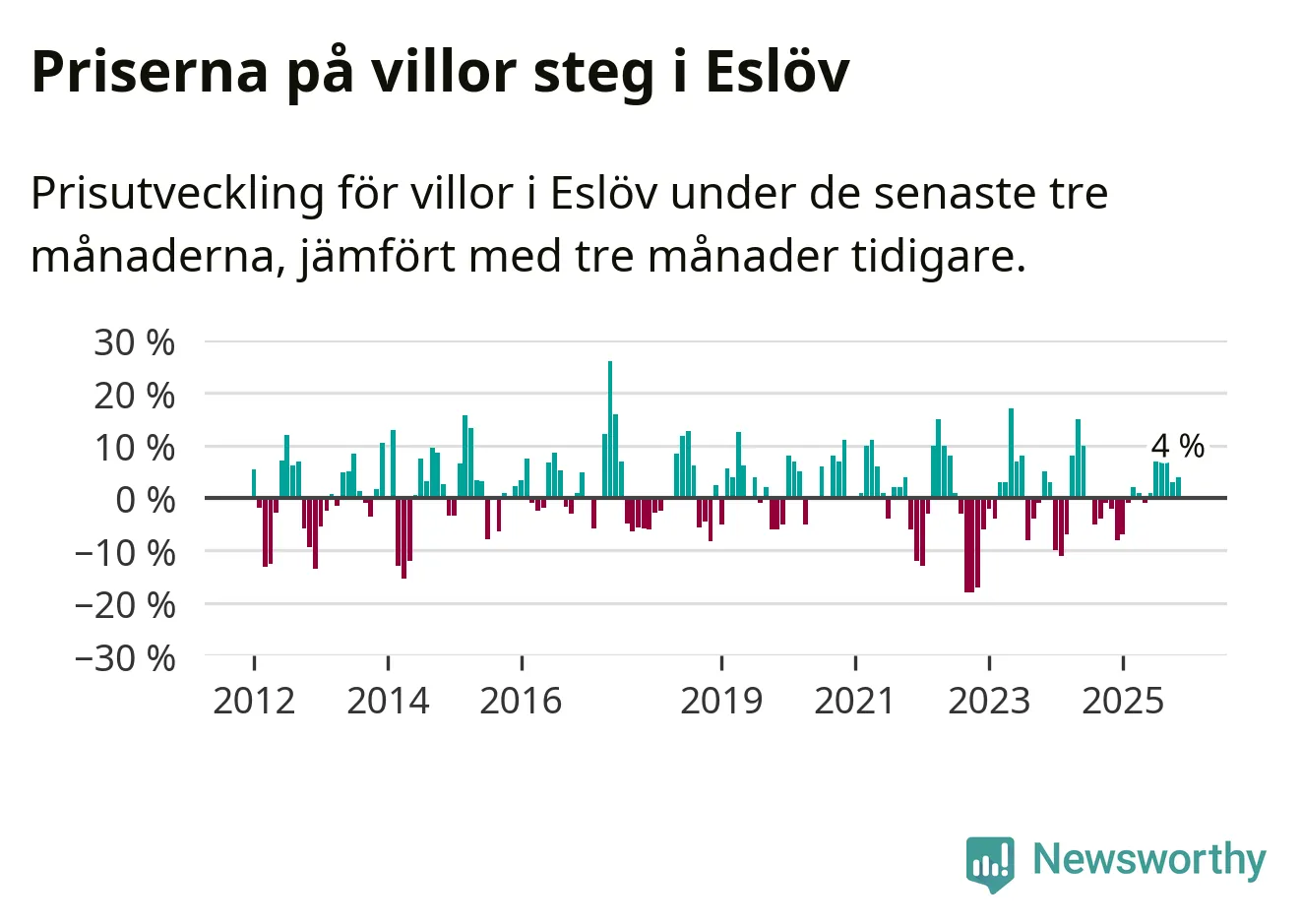 Villapriserna har gått upp i Eslövs kommun. Medelpriset på försäljningarna under de senaste tre månaderna visar på en uppgång med 4 procent.