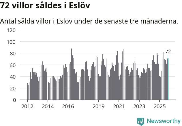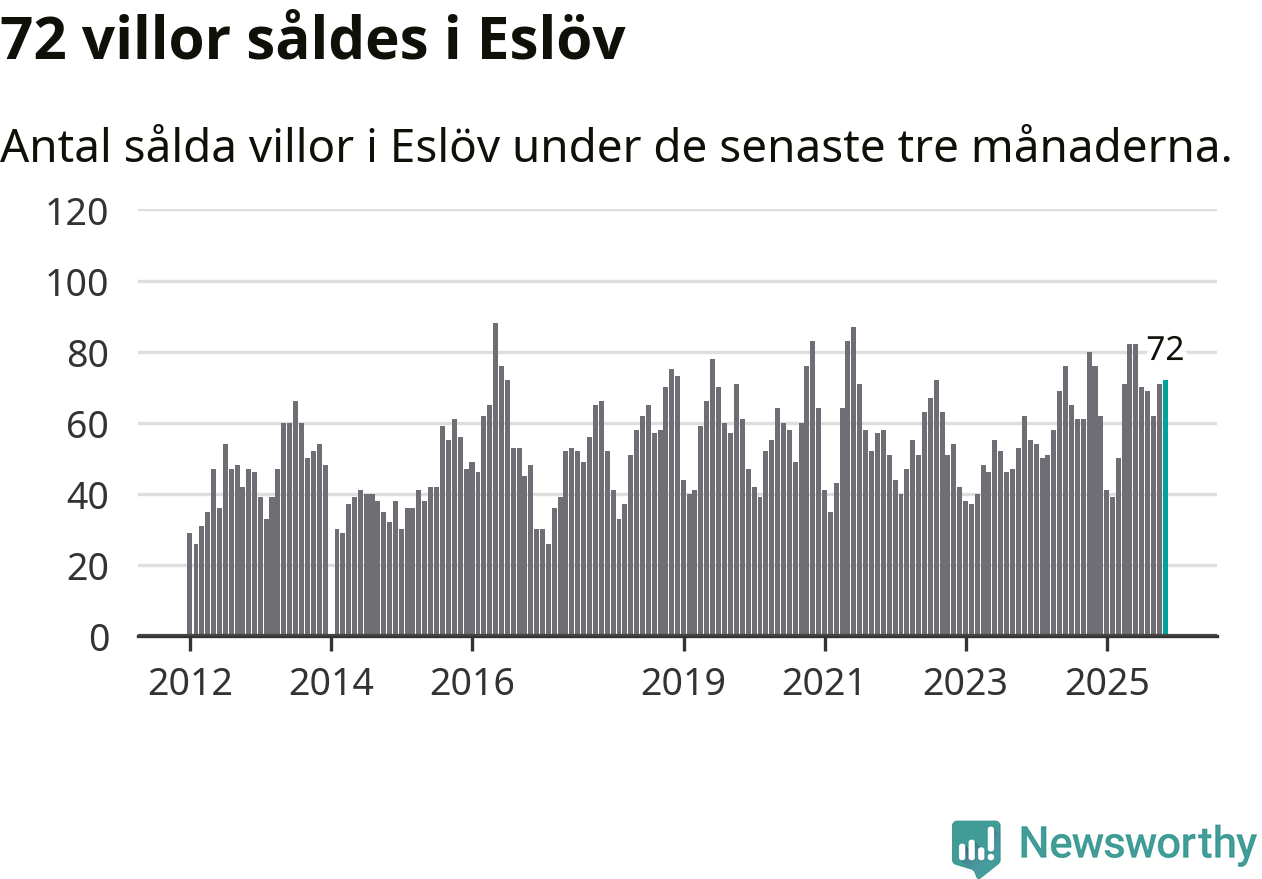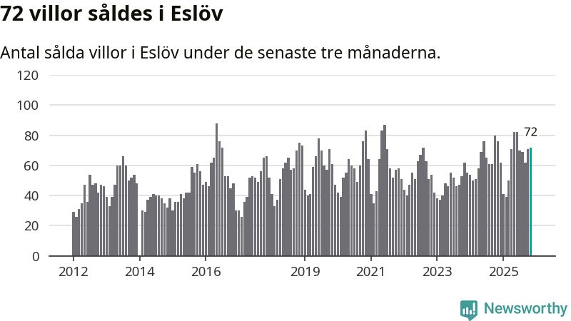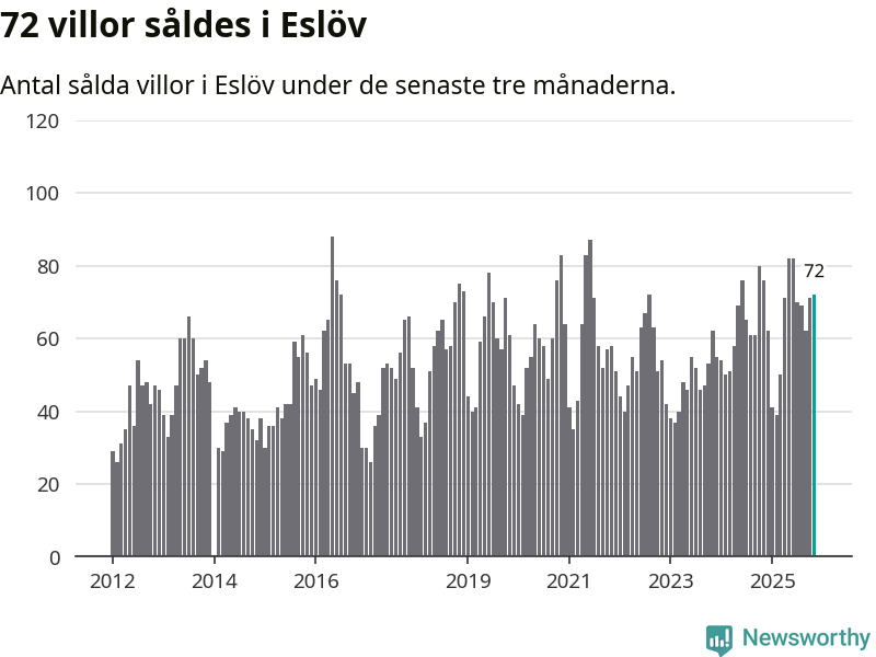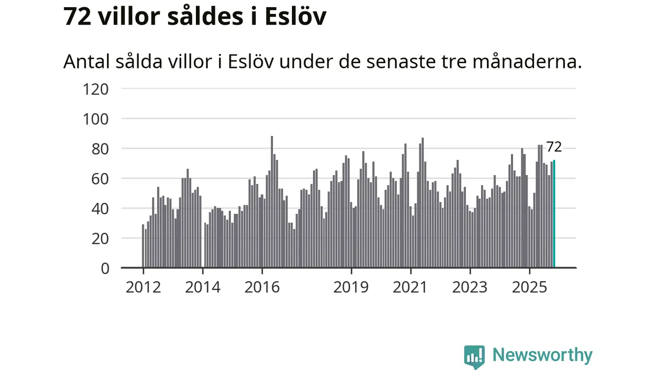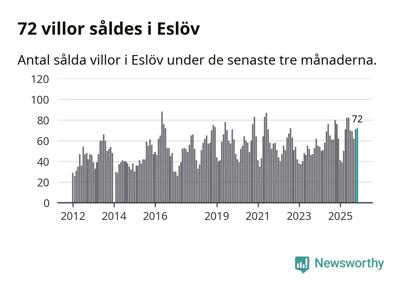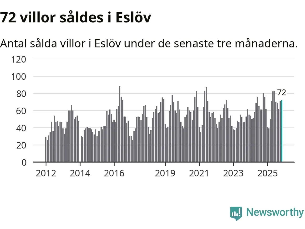 Sammanlagt såldes 72 villor i Eslövs kommun mellan september och november till ett genomsnittligt pris på 3,5 miljoner kronor. I fjol gjordes 76 affärer vid den här tiden på året.