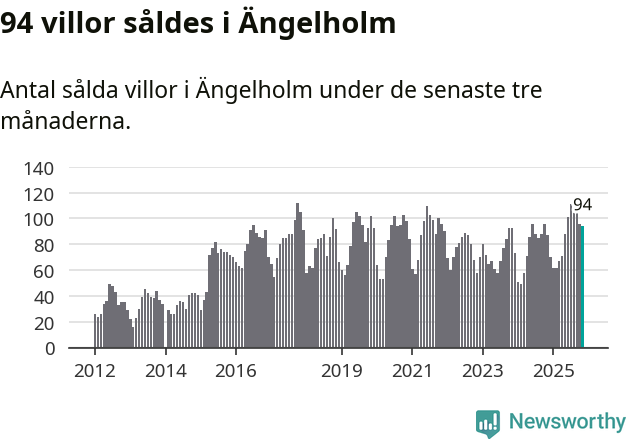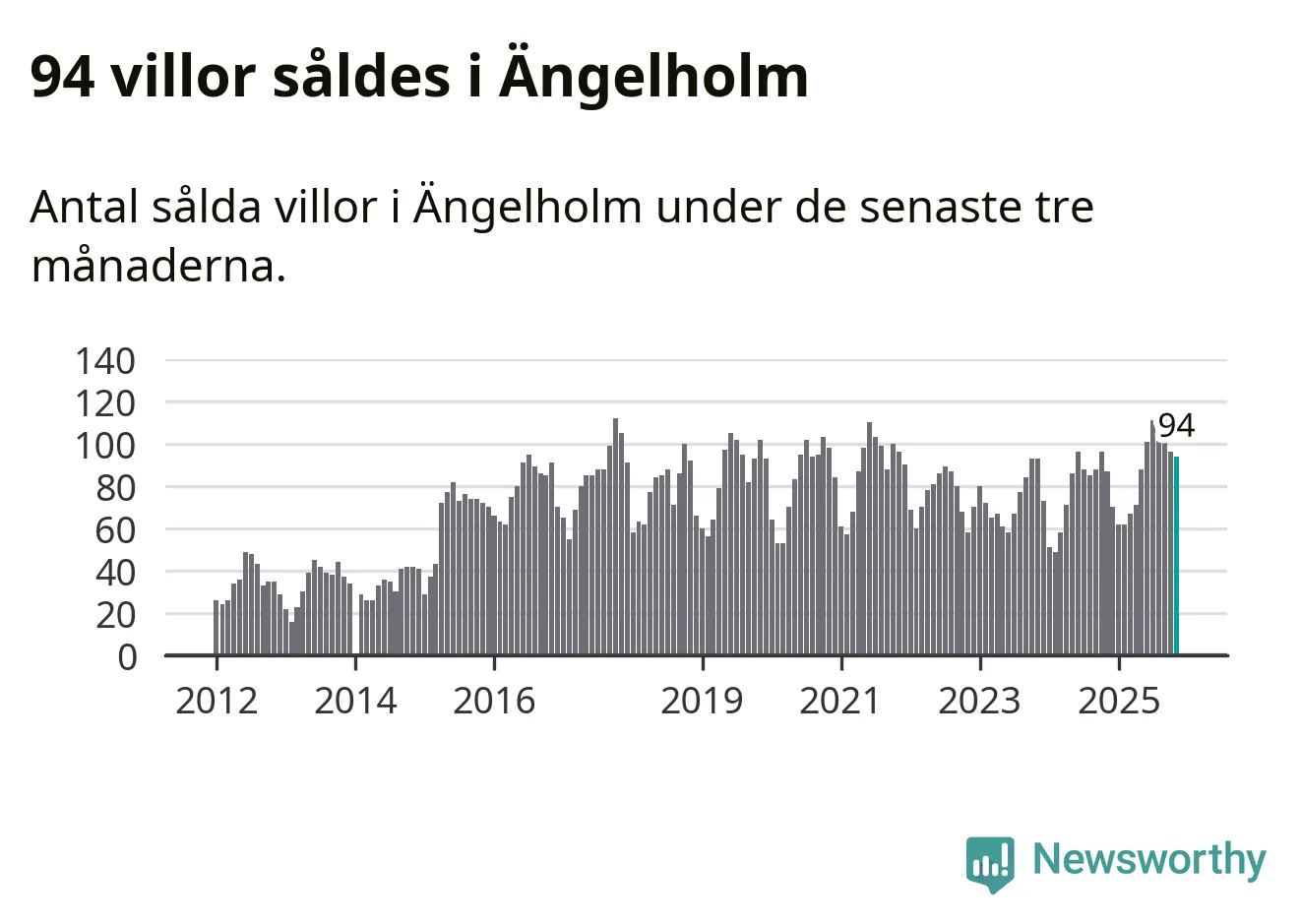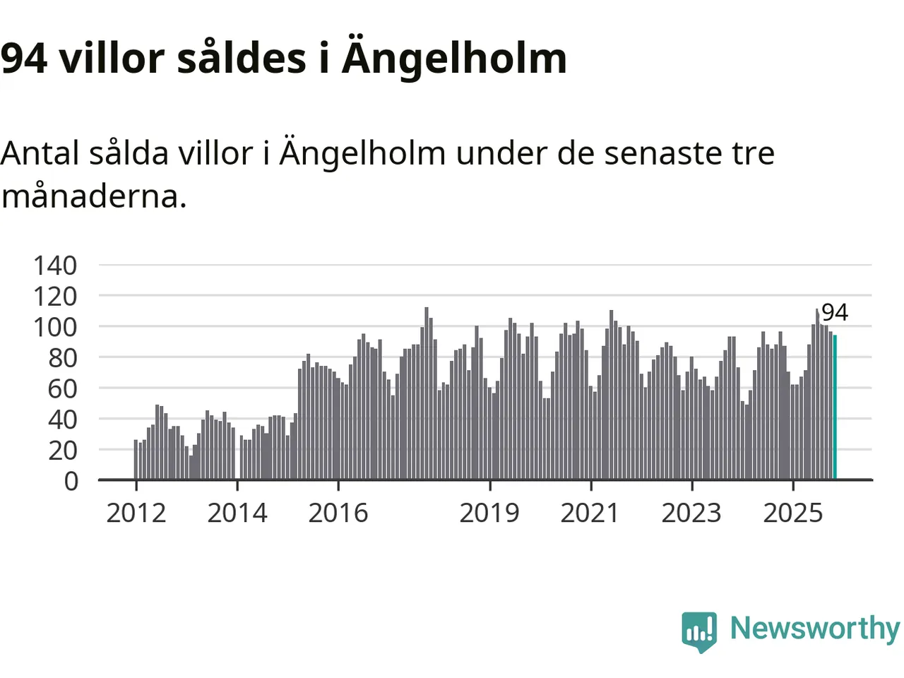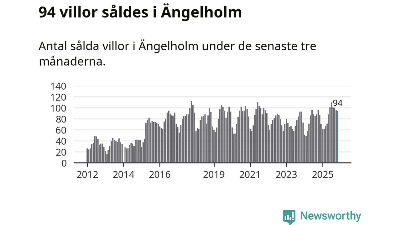 Sammanlagt såldes 94 villor i Ängelholms kommun mellan september och november till ett genomsnittligt pris på 4,0 miljoner kronor. I fjol gjordes 87 affärer vid den här tiden på året.