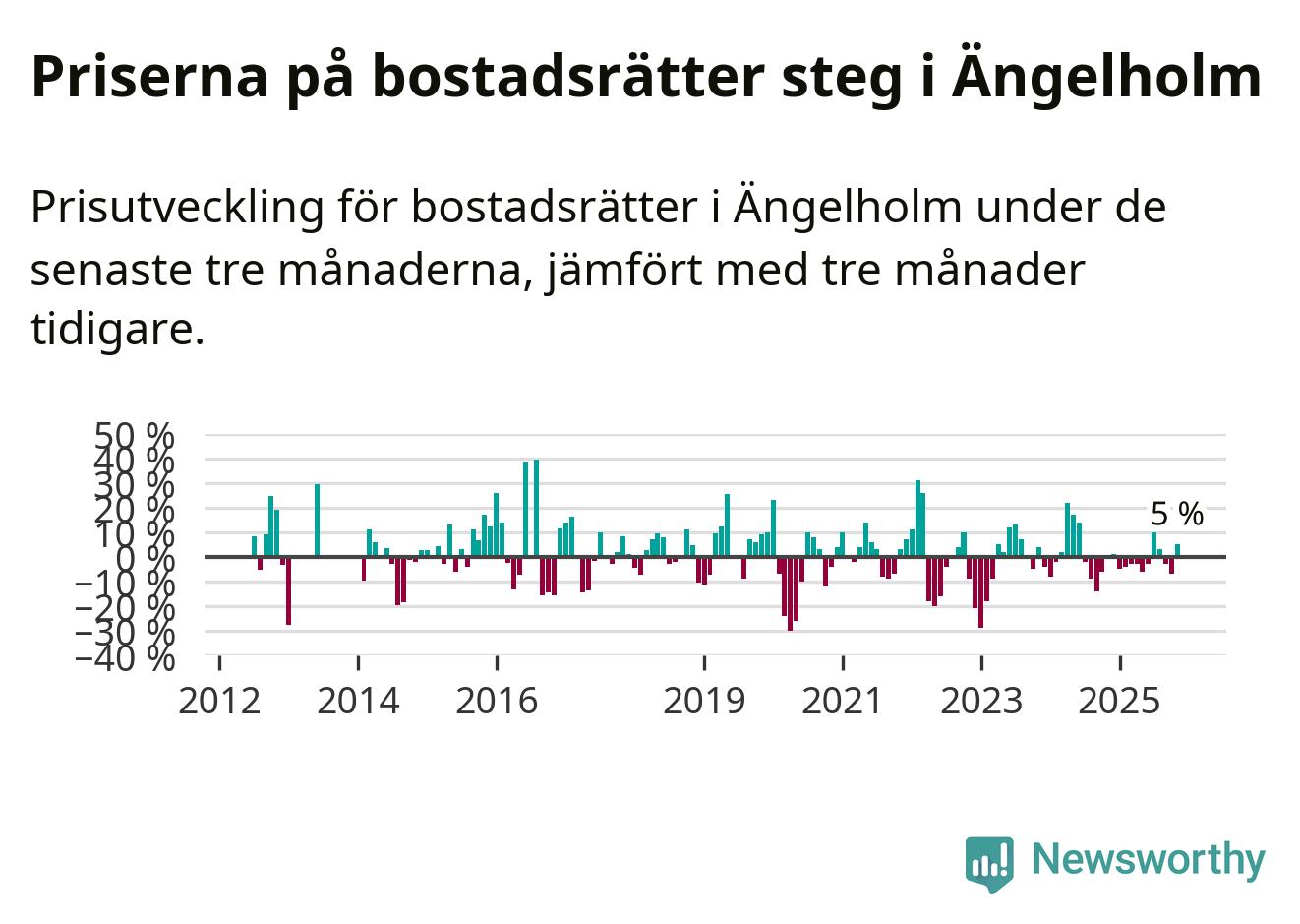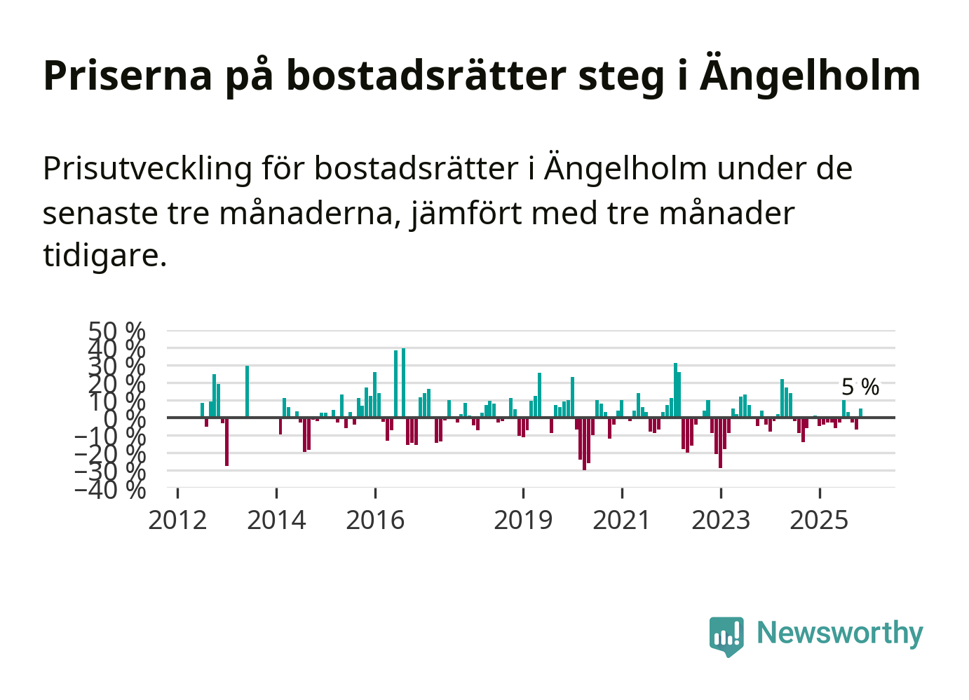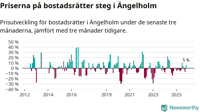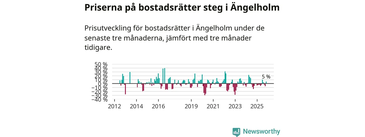Priserna på bostadsrätter har gått upp i Ängelholms kommun. Medelpriset på försäljningarna under de senaste tre månaderna visar på en uppgång med 5 procent.