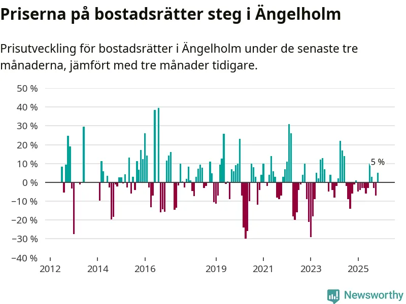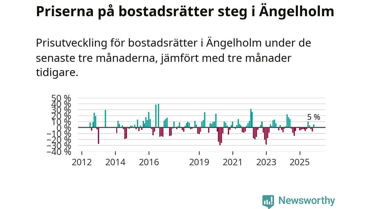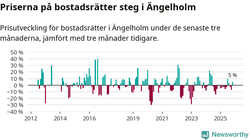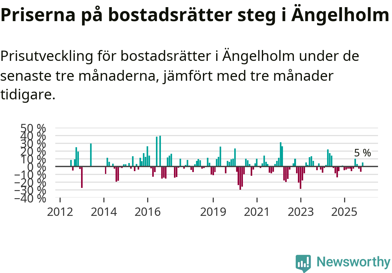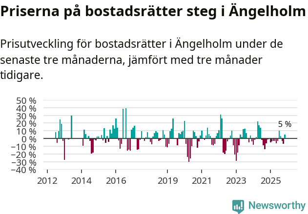 Priserna på bostadsrätter har gått upp i Ängelholms kommun. Medelpriset på försäljningarna under de senaste tre månaderna visar på en uppgång med 5 procent.