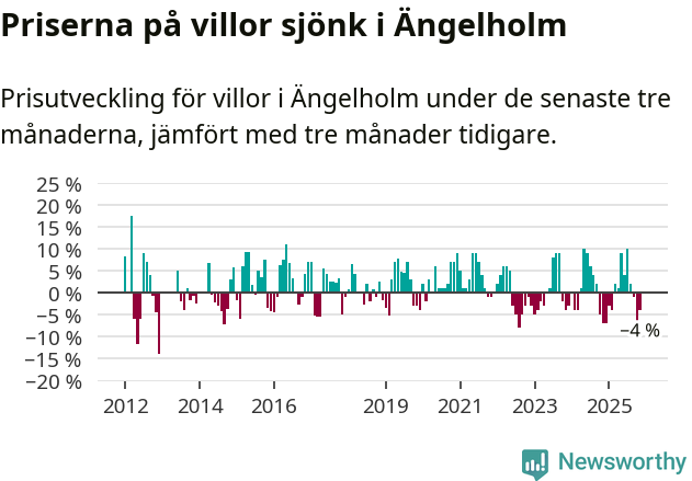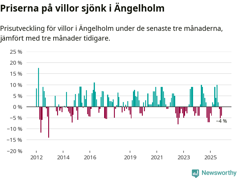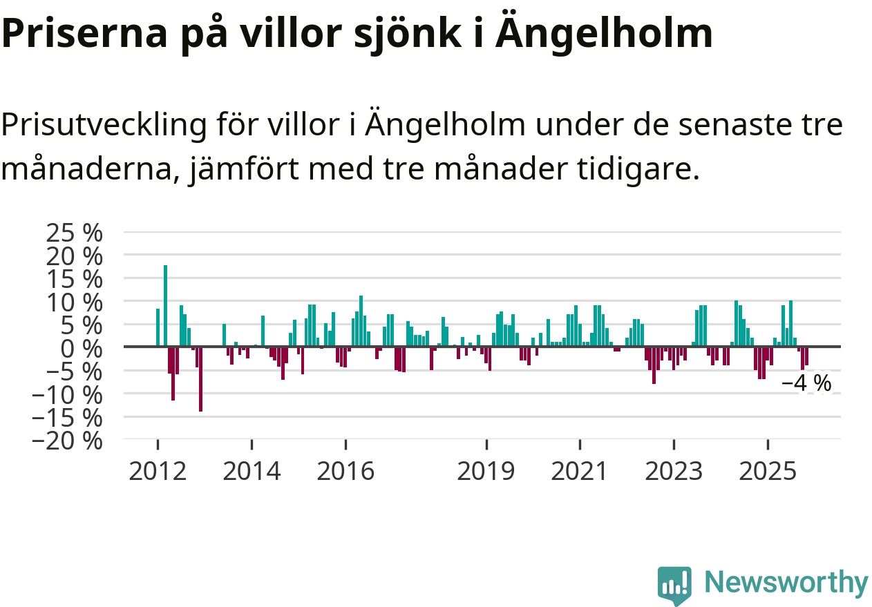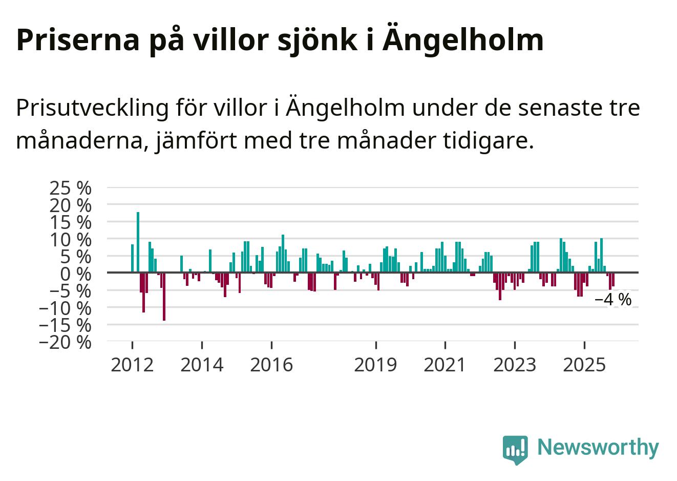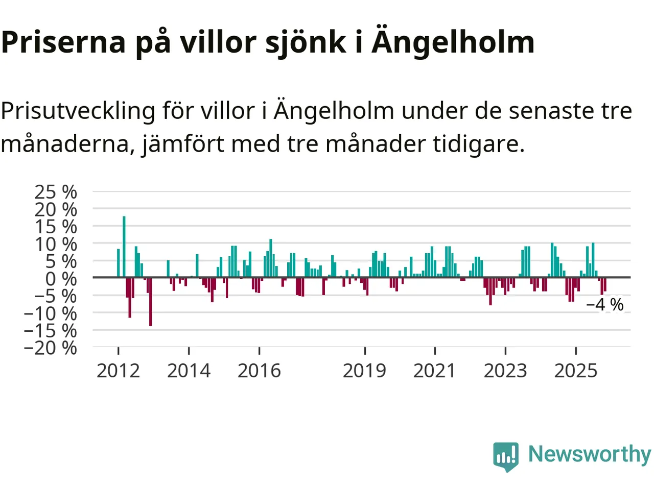 Villapriserna har gått ner i Ängelholms kommun. Medelpriset på försäljningarna under de senaste tre månaderna visar på en nedgång med 4 procent.