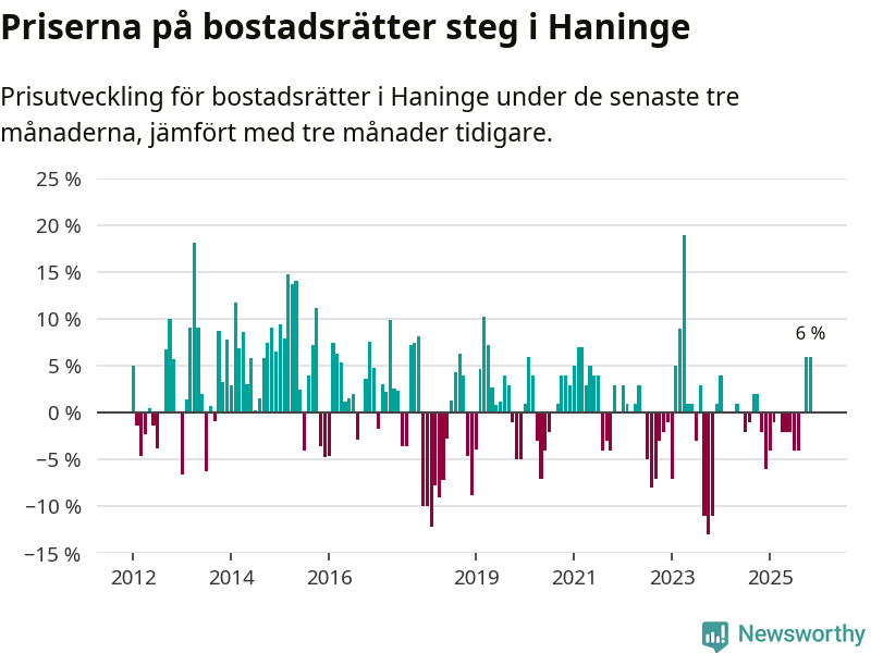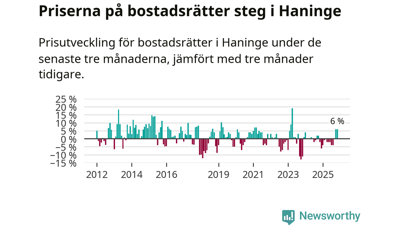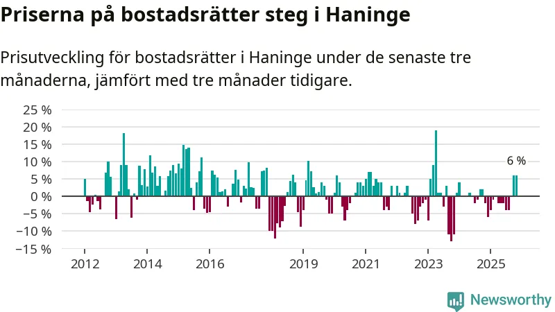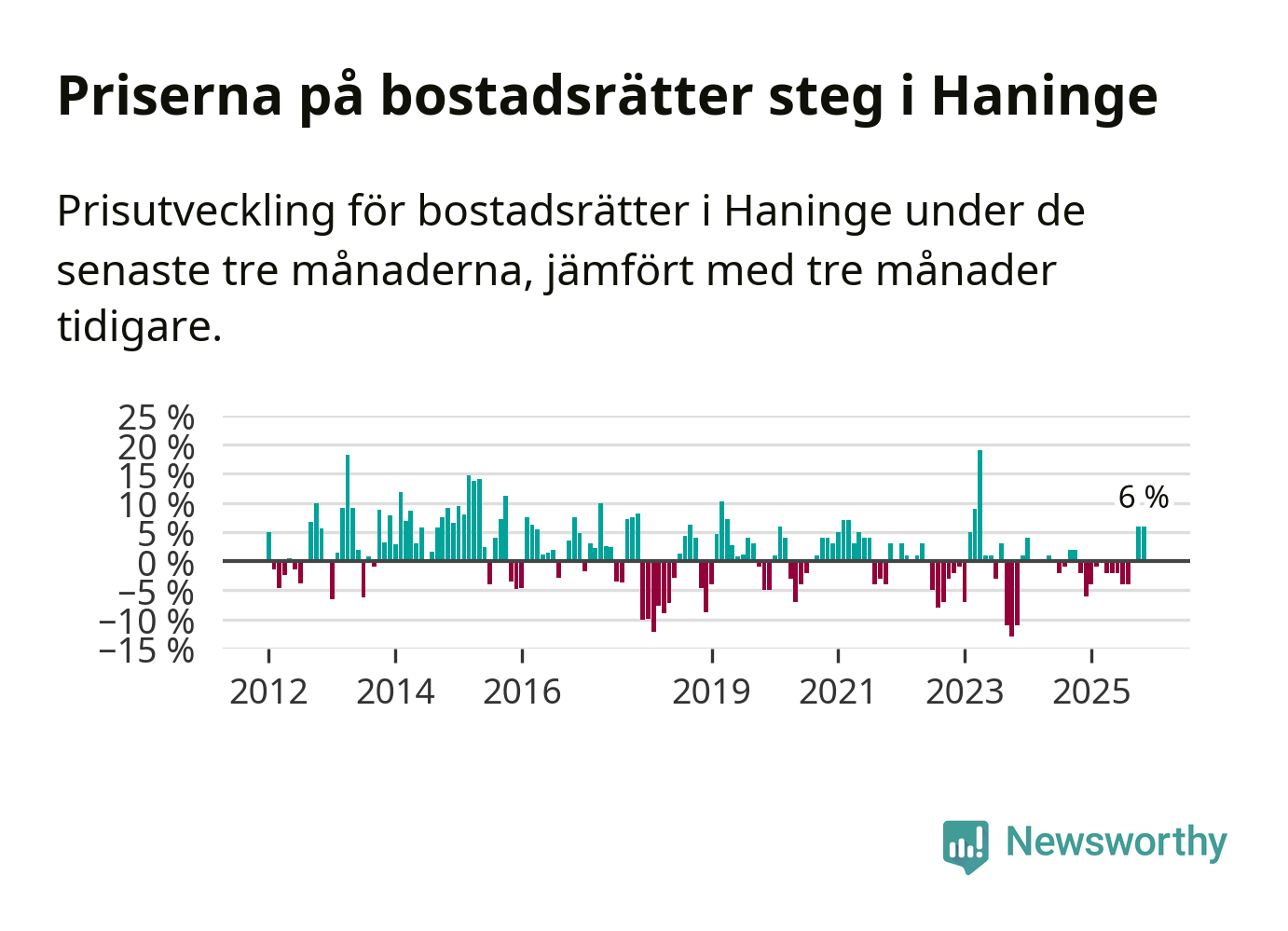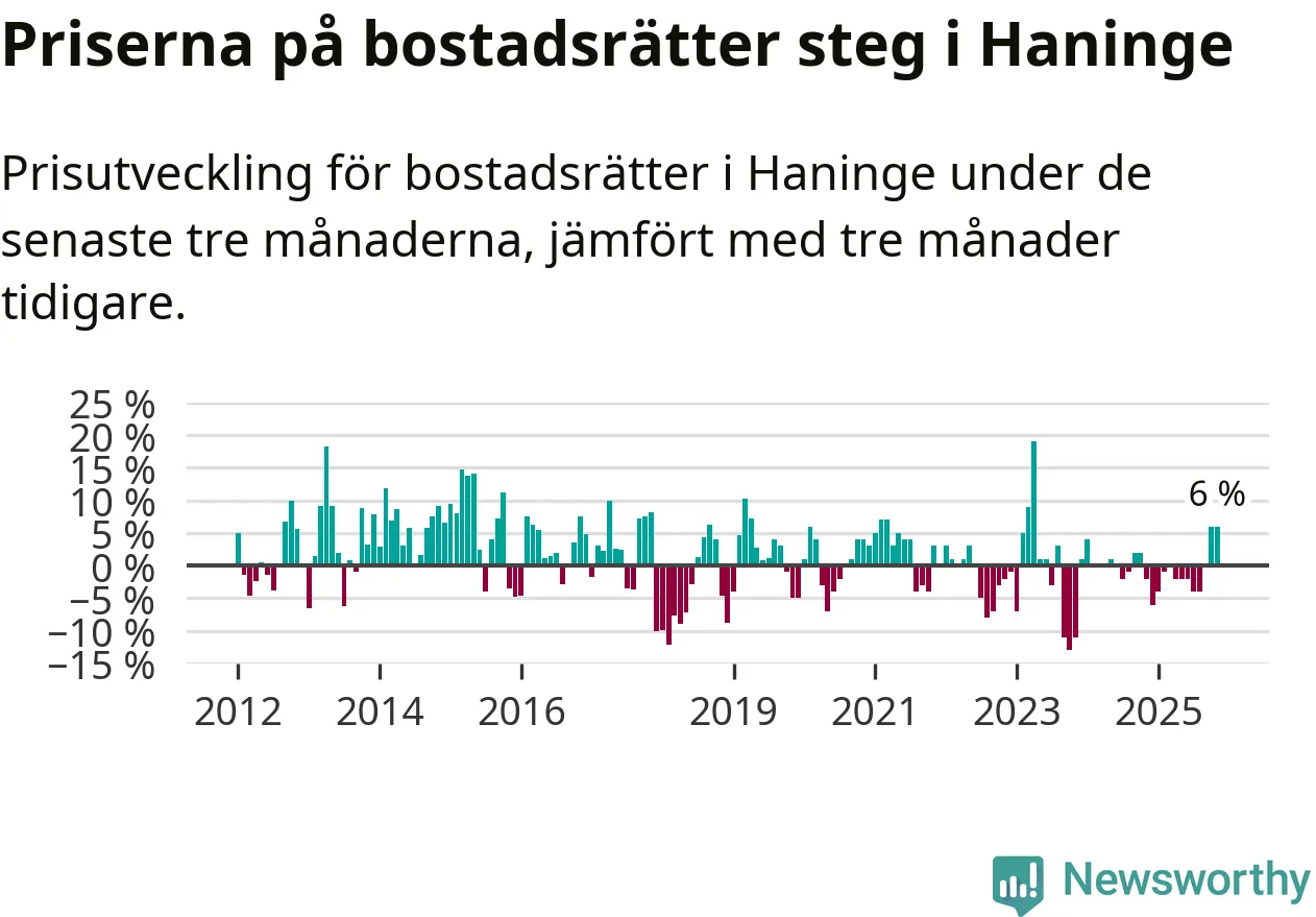 Priserna på bostadsrätter har gått upp i Haninge kommun. Medelpriset på försäljningarna under de senaste tre månaderna visar på en uppgång med 6 procent.
