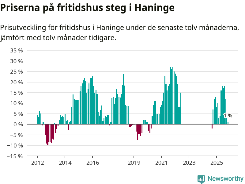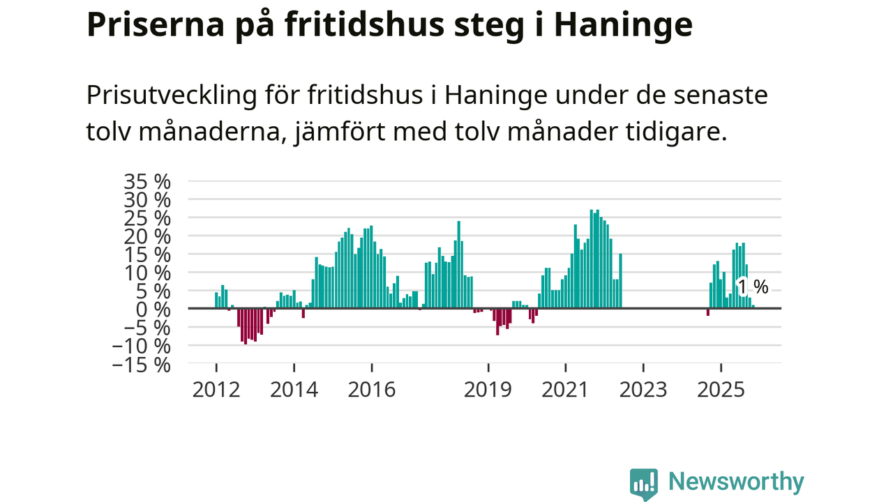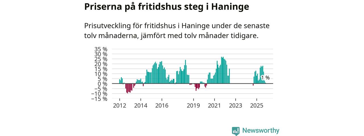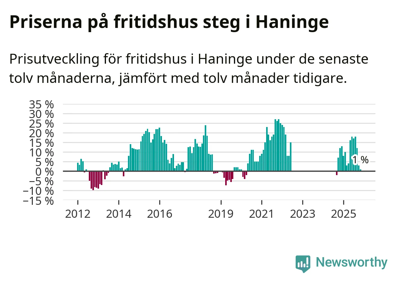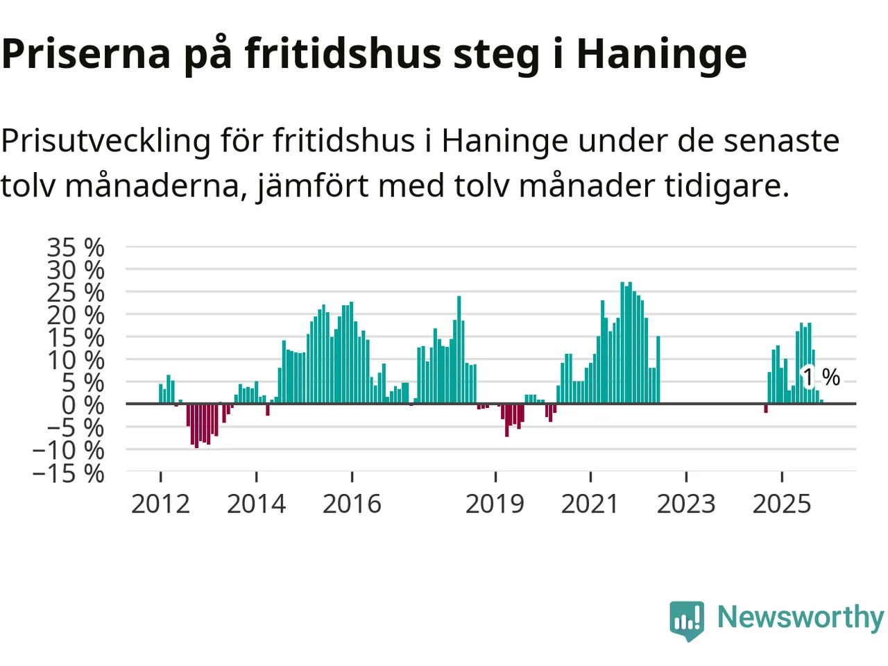 Priserna på fritidshus har gått upp i Haninge kommun. Medelpriset på försäljningarna under de senaste tolv månaderna visar på en uppgång med 1 procent.