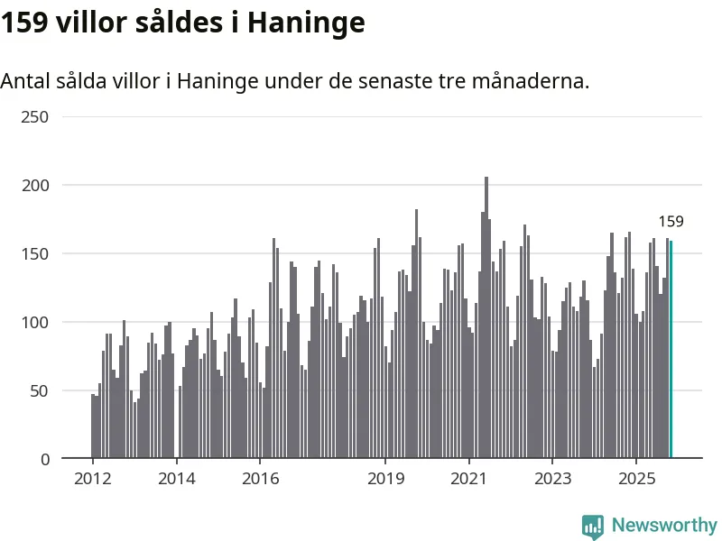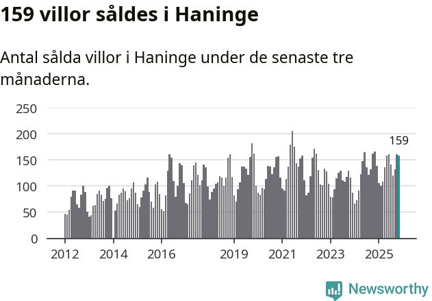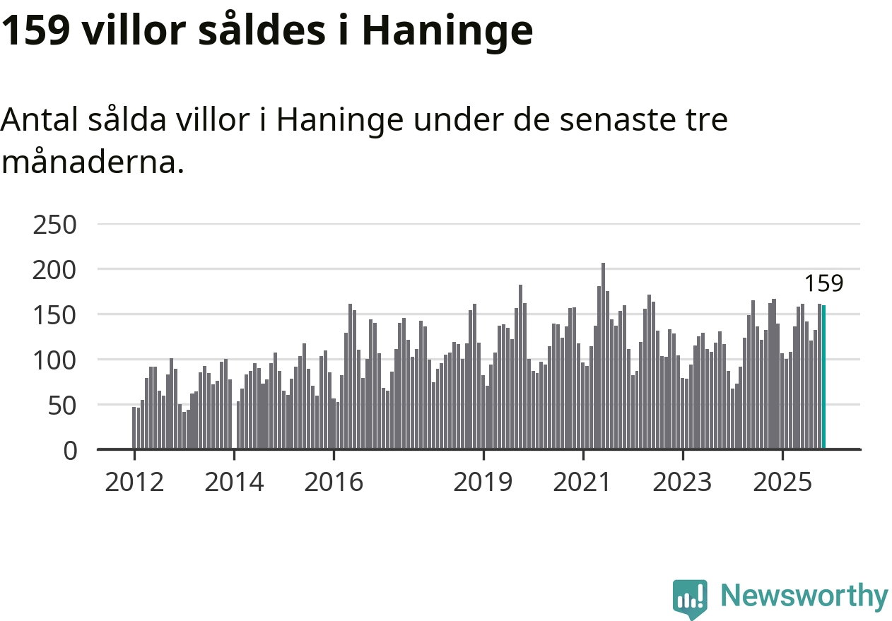 Sammanlagt såldes 159 villor i Haninge kommun mellan september och november till ett genomsnittligt pris på 5,3 miljoner kronor. I fjol gjordes 166 affärer vid den här tiden på året.