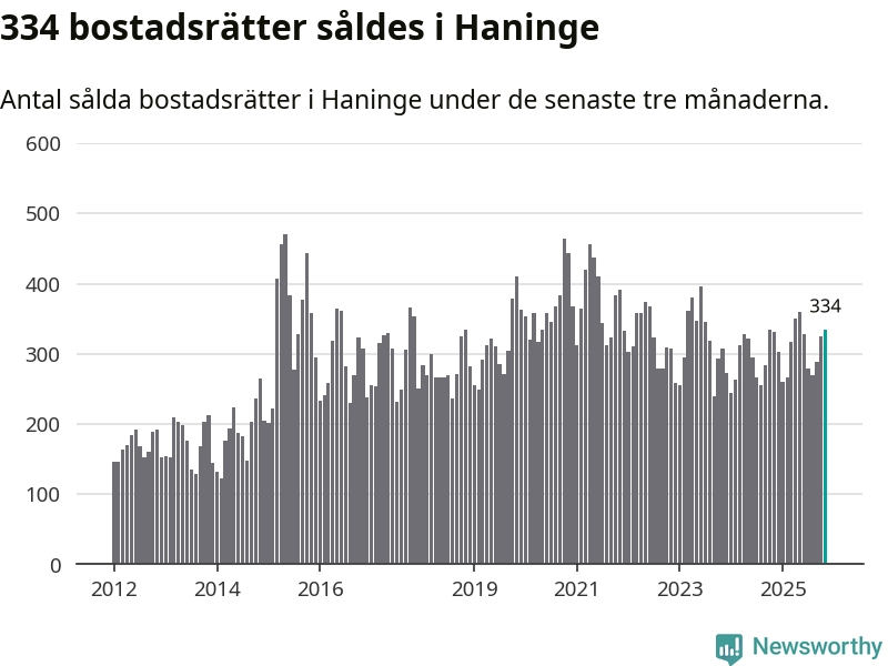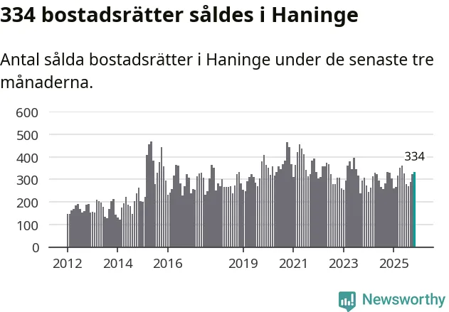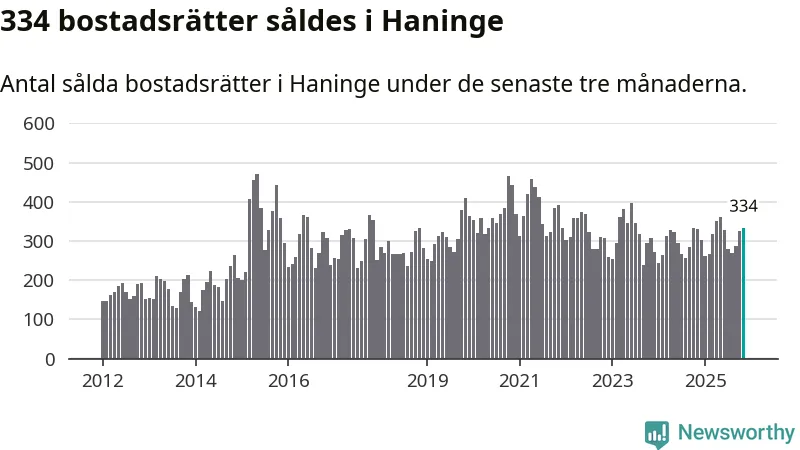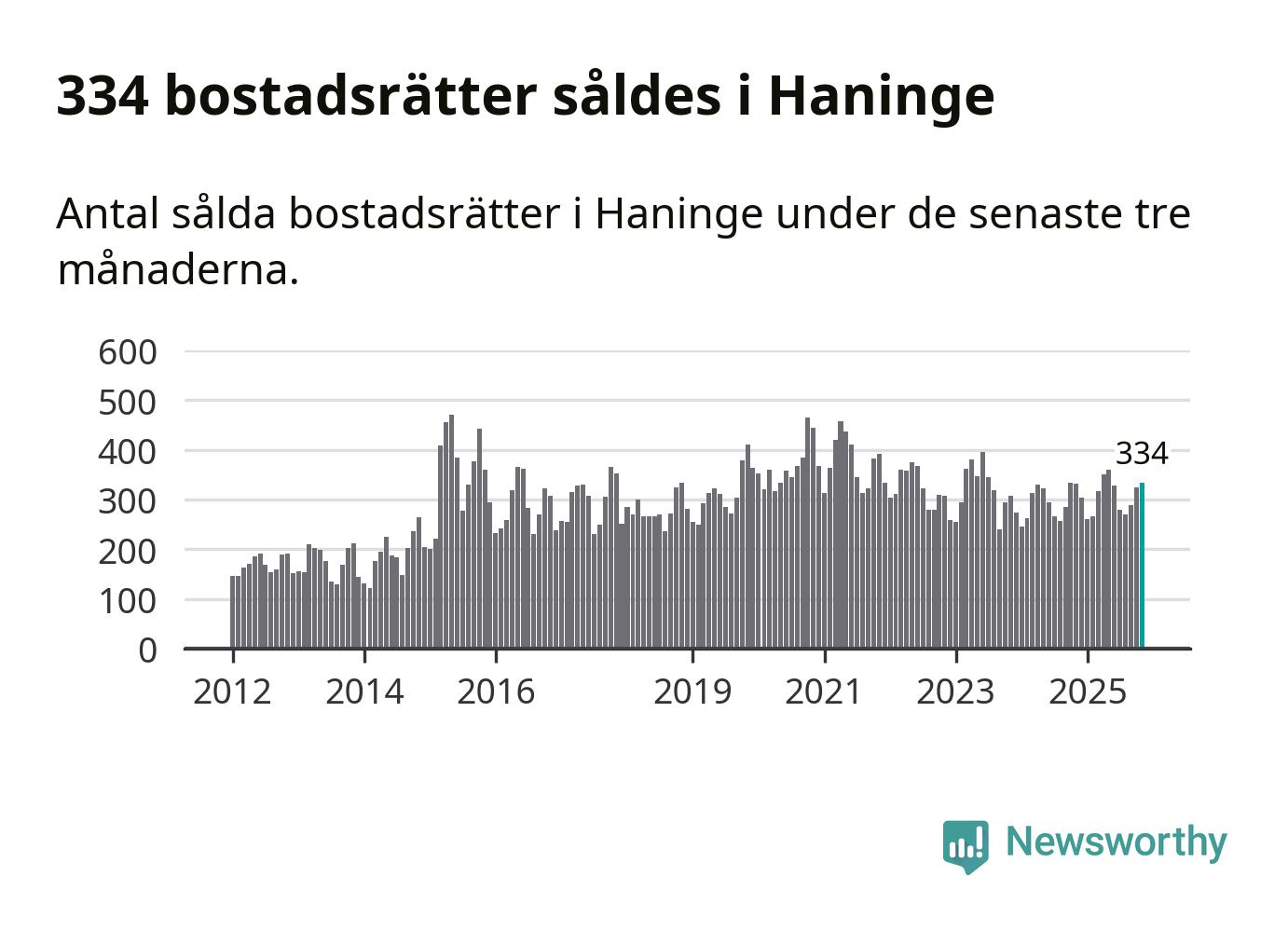 Sammanlagt såldes 334 bostadsrätter i Haninge kommun mellan september och november till ett genomsnittligt pris på 2,4 miljoner kronor. I fjol gjordes 331 affärer vid den här tiden på året.