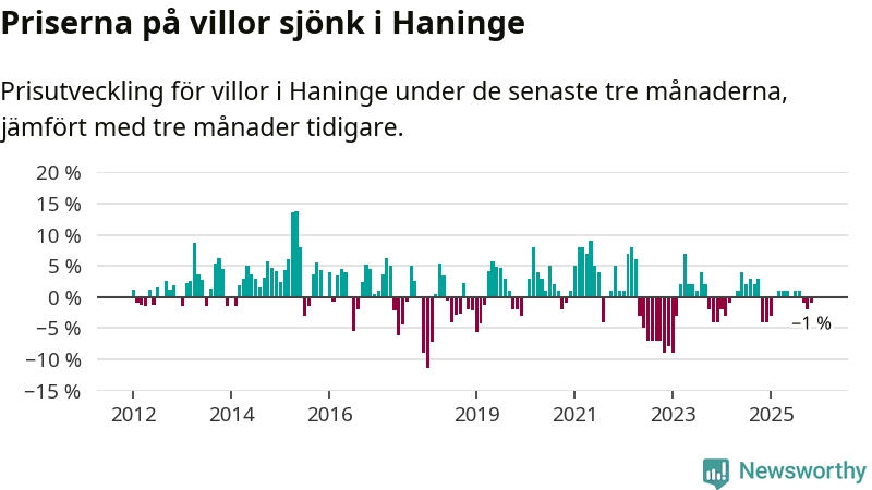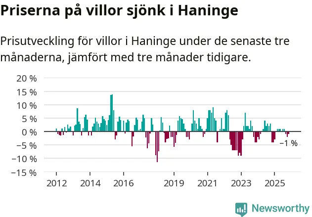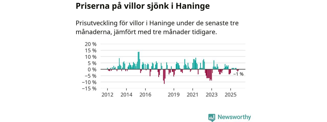 Villapriserna har gått ner i Haninge kommun. Medelpriset på försäljningarna under de senaste tre månaderna visar på en nedgång med 1 procent.