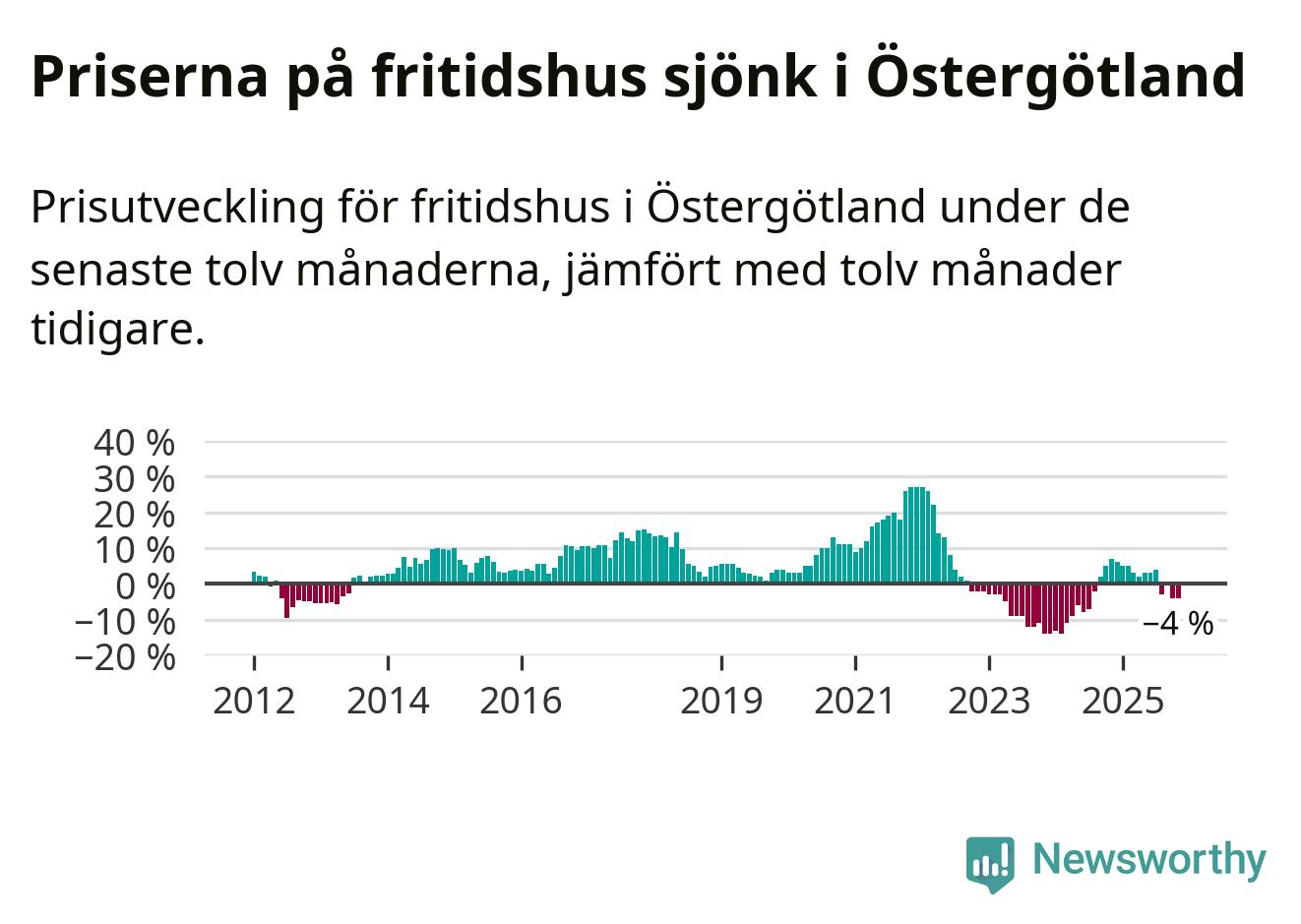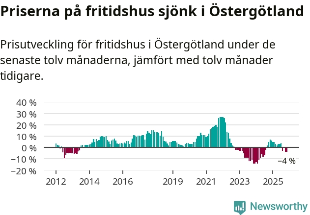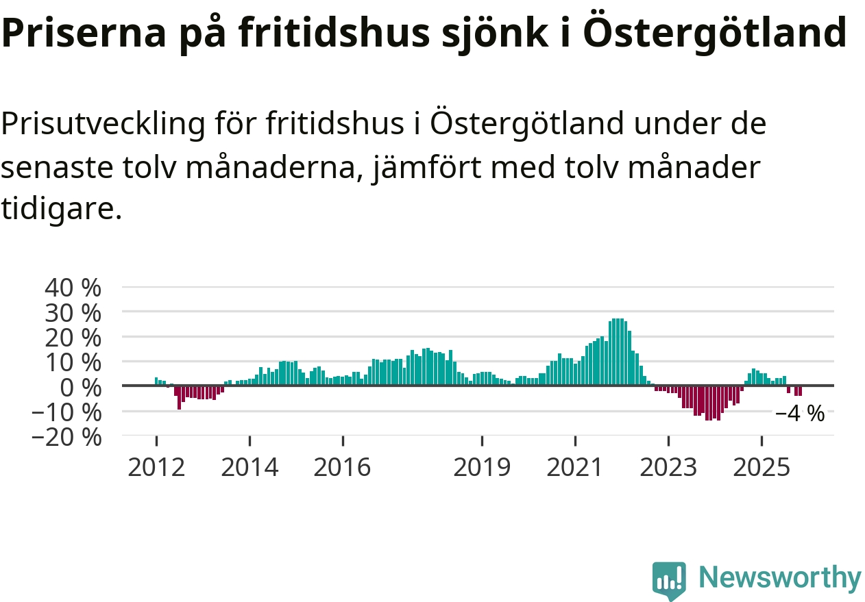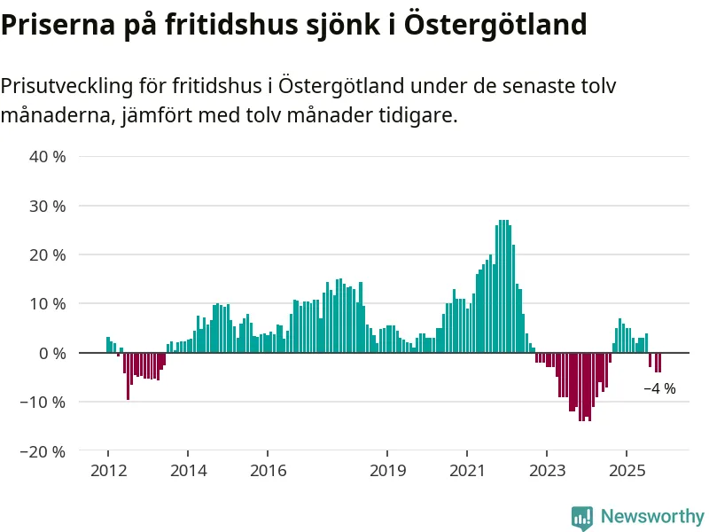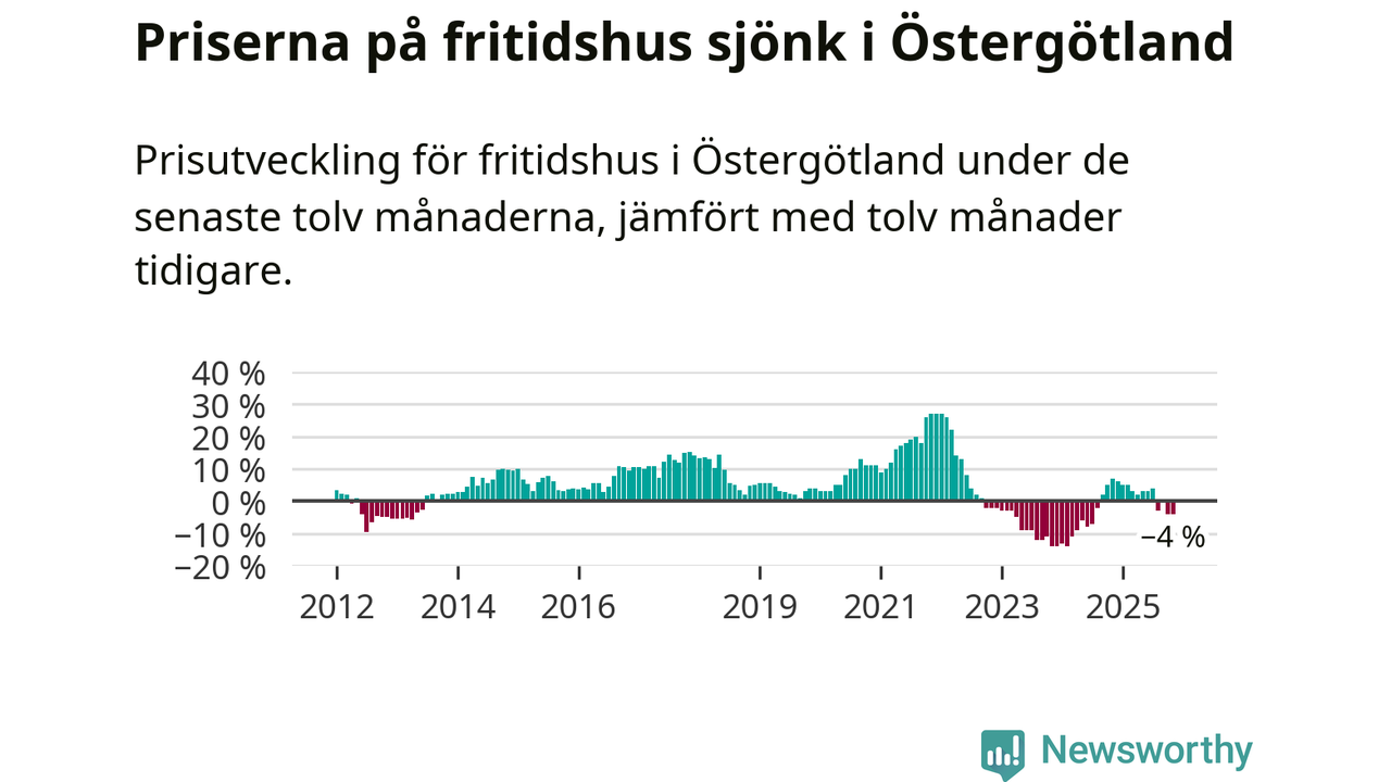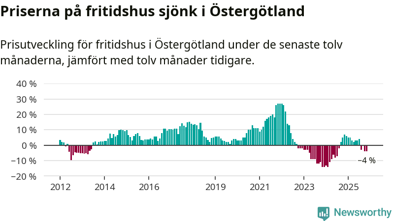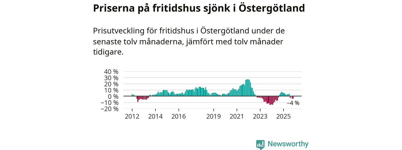 Priserna på fritidshus har gått ner i Östergötlands län. Medelpriset på försäljningarna under de senaste tolv månaderna visar på en nedgång med 4 procent.