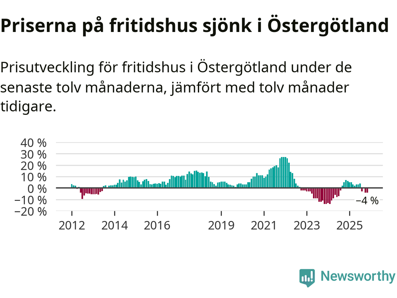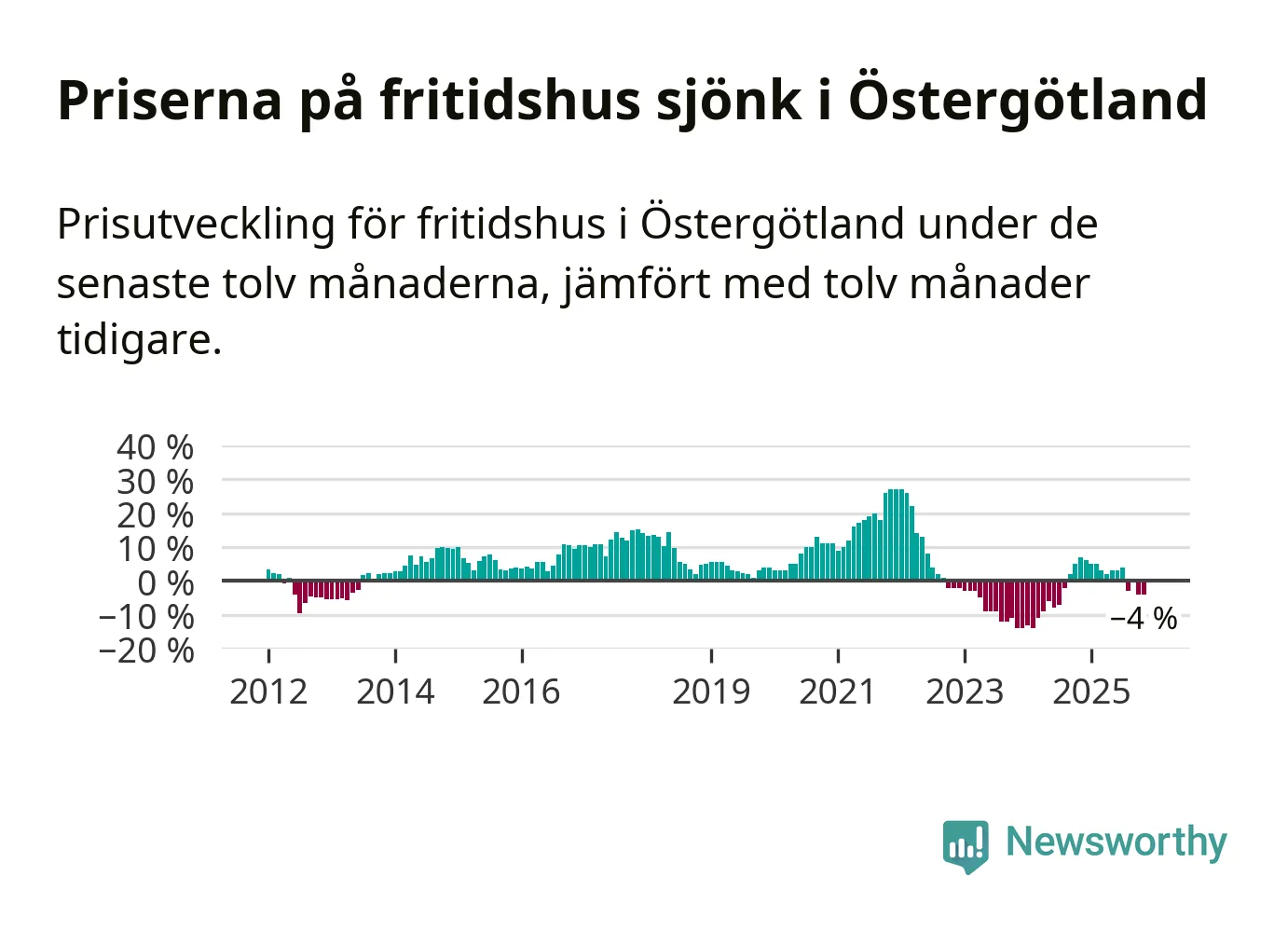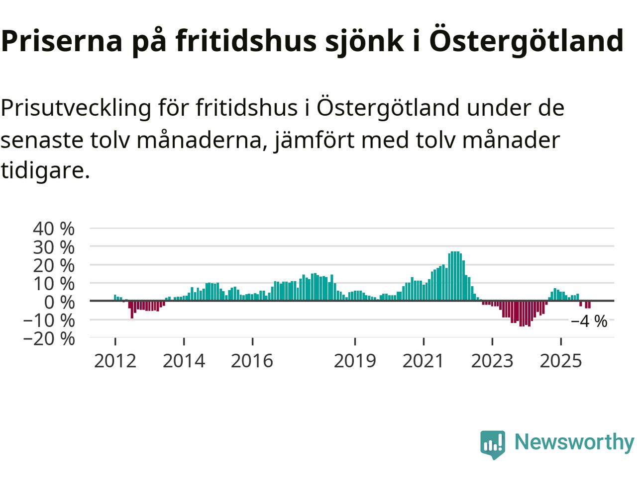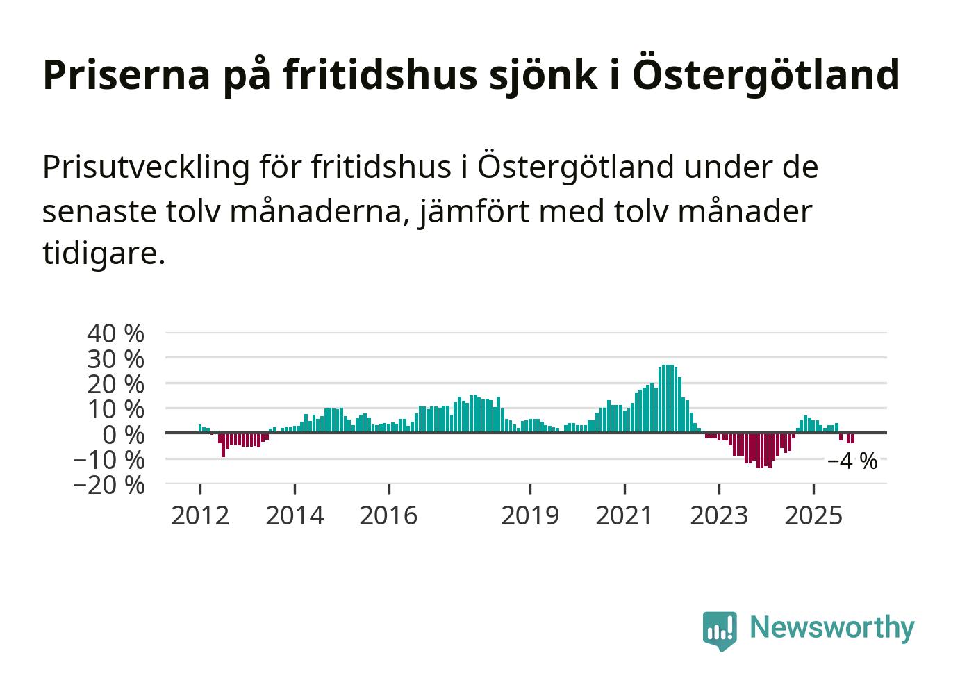 Priserna på fritidshus har gått ner i Östergötlands län. Medelpriset på försäljningarna under de senaste tolv månaderna visar på en nedgång med 4 procent.