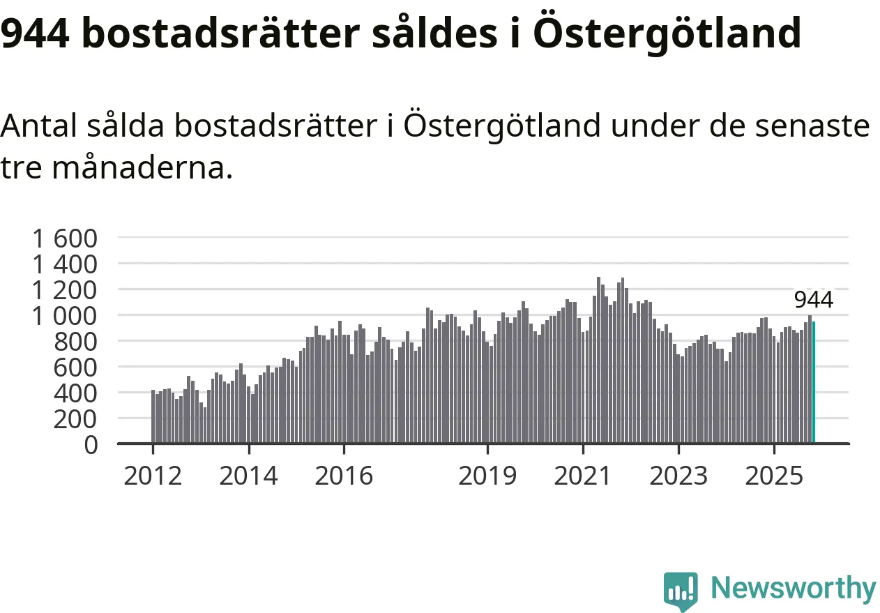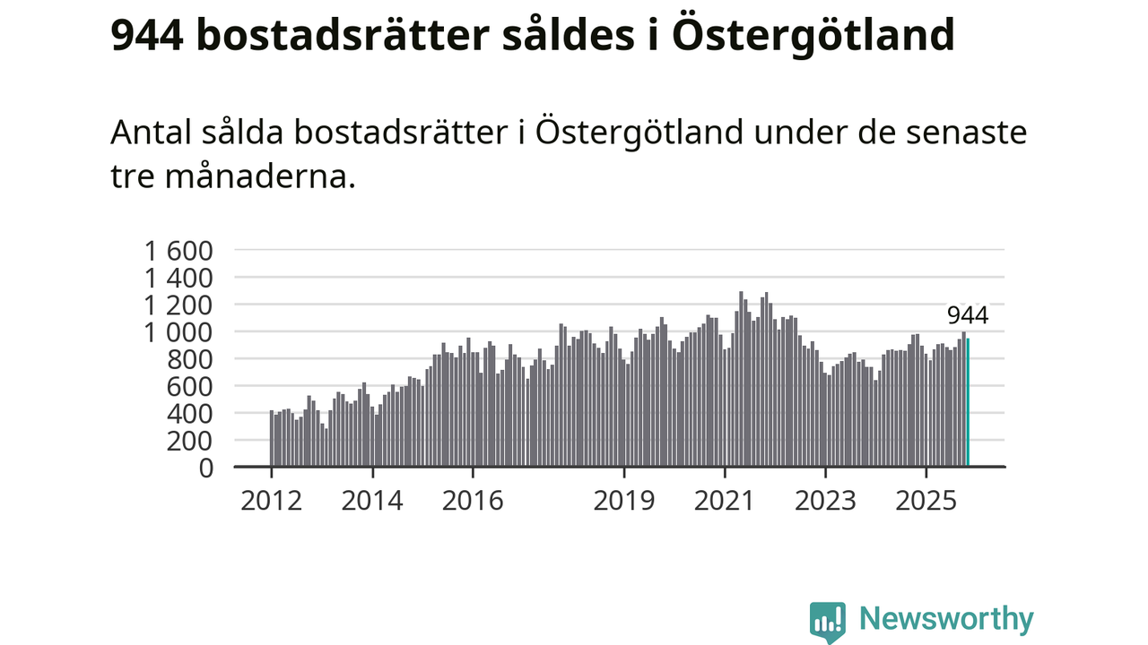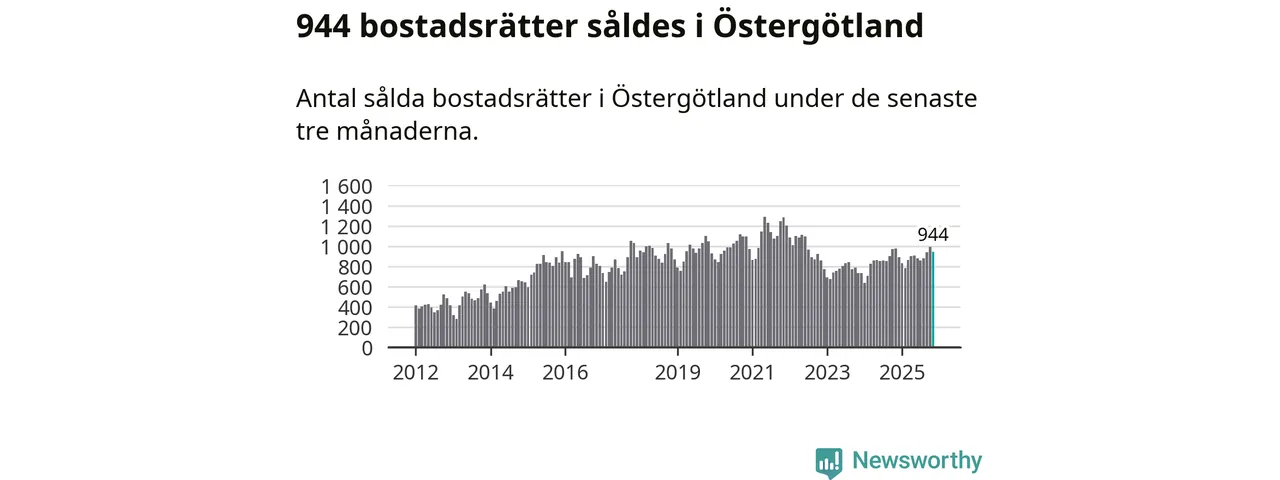 Sammanlagt såldes 944 bostadsrätter i Östergötlands län mellan september och november till ett genomsnittligt pris på 1,8 miljoner kronor. I fjol gjordes 979 affärer vid den här tiden på året.