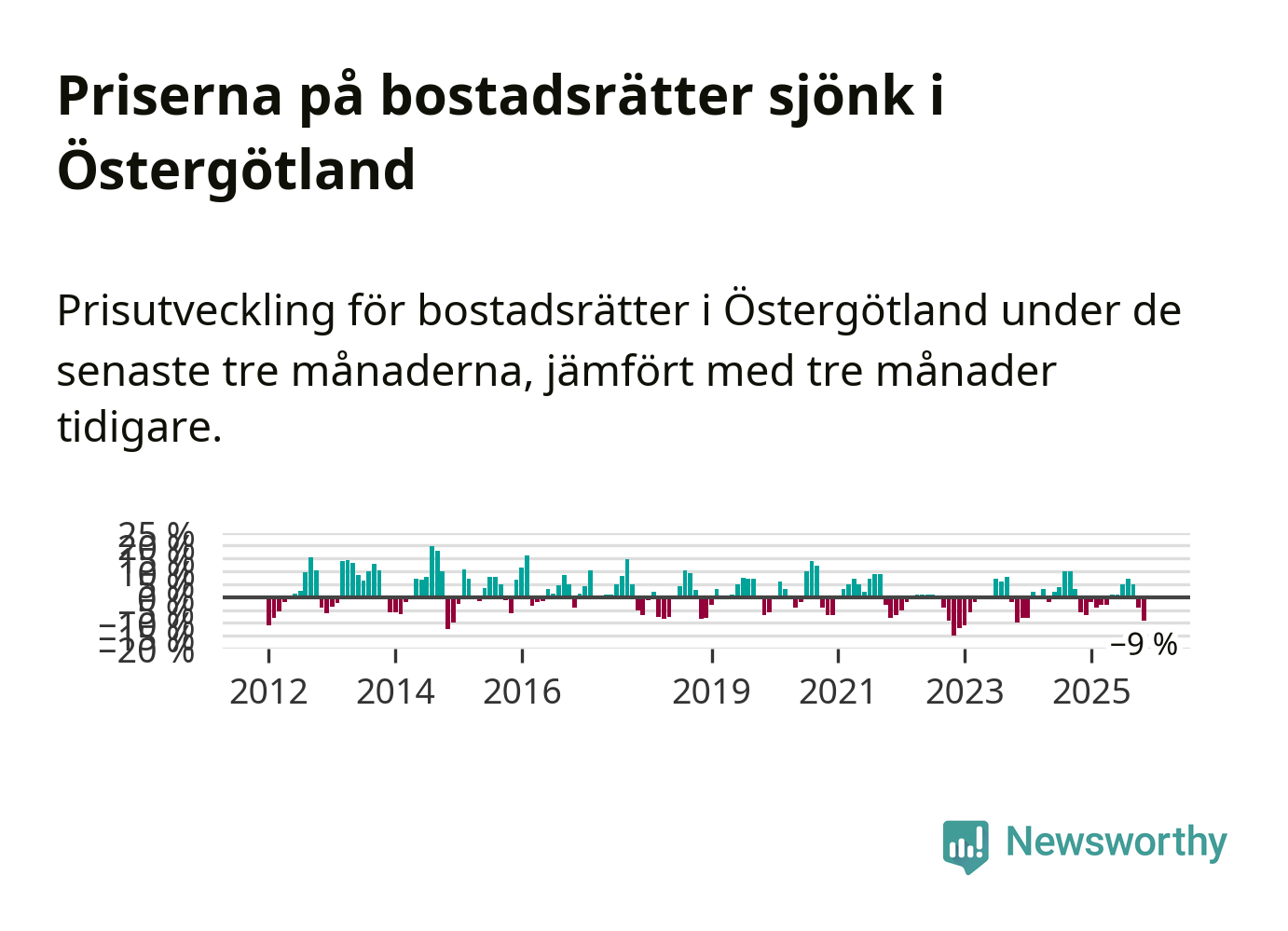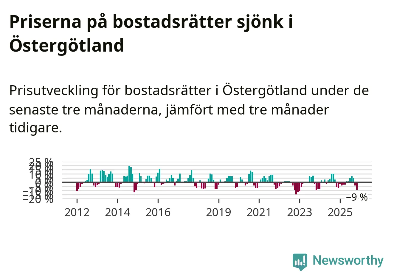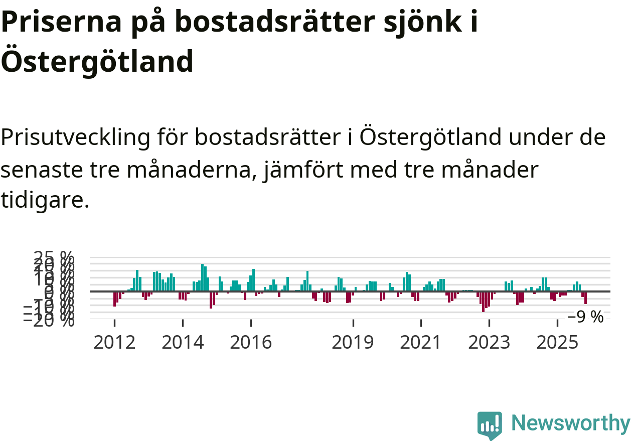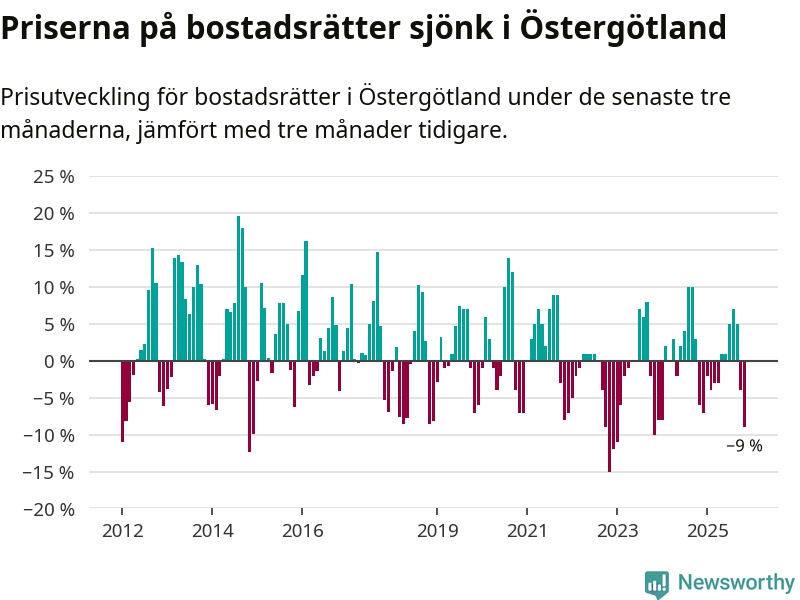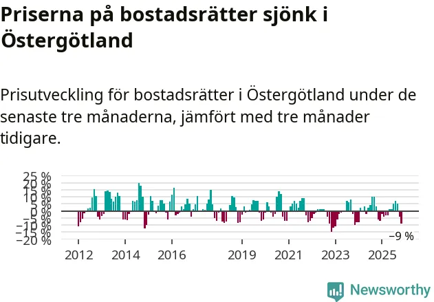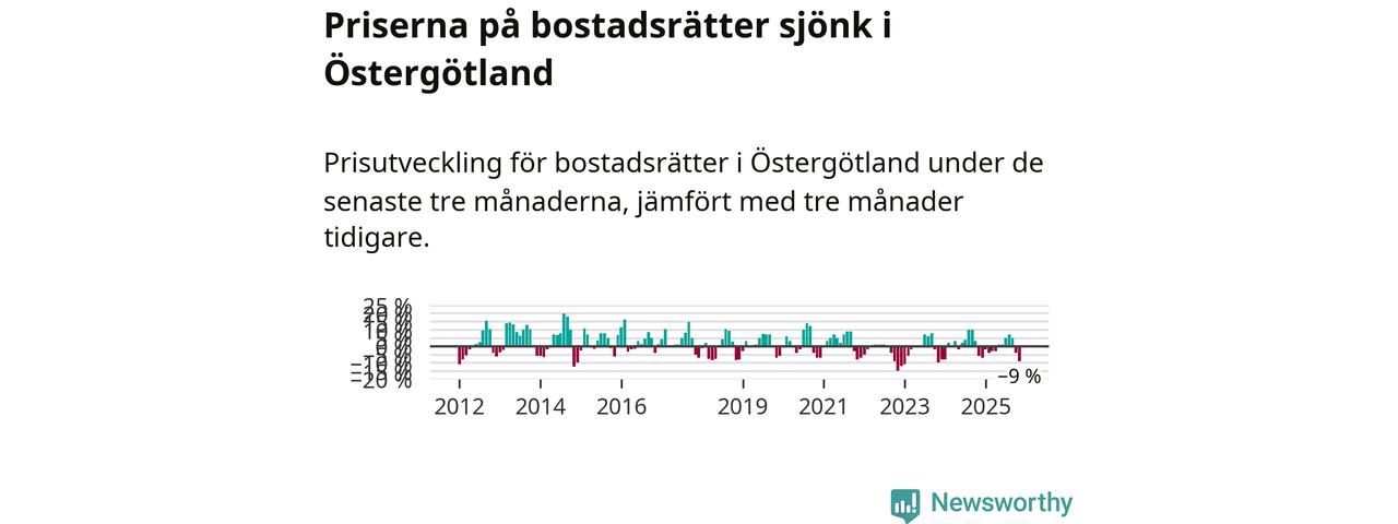 Priserna på bostadsrätter har gått ner i Östergötlands län. Medelpriset på försäljningarna under de senaste tre månaderna visar på en nedgång med 9 procent.
