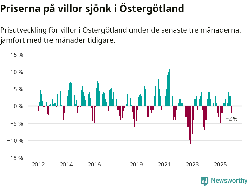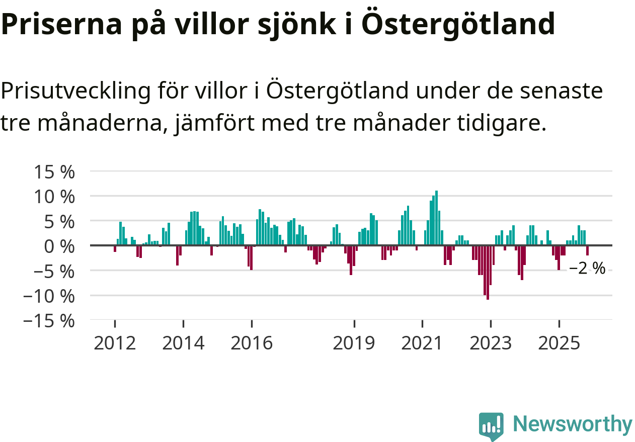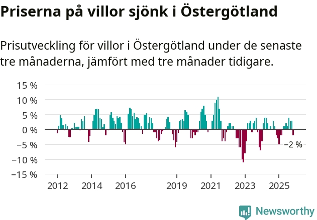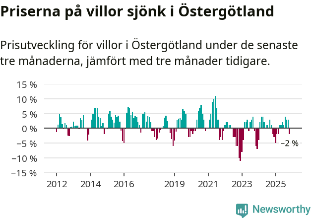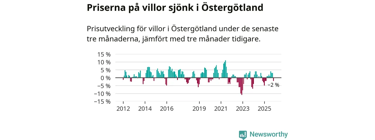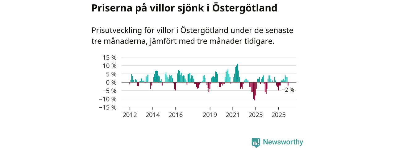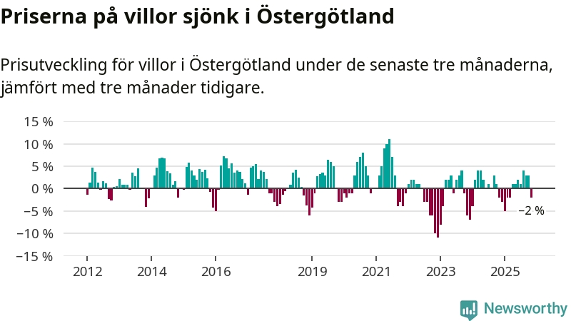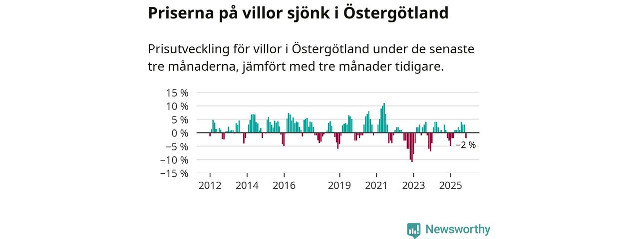 Statistiken visar även på en prisnedgång i Östergötlands län. Medelpriset på försäljningarna av villor i länet var 2 procent lägre än för tre månader sedan. Även i hela Sverige sjunker villapriserna. I hela riket noterades en prisnedgång på 2 procent.