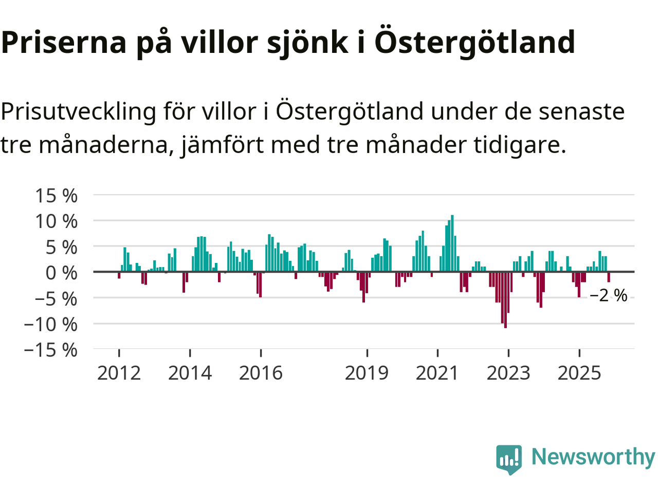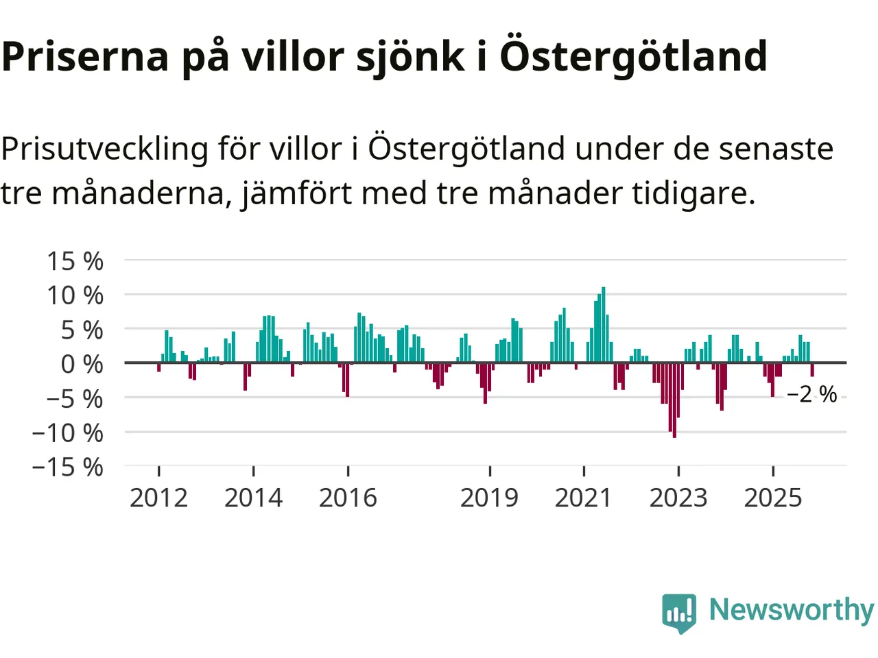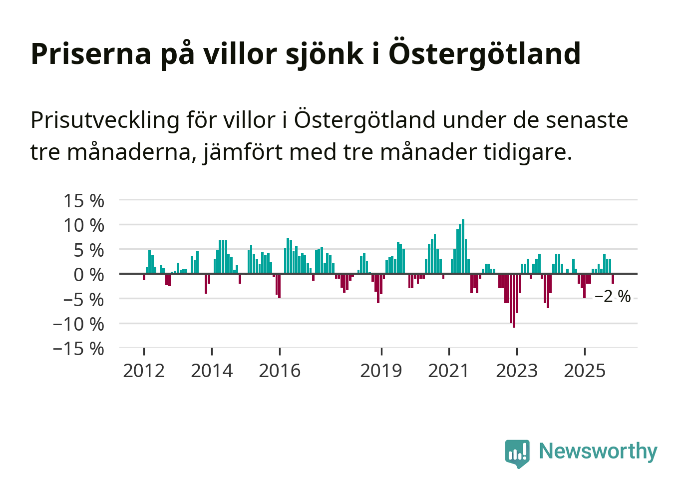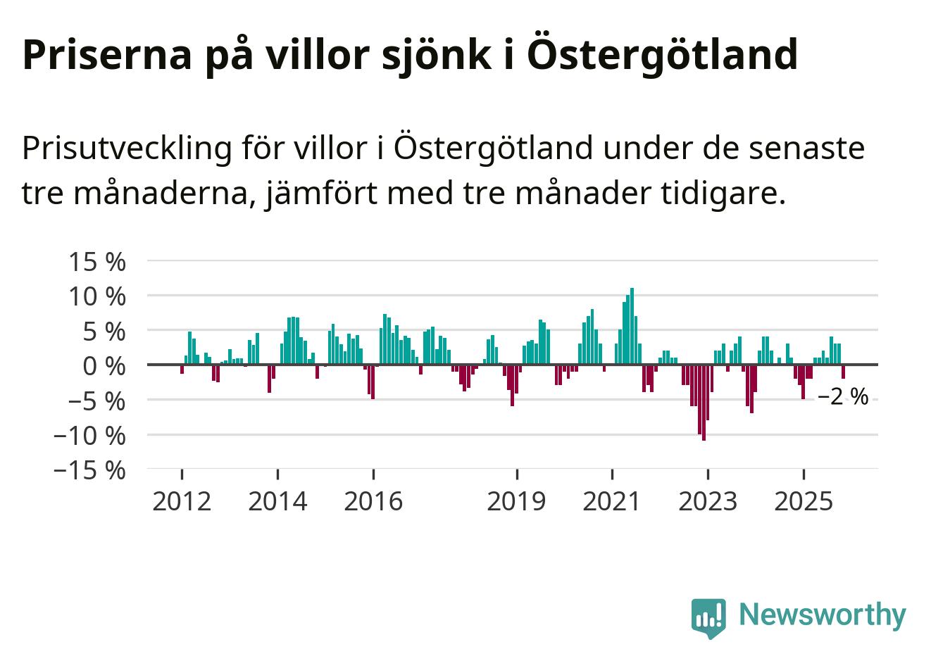 Statistiken visar även på en prisnedgång i Östergötlands län. Medelpriset på försäljningarna av villor i länet var 2 procent lägre än för tre månader sedan. Även i hela Sverige sjunker villapriserna. I hela riket noterades en prisnedgång på 2 procent.