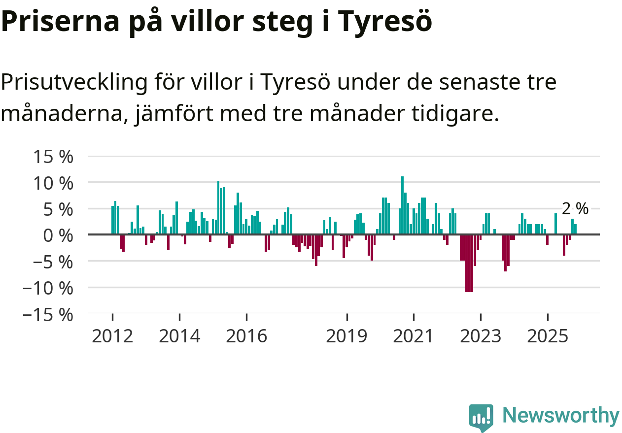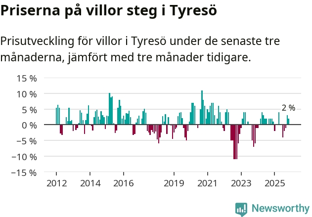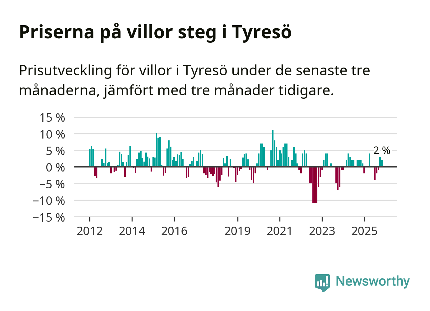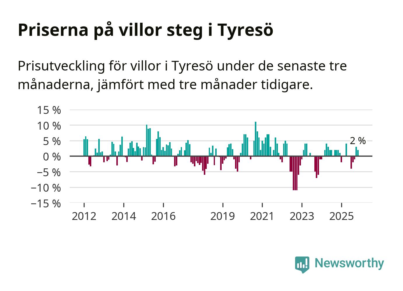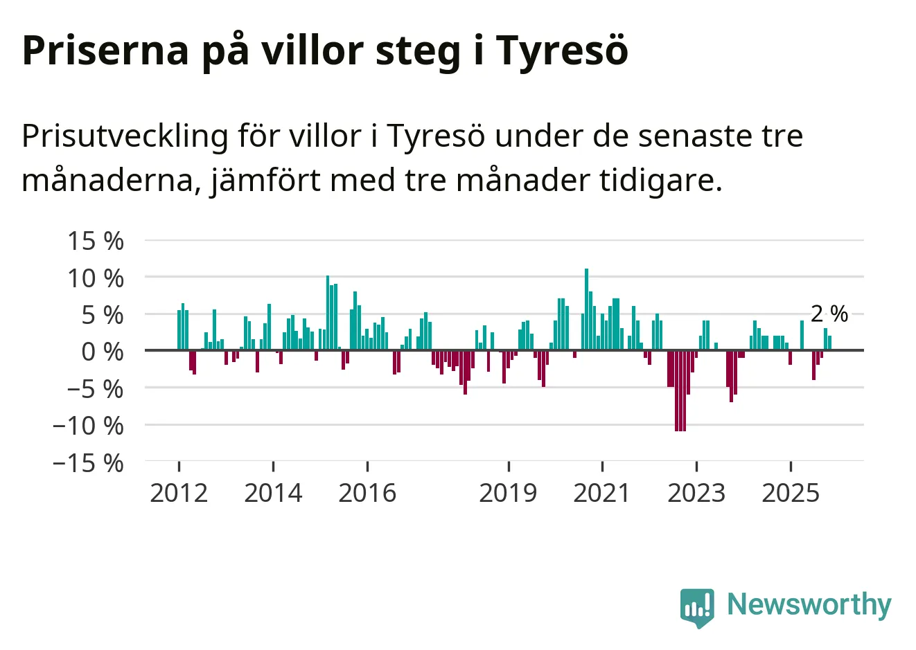 Villapriserna har gått upp i Tyresö kommun. Medelpriset på försäljningarna under de senaste tre månaderna visar på en uppgång med 2 procent.