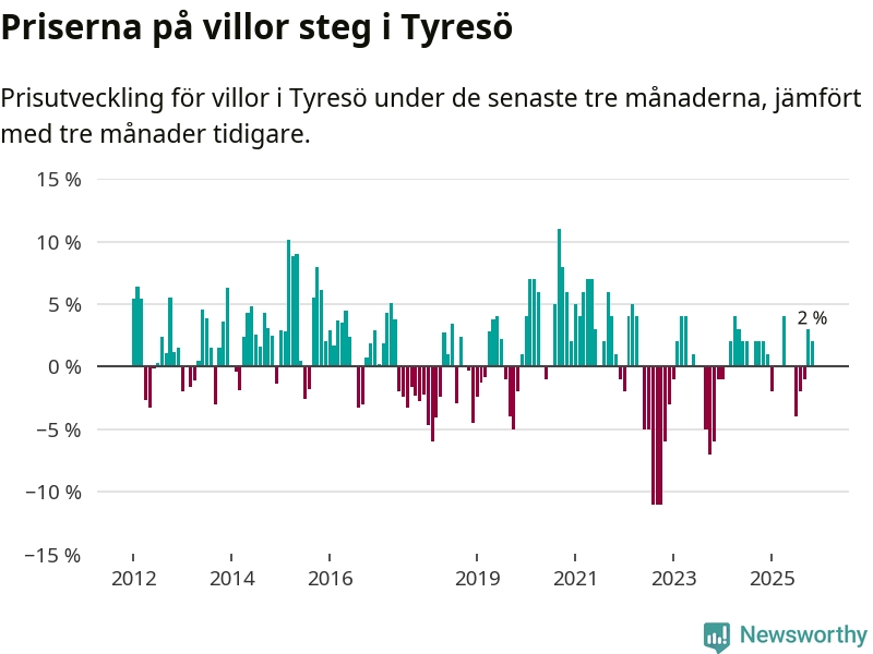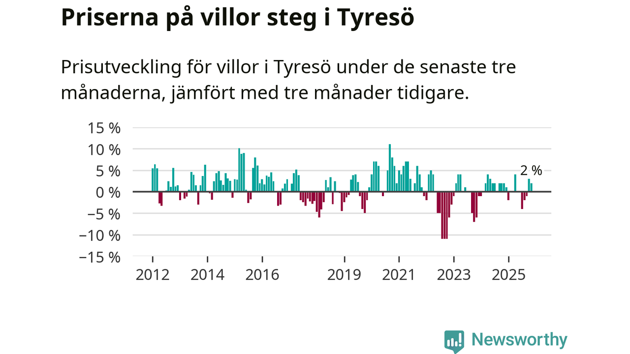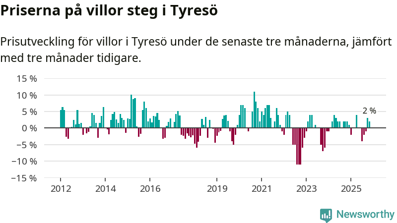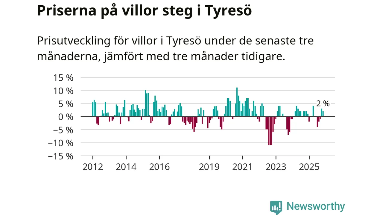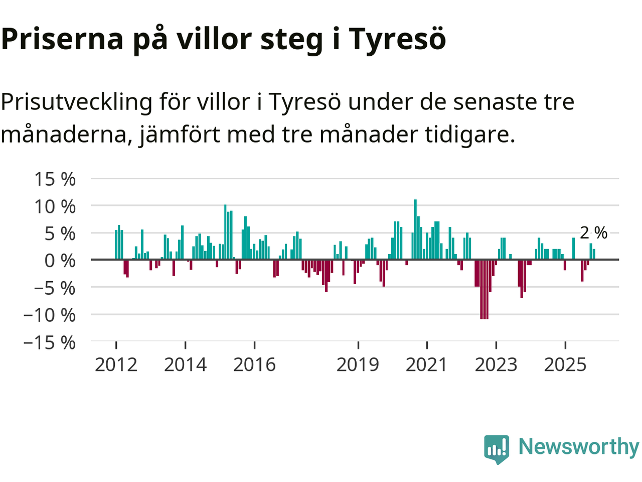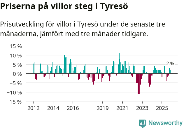 Villapriserna har gått upp i Tyresö kommun. Medelpriset på försäljningarna under de senaste tre månaderna visar på en uppgång med 2 procent.