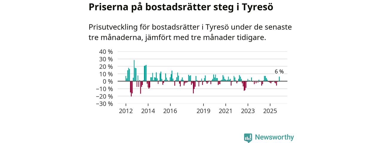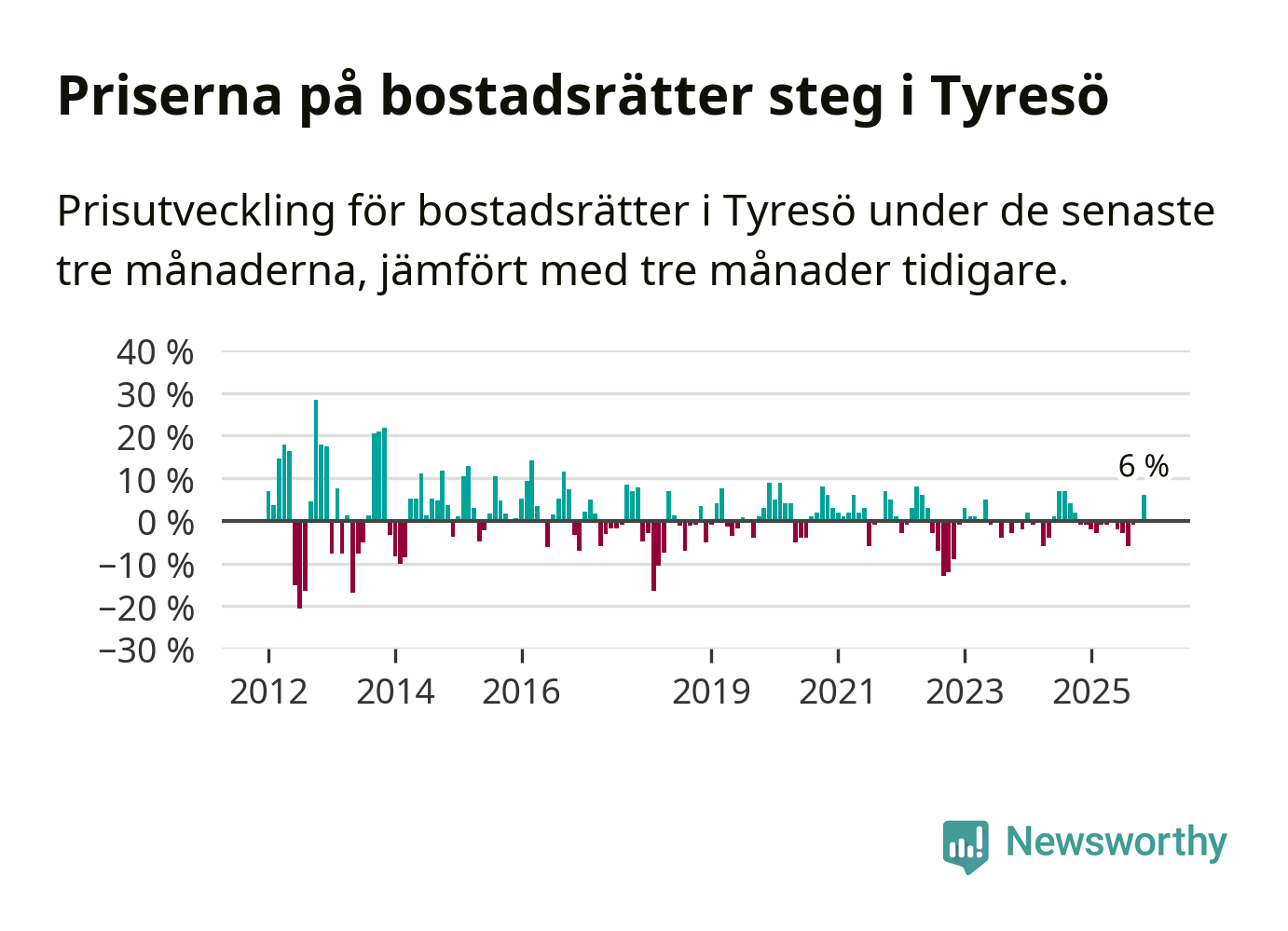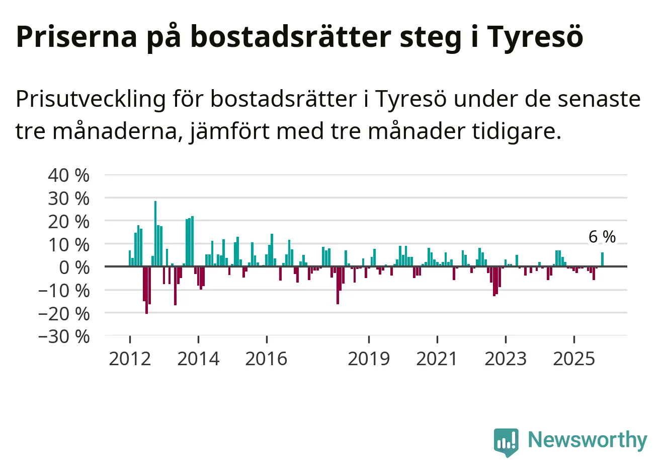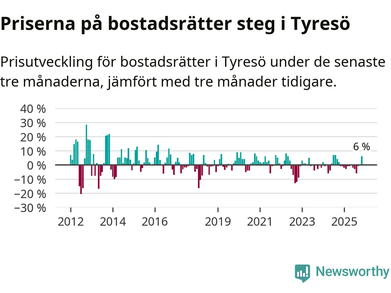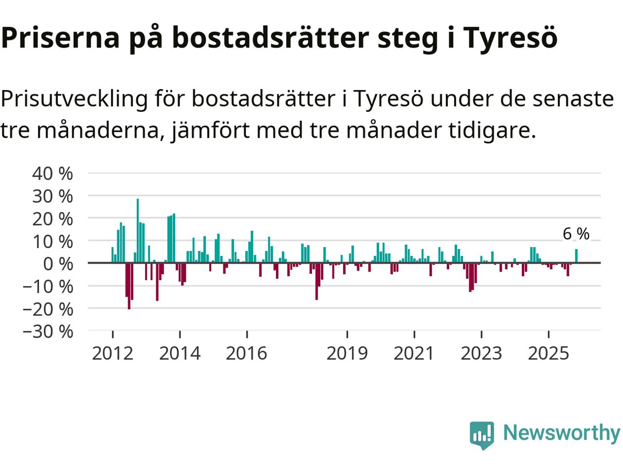 Priserna på bostadsrätter har gått upp i Tyresö kommun. Medelpriset på försäljningarna under de senaste tre månaderna visar på en uppgång med 6 procent.