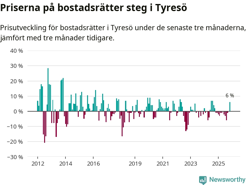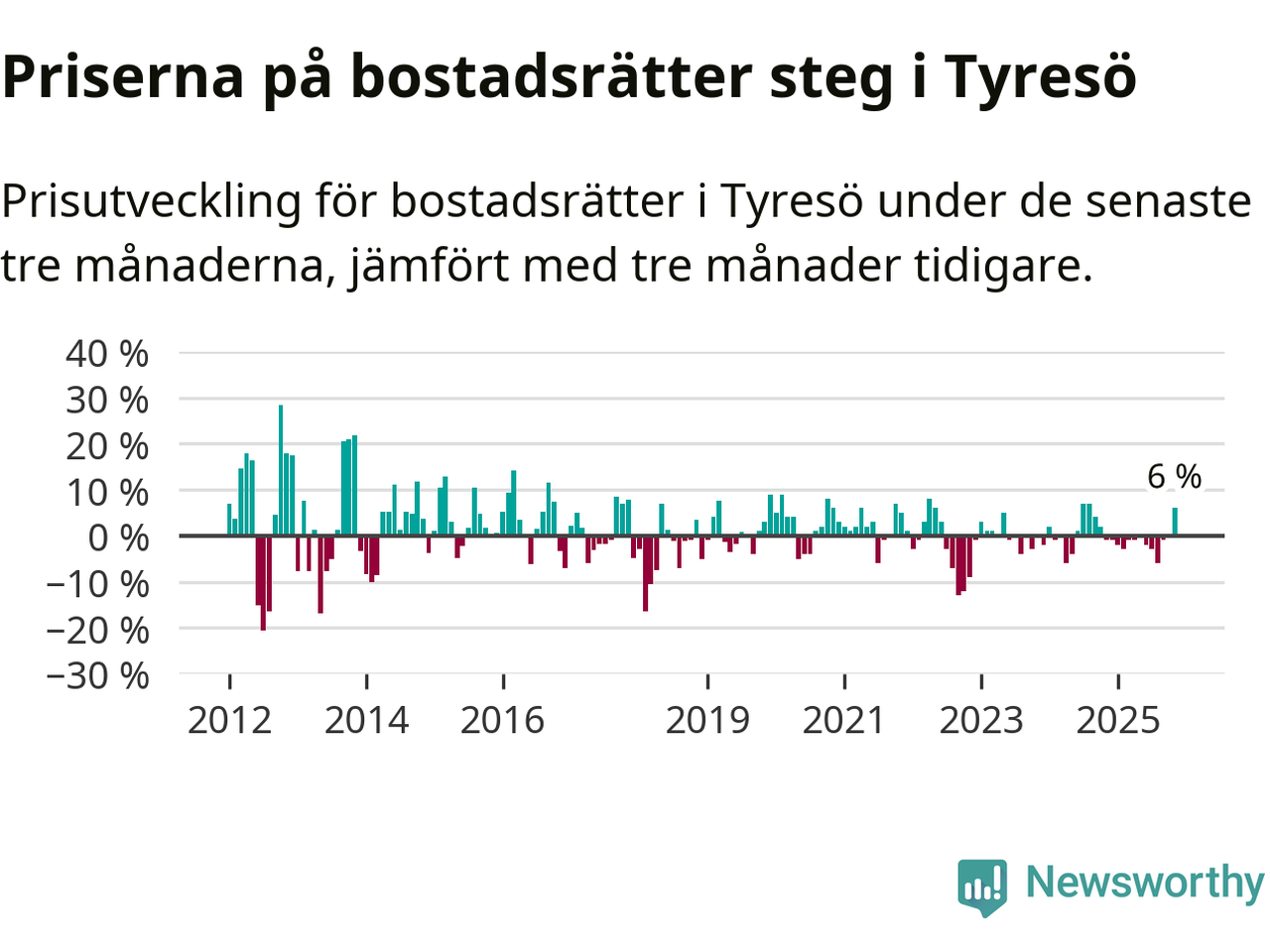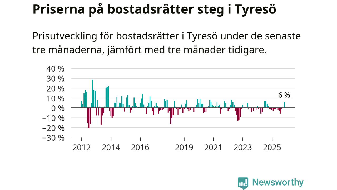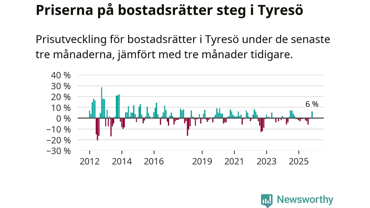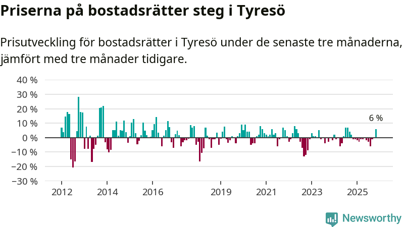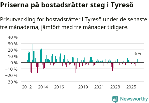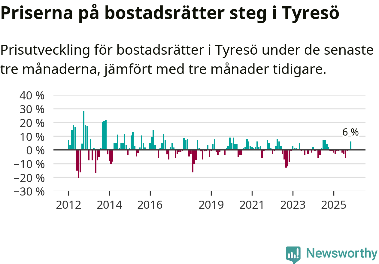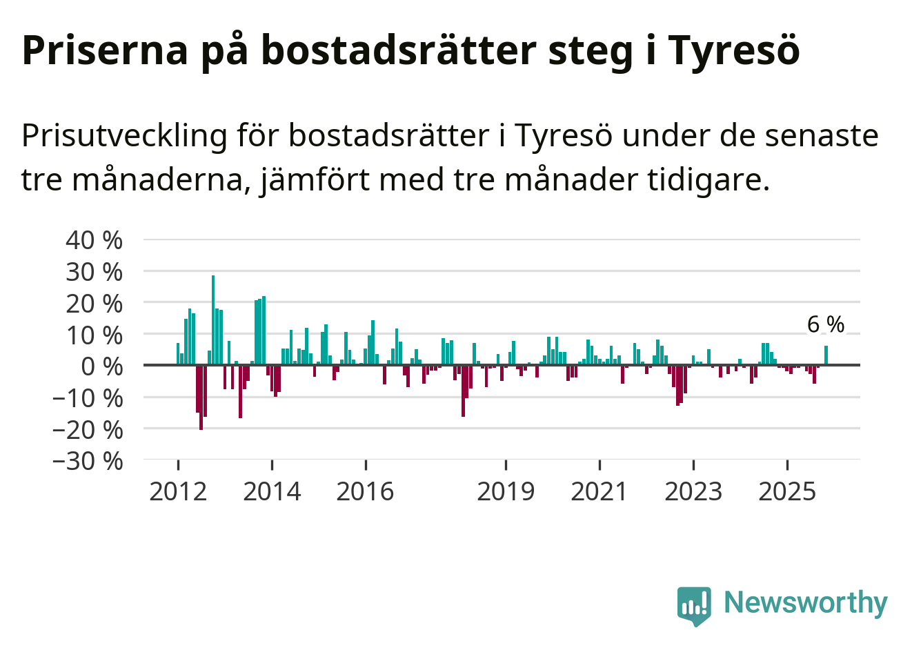 Priserna på bostadsrätter har gått upp i Tyresö kommun. Medelpriset på försäljningarna under de senaste tre månaderna visar på en uppgång med 6 procent.