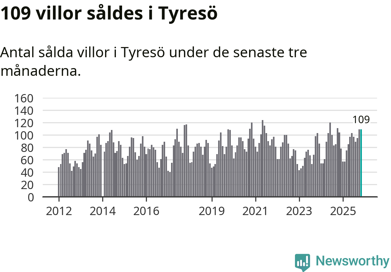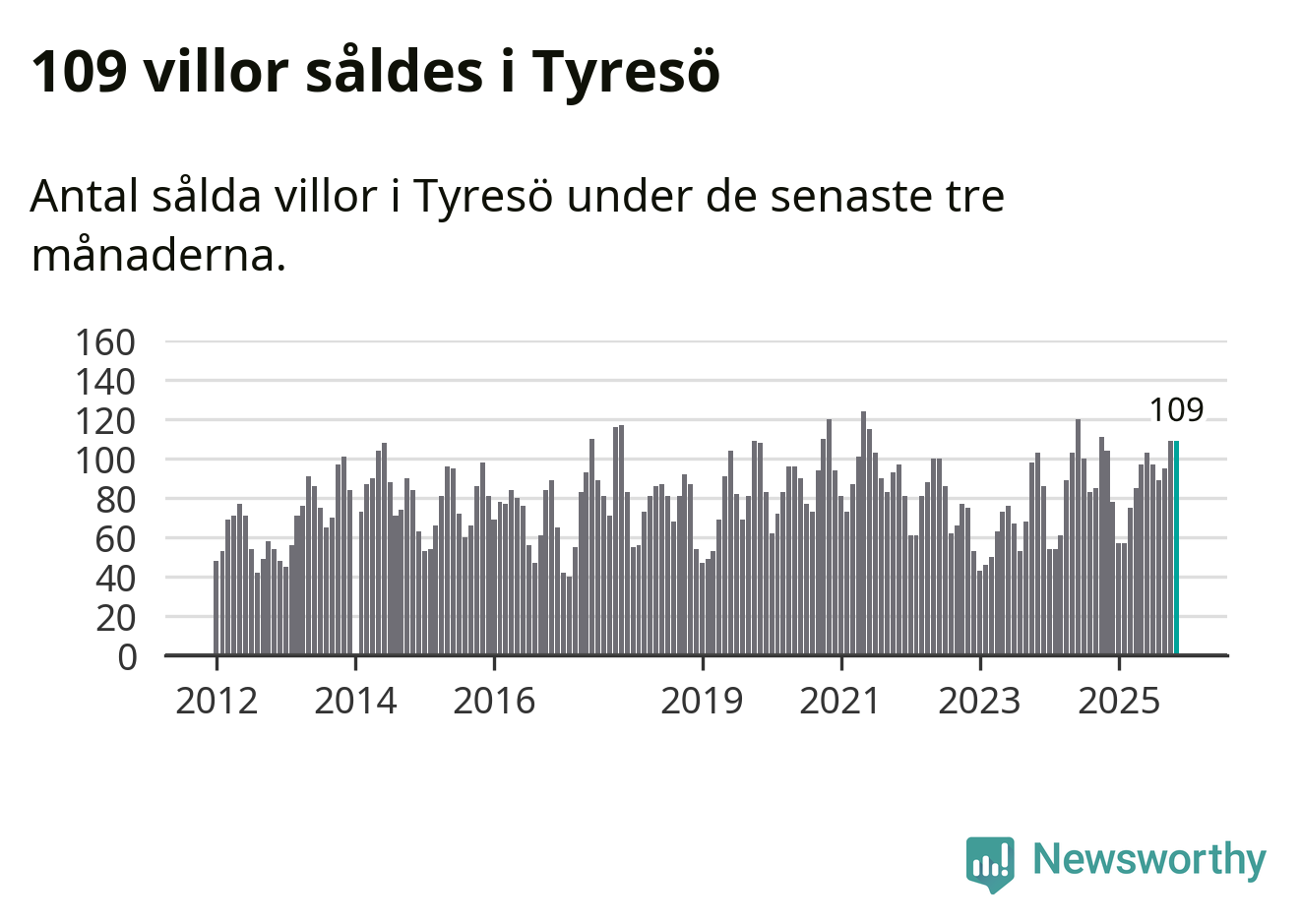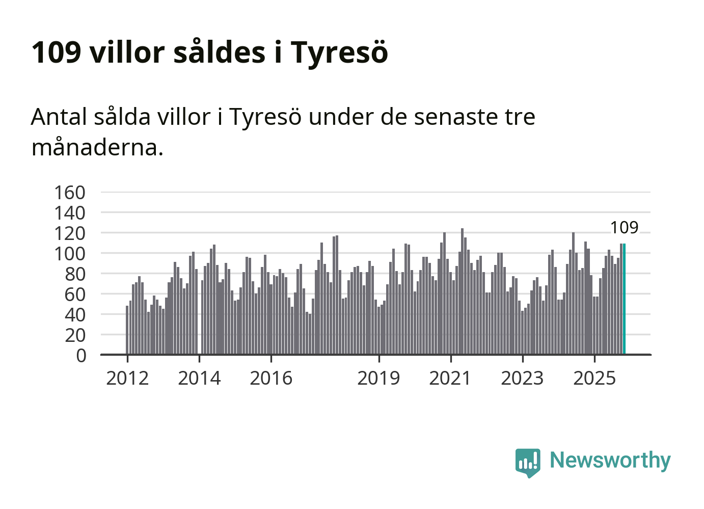 Sammanlagt såldes 109 villor i Tyresö kommun mellan september och november till ett genomsnittligt pris på 7,0 miljoner kronor. I fjol gjordes 104 affärer vid den här tiden på året.