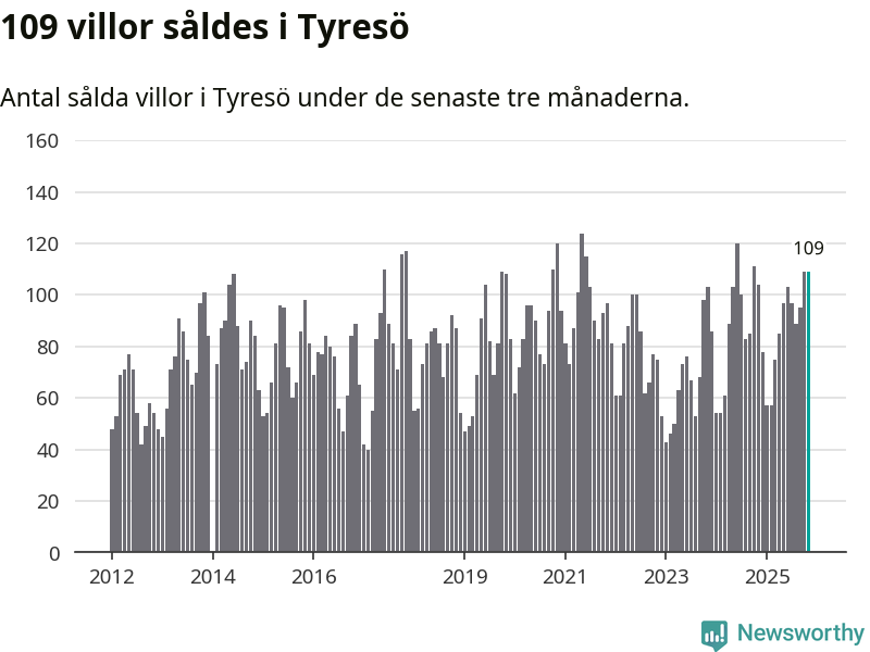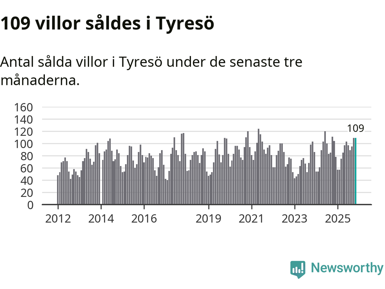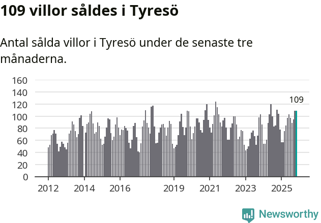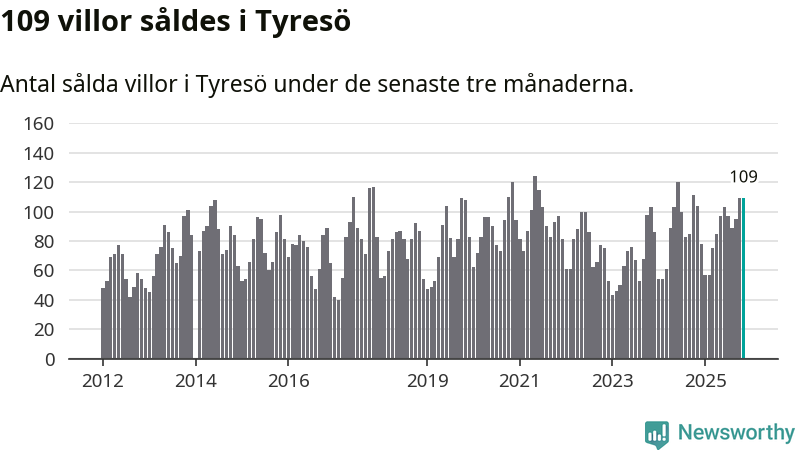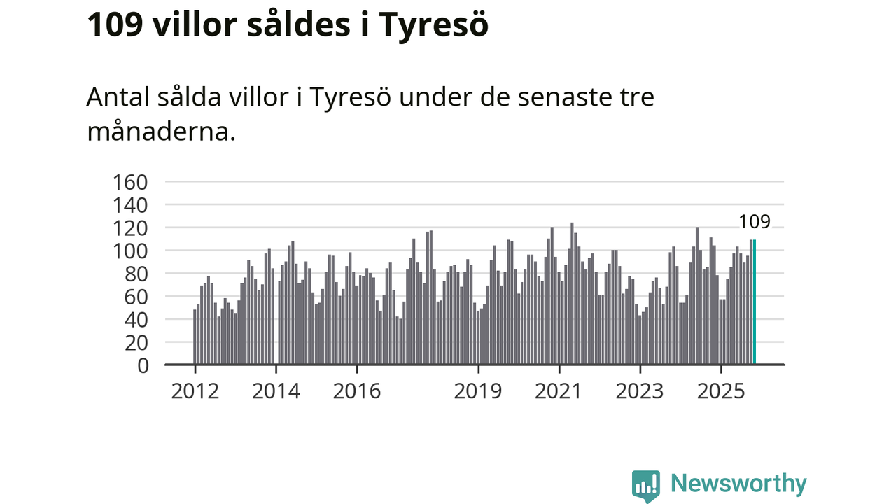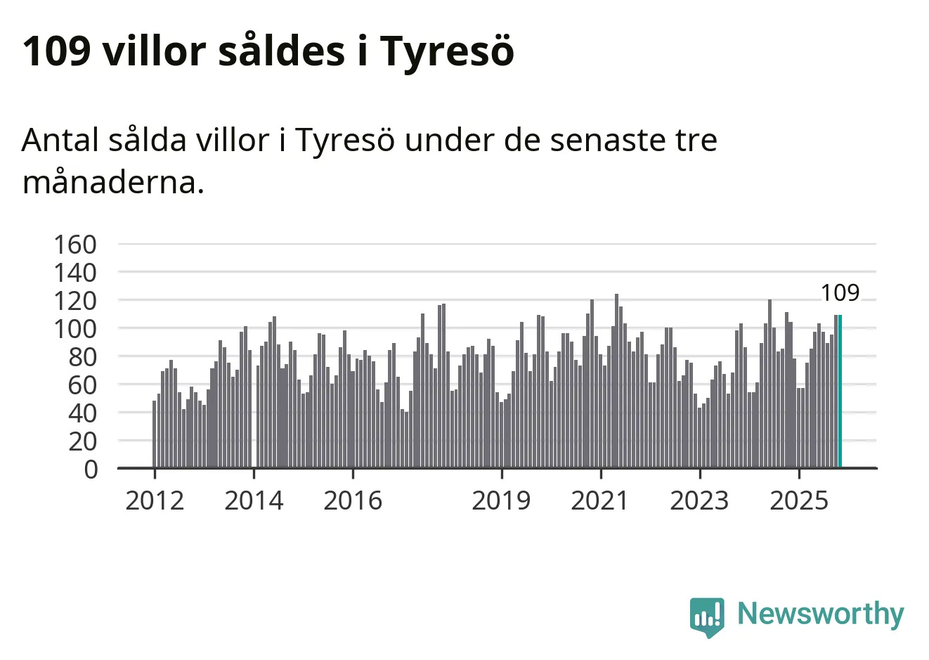 Sammanlagt såldes 109 villor i Tyresö kommun mellan september och november till ett genomsnittligt pris på 7,0 miljoner kronor. I fjol gjordes 104 affärer vid den här tiden på året.