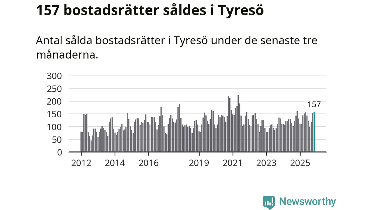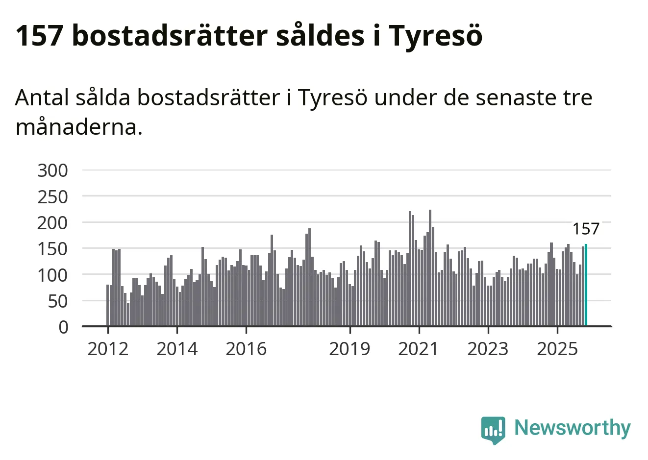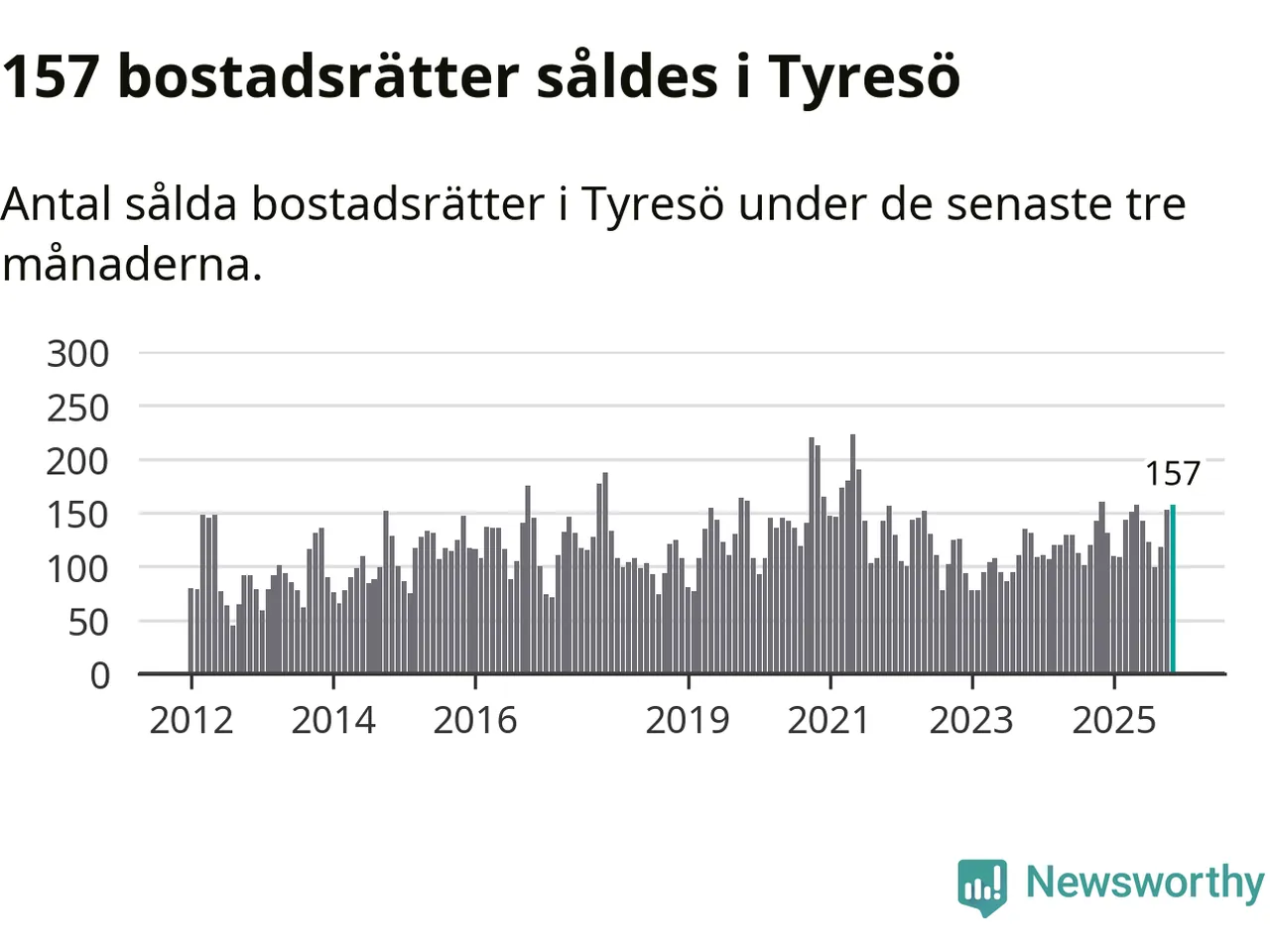 Sammanlagt såldes 157 bostadsrätter i Tyresö kommun mellan september och november till ett genomsnittligt pris på 2,8 miljoner kronor. I fjol gjordes 160 affärer vid den här tiden på året.