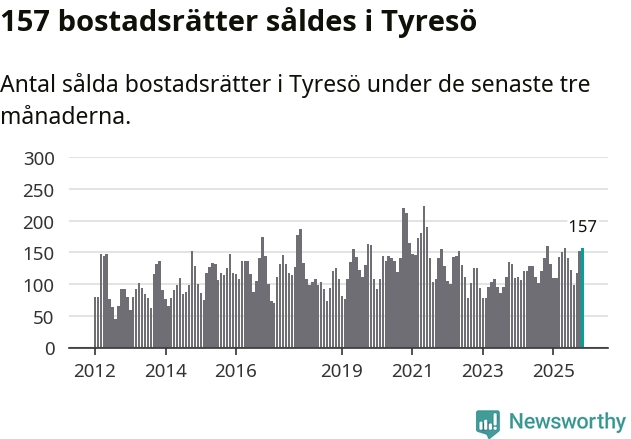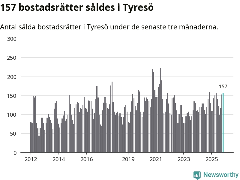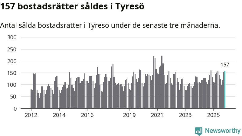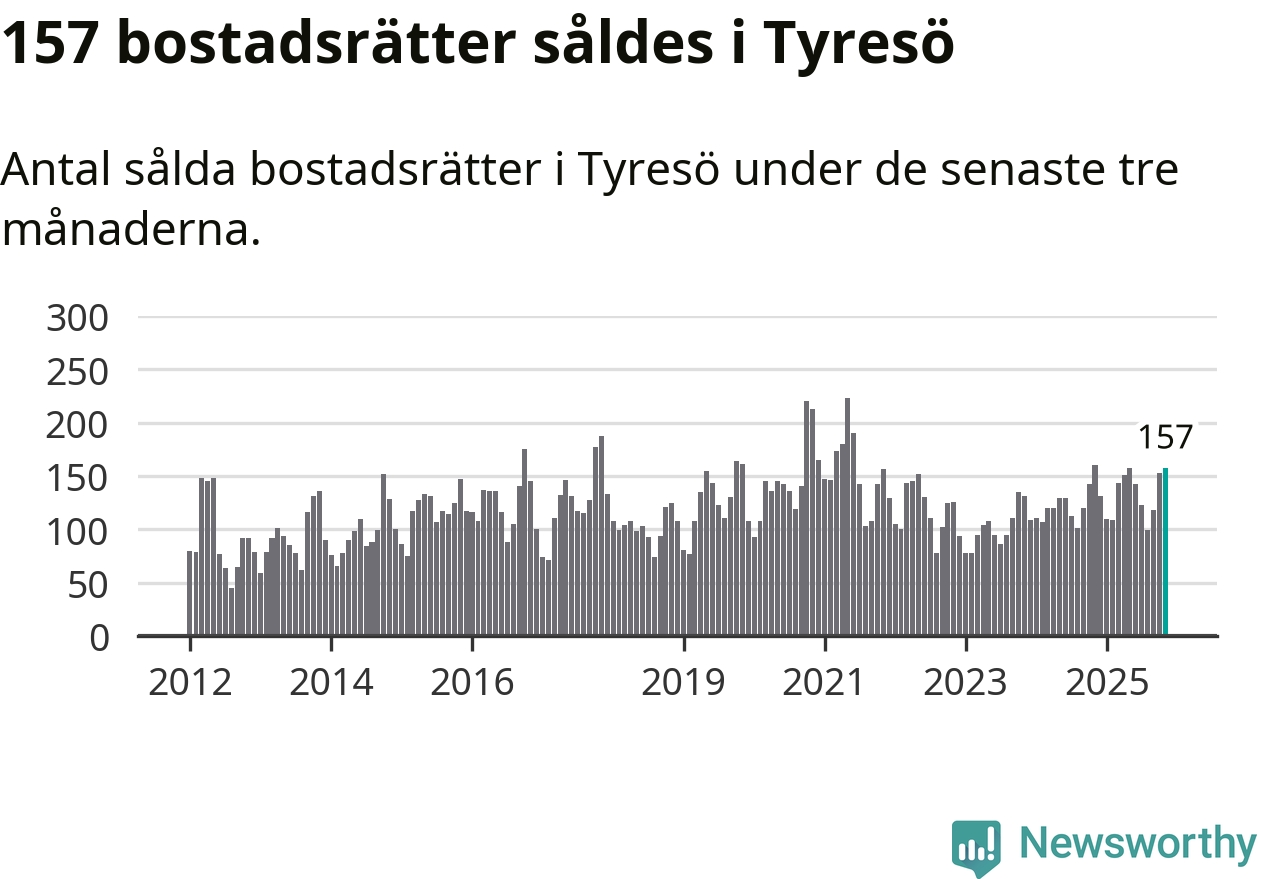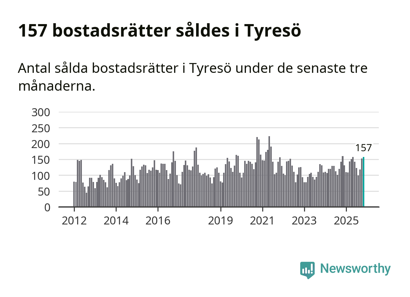Sammanlagt såldes 157 bostadsrätter i Tyresö kommun mellan september och november till ett genomsnittligt pris på 2,8 miljoner kronor. I fjol gjordes 160 affärer vid den här tiden på året.