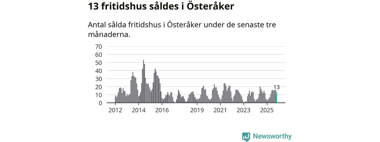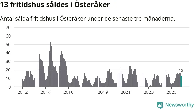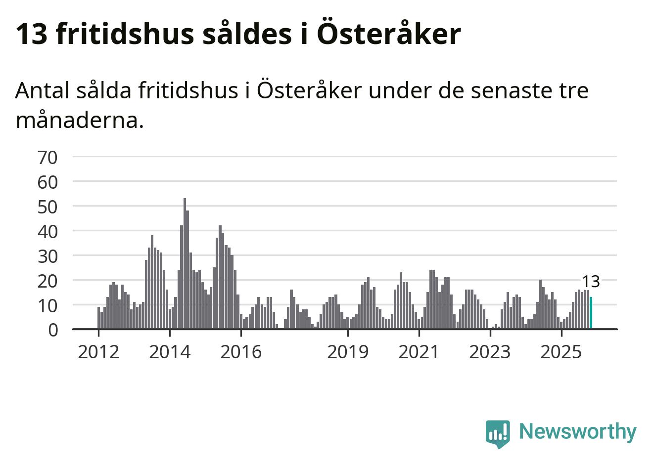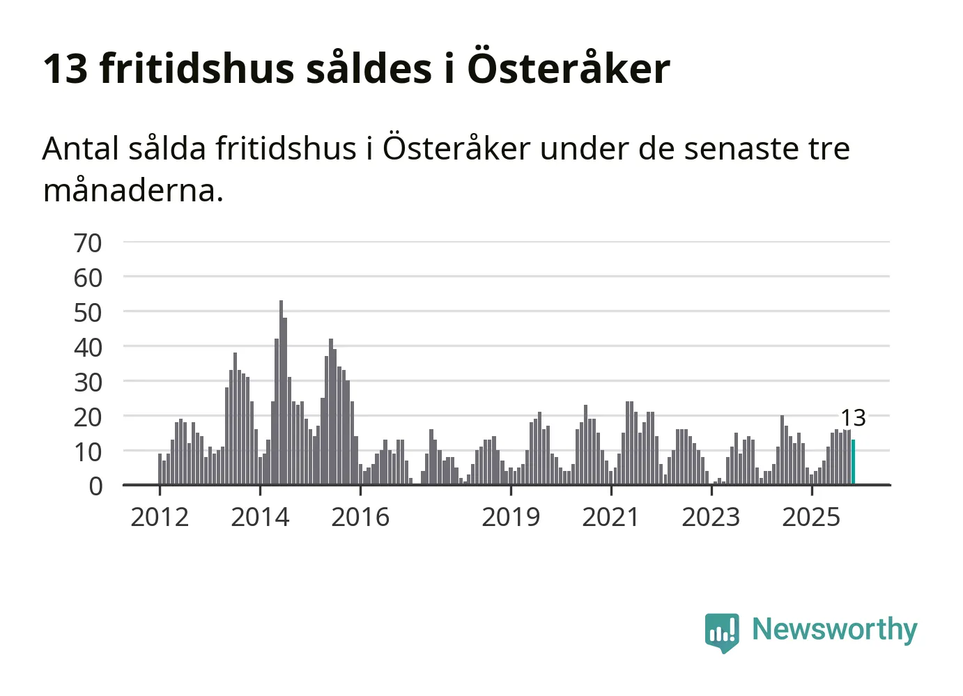 Sammanlagt såldes 13 fritidshus i Österåkers kommun mellan september och november till ett genomsnittligt pris på 5,6 miljoner kronor. I fjol gjordes tolv affärer vid den här tiden på året.