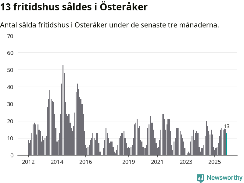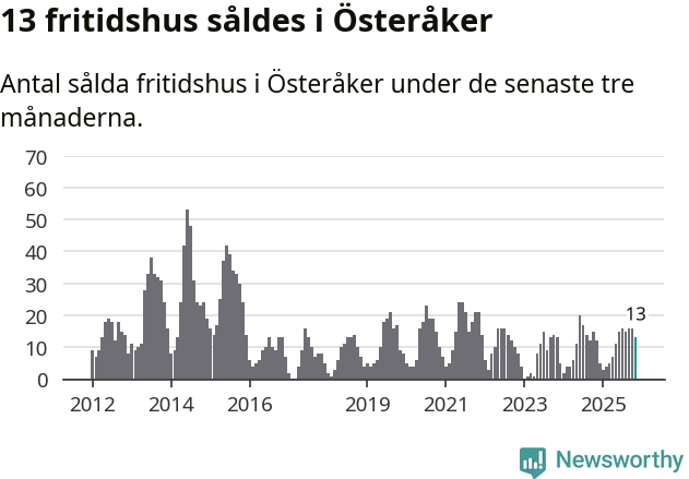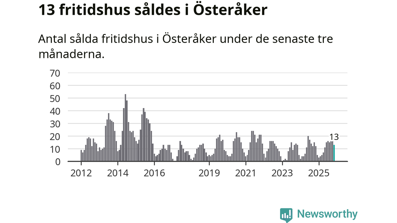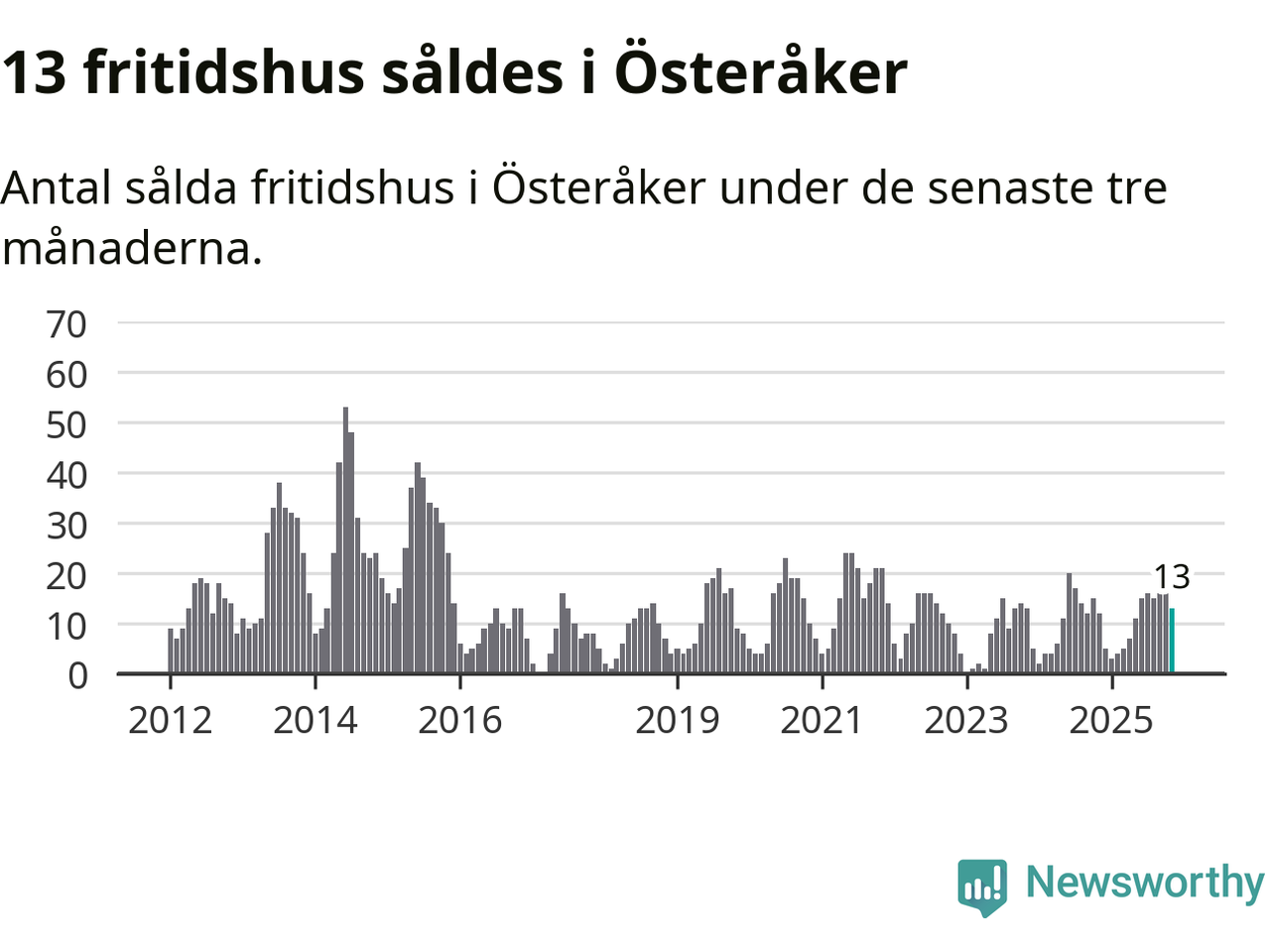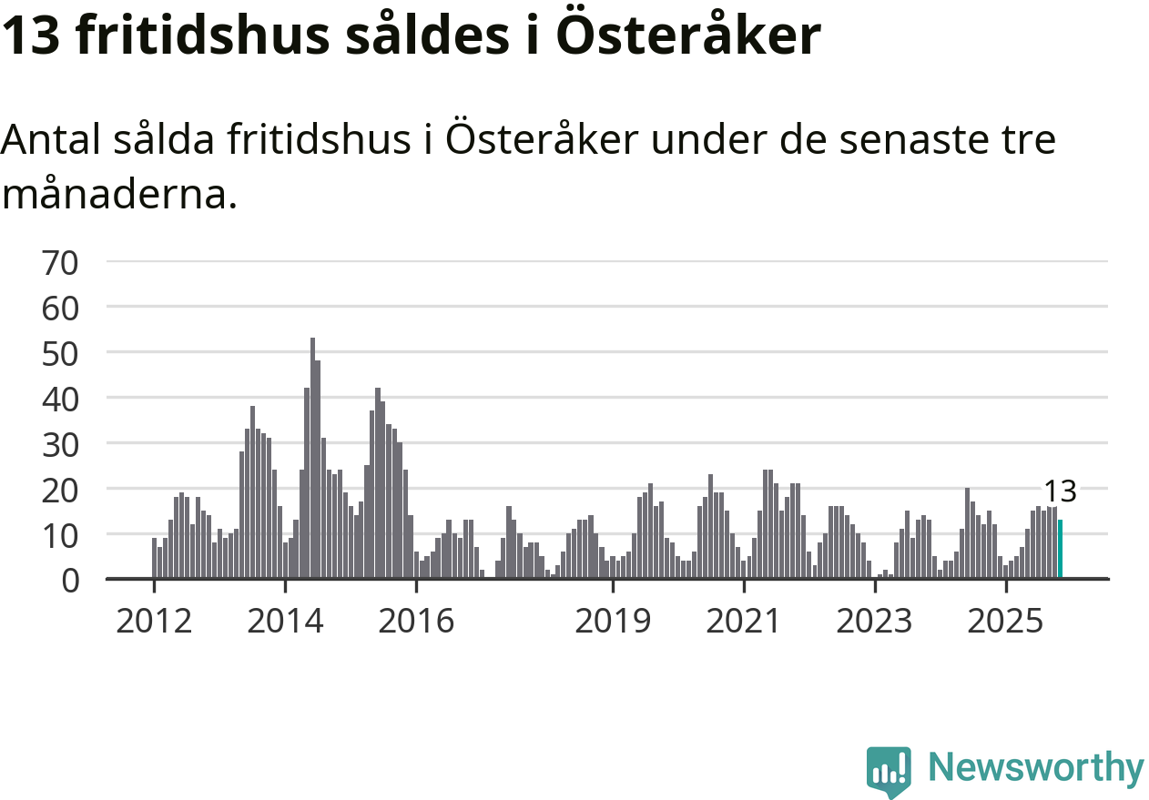 Sammanlagt såldes 13 fritidshus i Österåkers kommun mellan september och november till ett genomsnittligt pris på 5,6 miljoner kronor. I fjol gjordes tolv affärer vid den här tiden på året.
