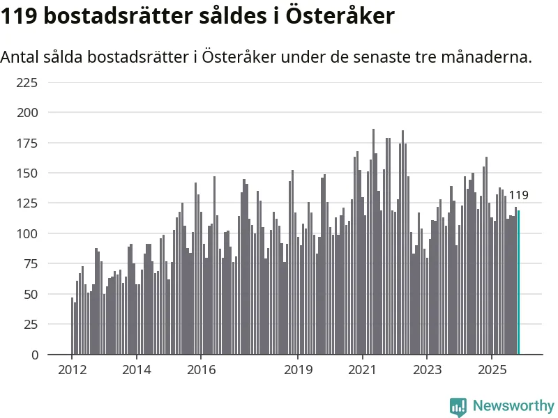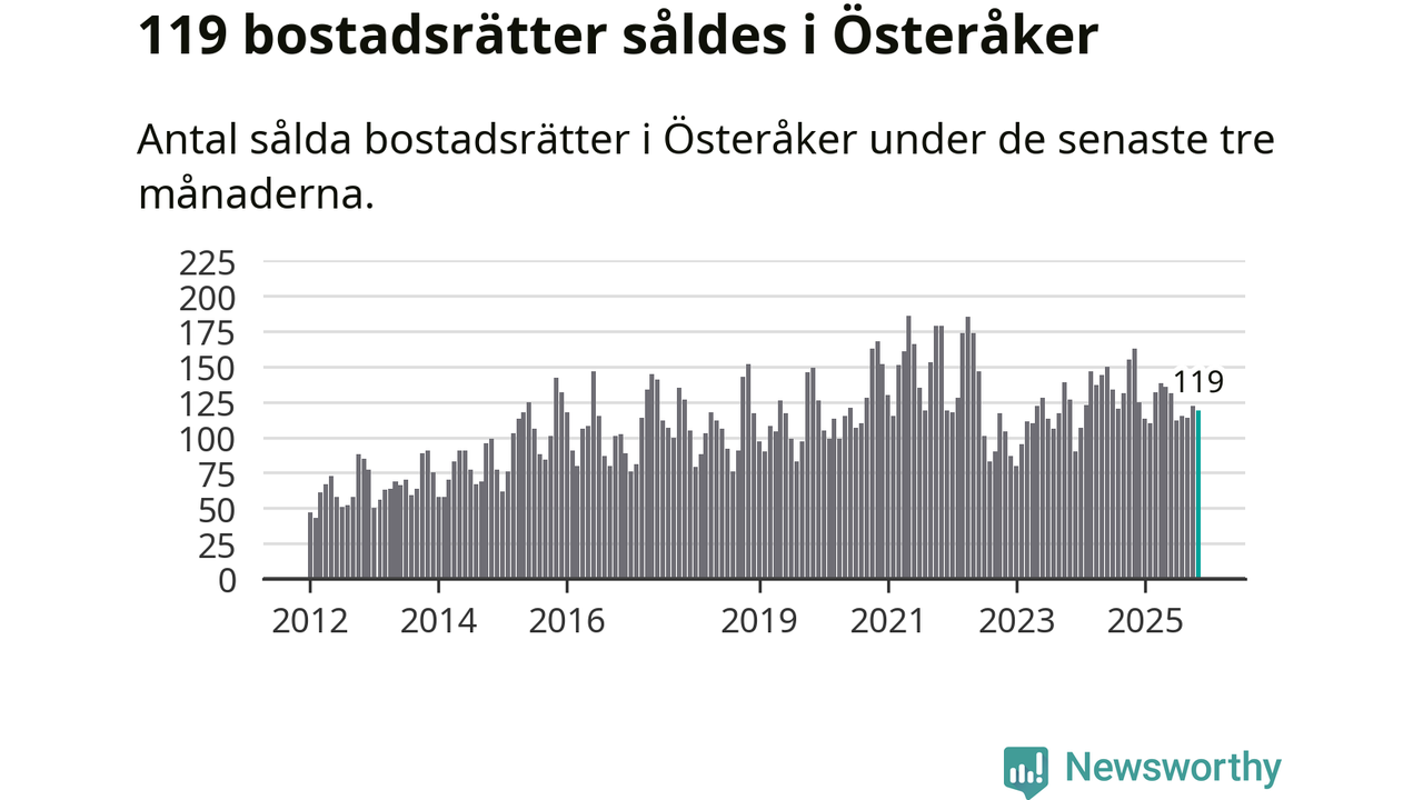 Mellan september och november såldes 119 bostadsrätter i Österåkers kommun. Det är relativt få sett till aktiviteten på bostadsmarknaden i kommunen under de senaste tolv månaderna, samt det historiska snittet för den här tiden på året.
